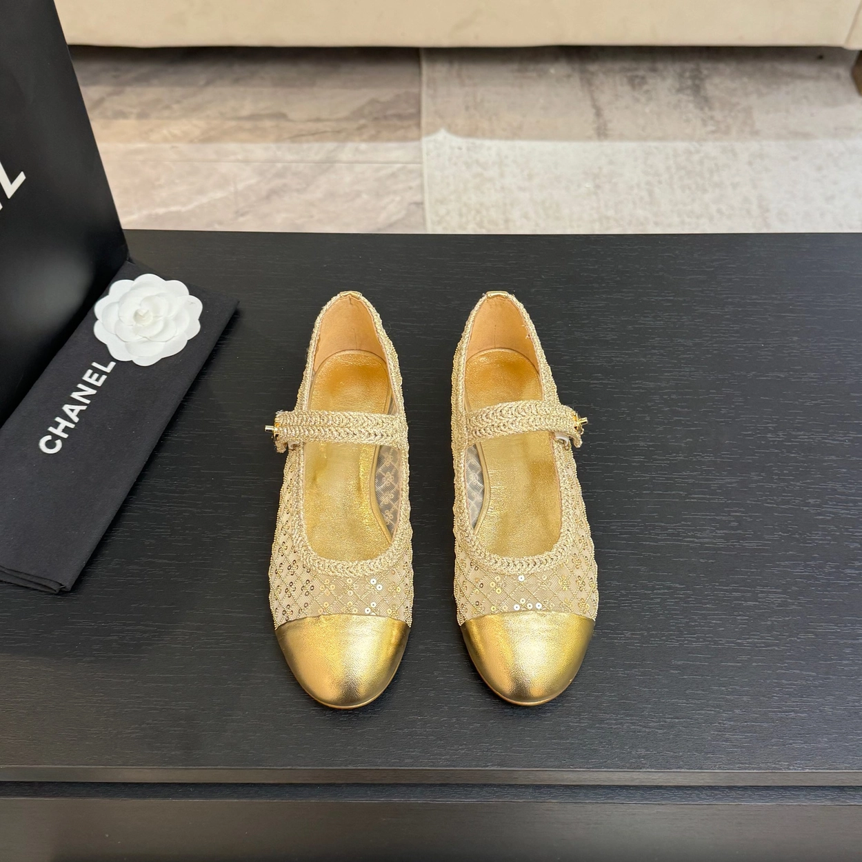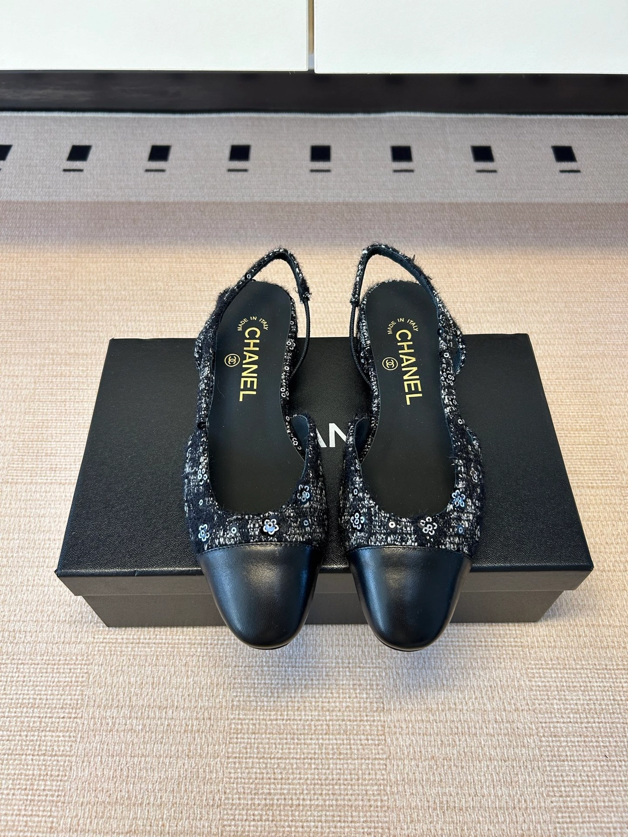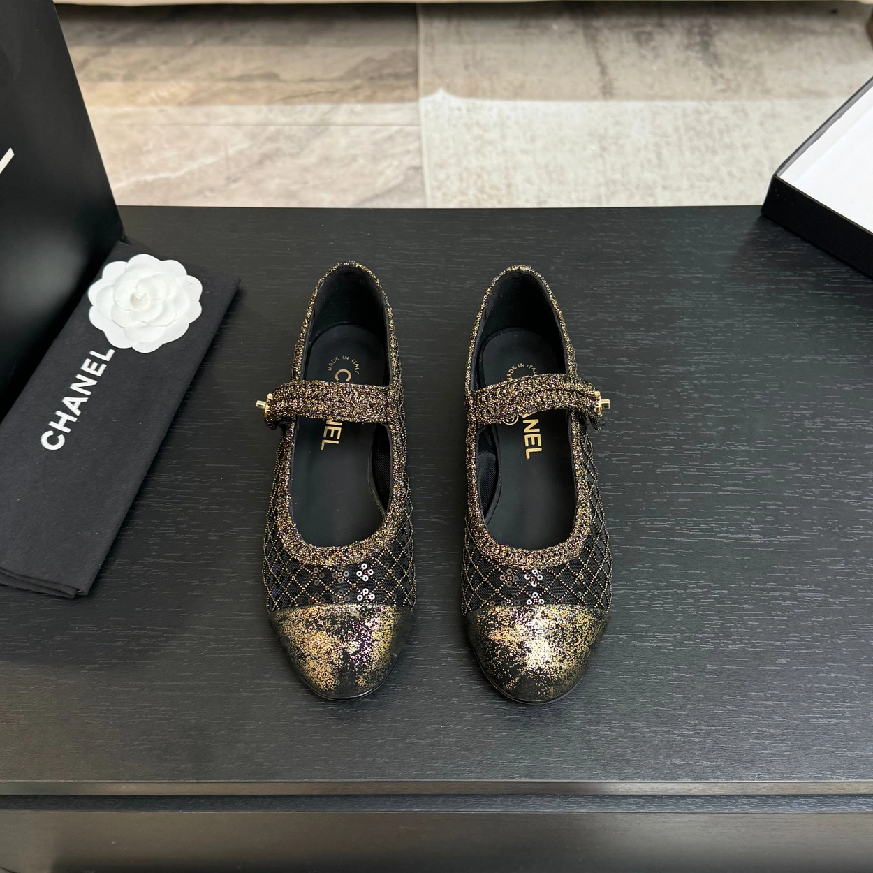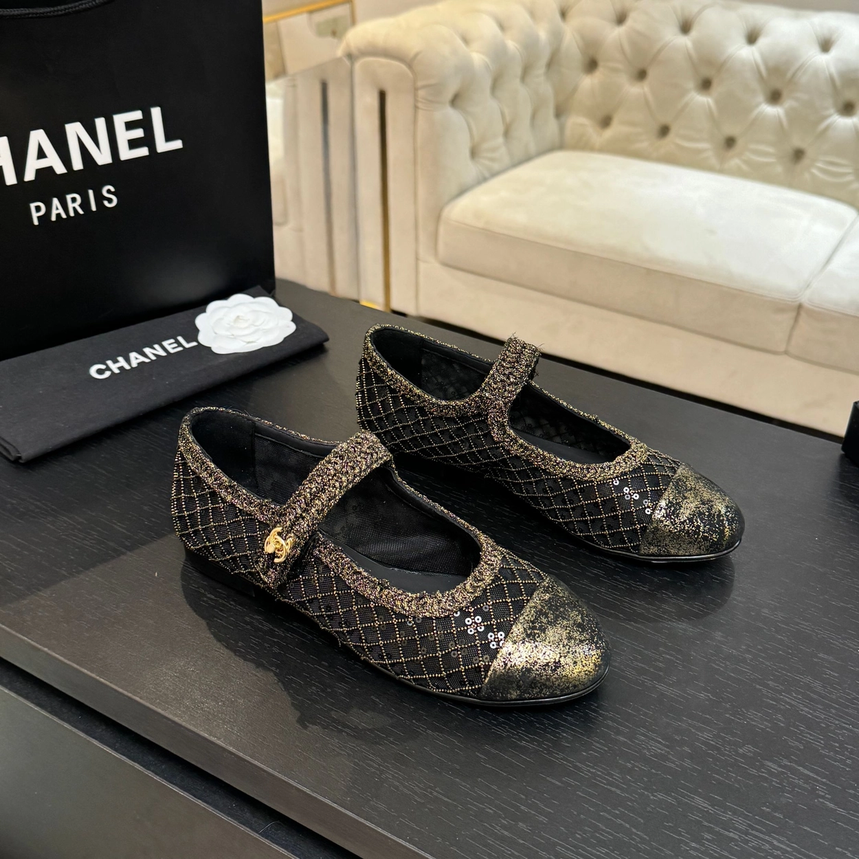 샤넬(CHANEL) 위빙 스팽글 메리제인 플랫 신발