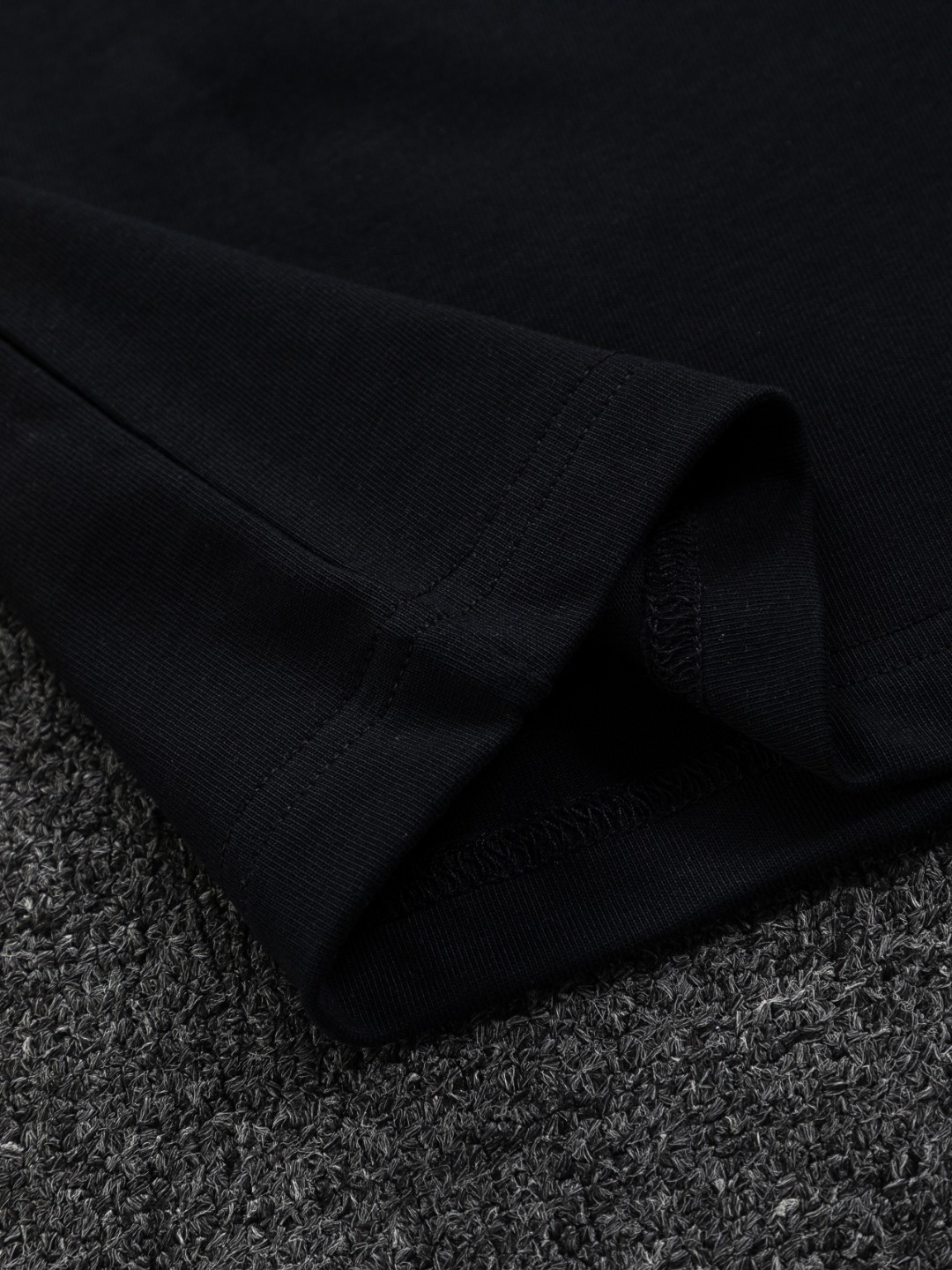 디테일: 가슴 부분 입체 삼각 메탈 로고와 자수 레터링 디테일, 립 조직 라운드 넥 마감으로 안정적인 넥라인 유지.