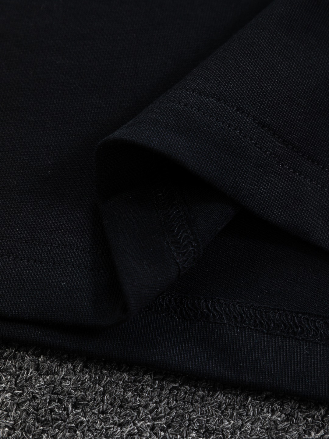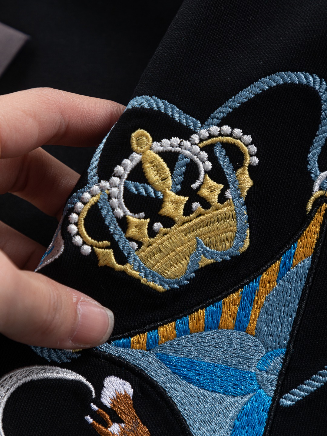 디테일: 가슴 부분 크라운·리본·실드 모티브 자수 로고 디테일, 촘촘한 립 조직 라운드 넥 마감으로 안정적인 넥라인 유지.
