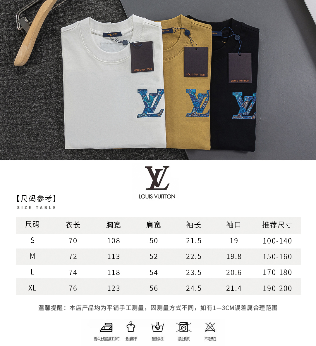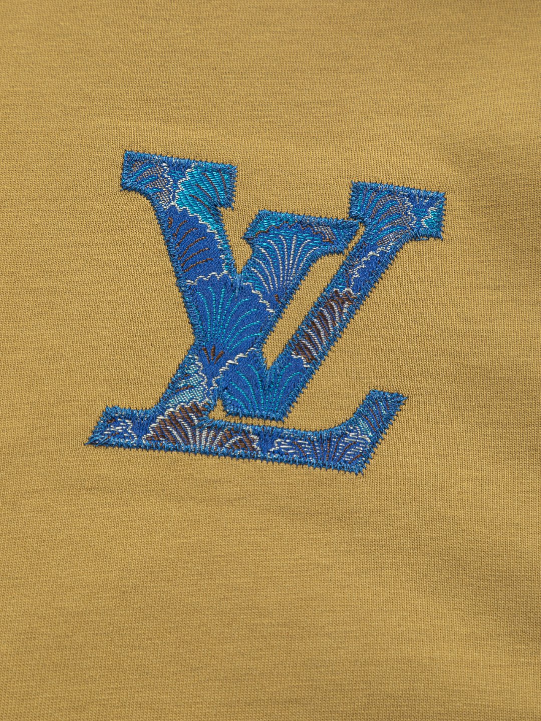 디테일: 가슴 부분 클라우드 모티브 새틴 LV 자수 로고, 후면 클라우드 대형 LV 자수 디테일, 촘촘한 립 조직 라운드 넥 마감으로 안정적인 넥라인 유지.