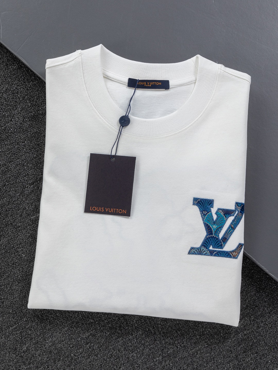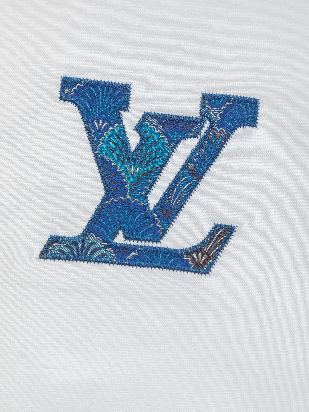 디테일: 가슴 부분 클라우드 모티브 새틴 LV 자수 로고, 후면 클라우드 대형 LV 자수 디테일, 촘촘한 립 조직 라운드 넥 마감으로 안정적인 넥라인 유지.