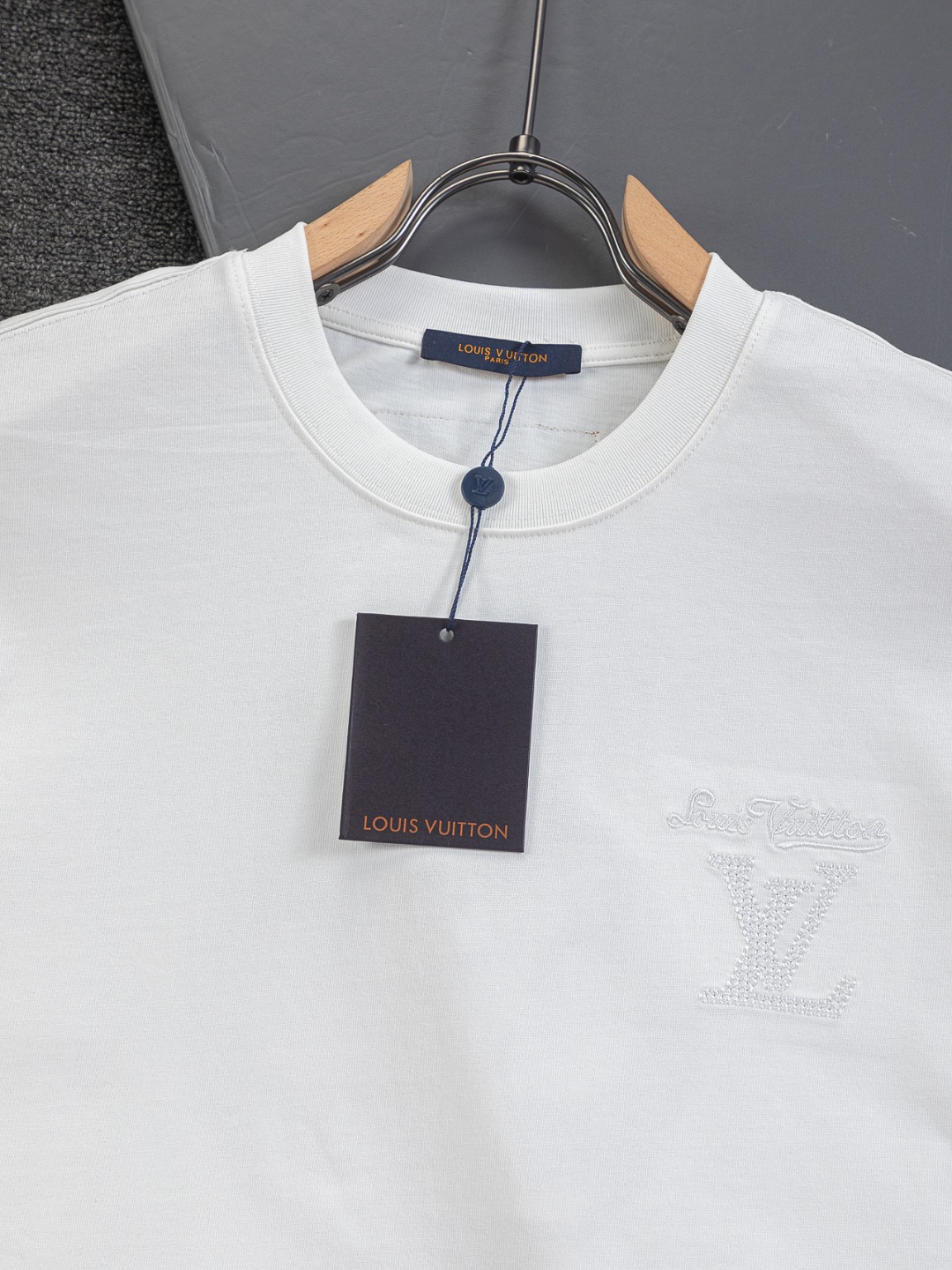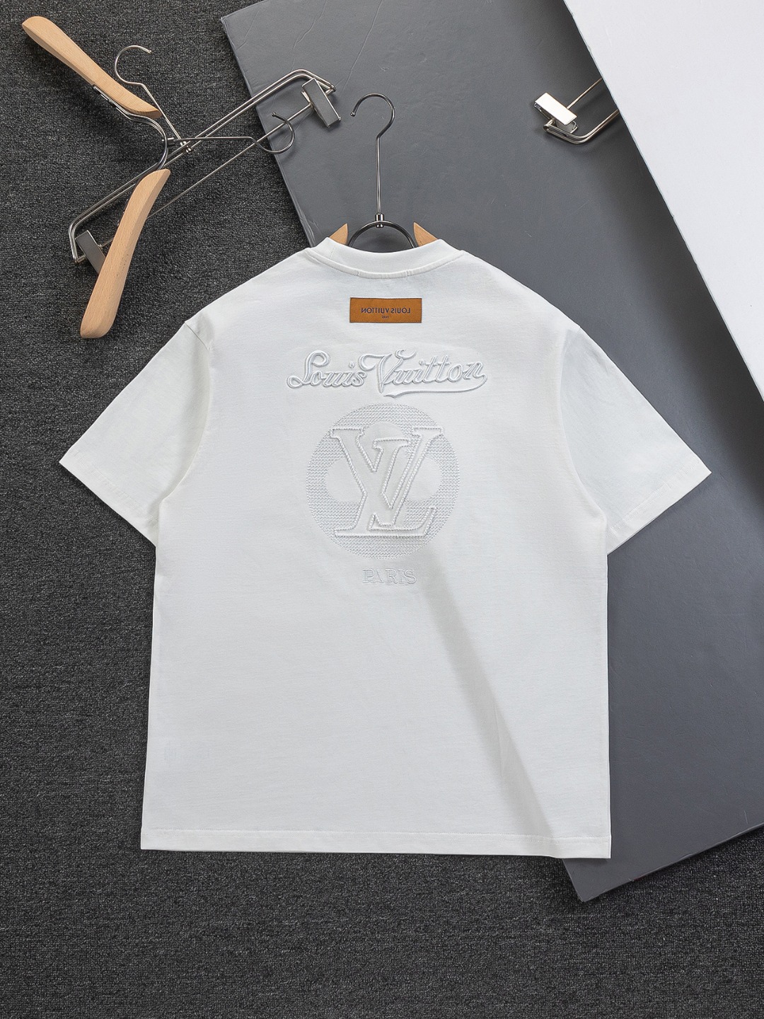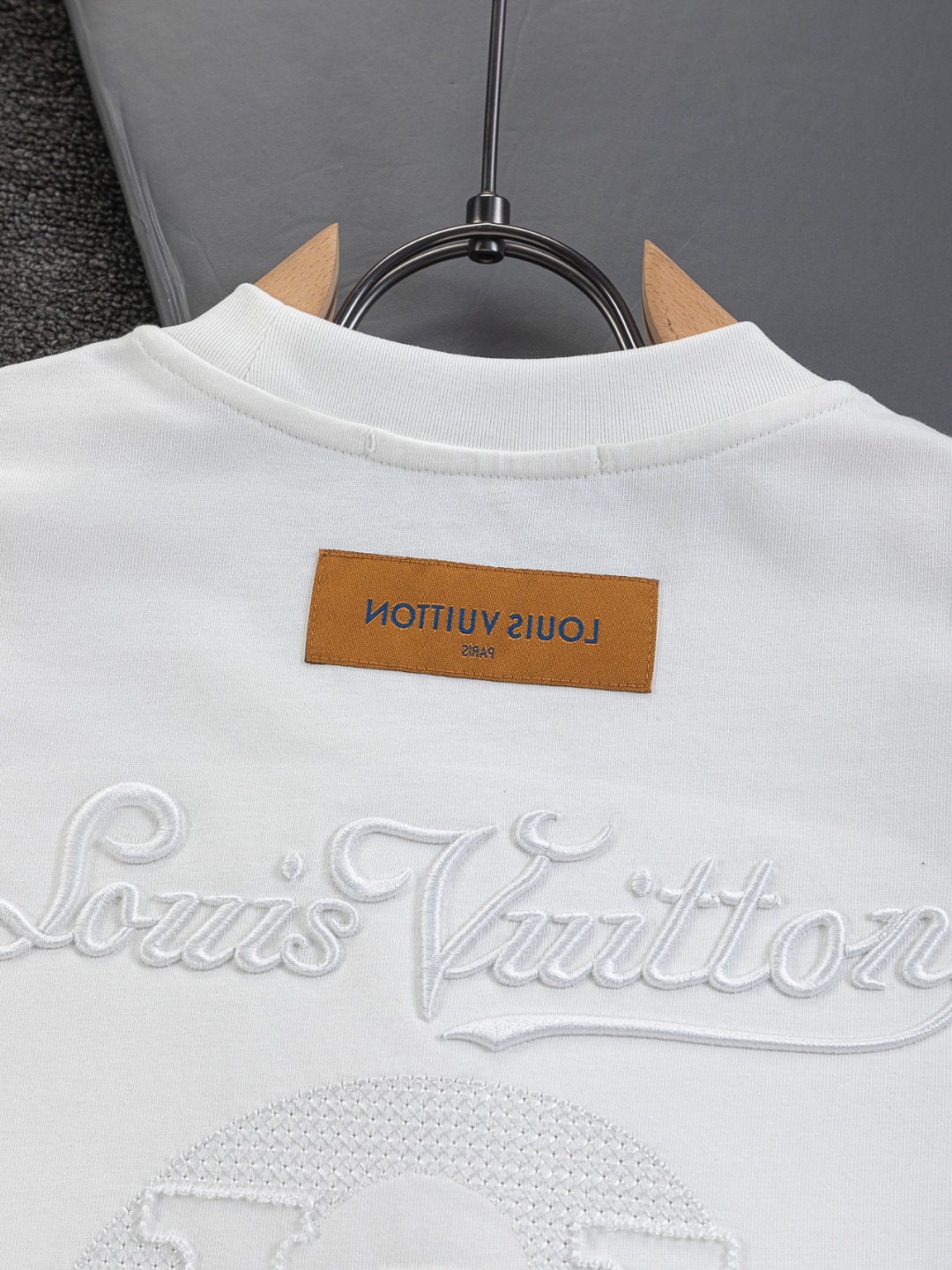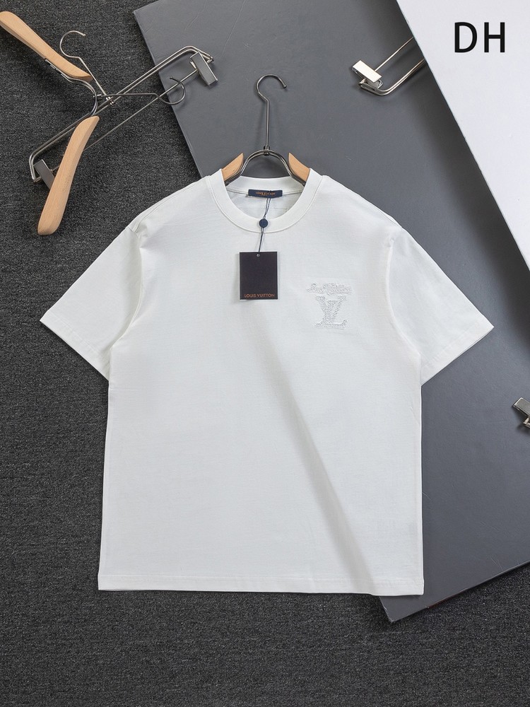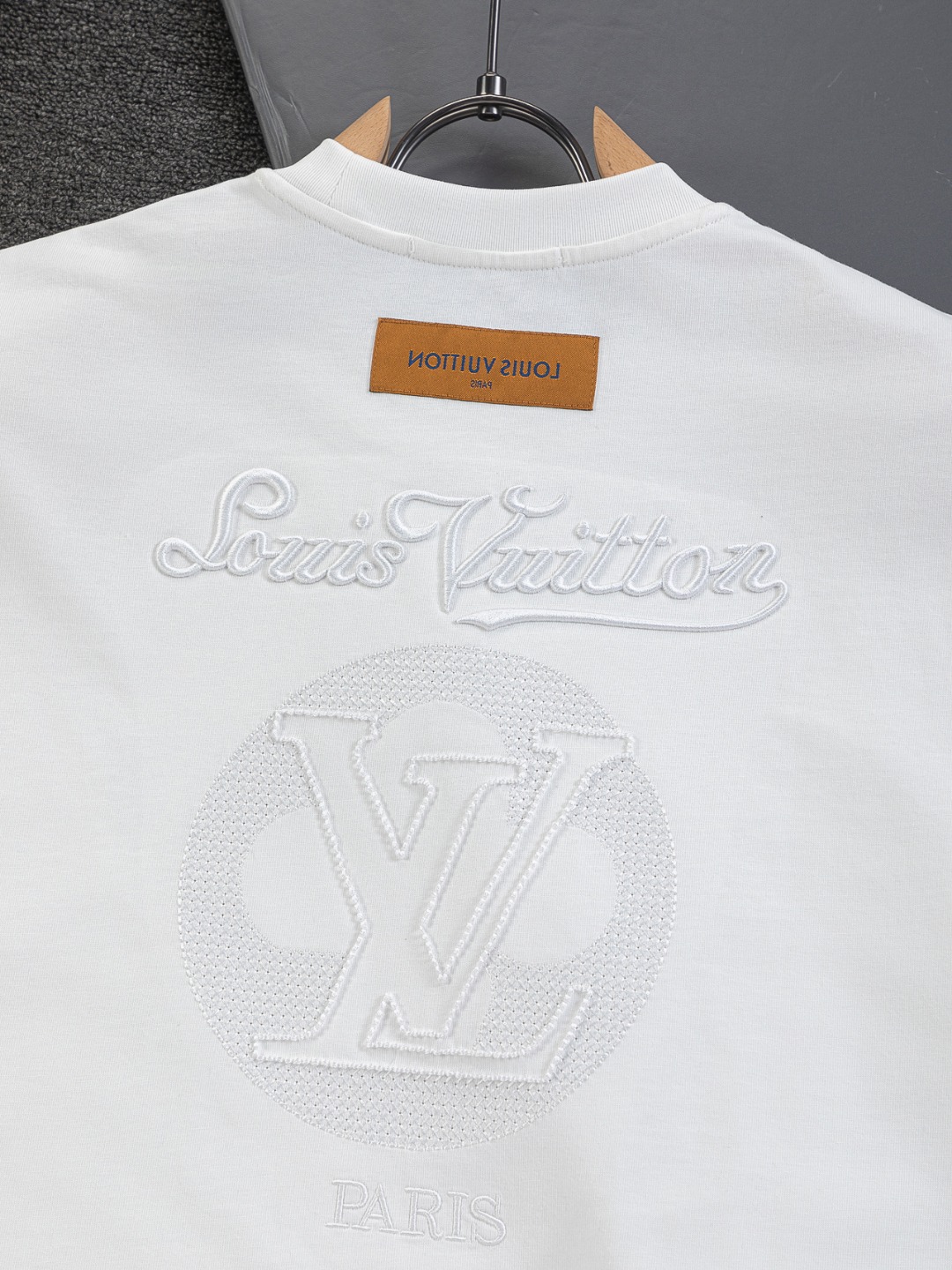 "전면 심플 LV 자수와 후면 컷아웃 레터링 자수가 포인트인 반팔 티셔츠"