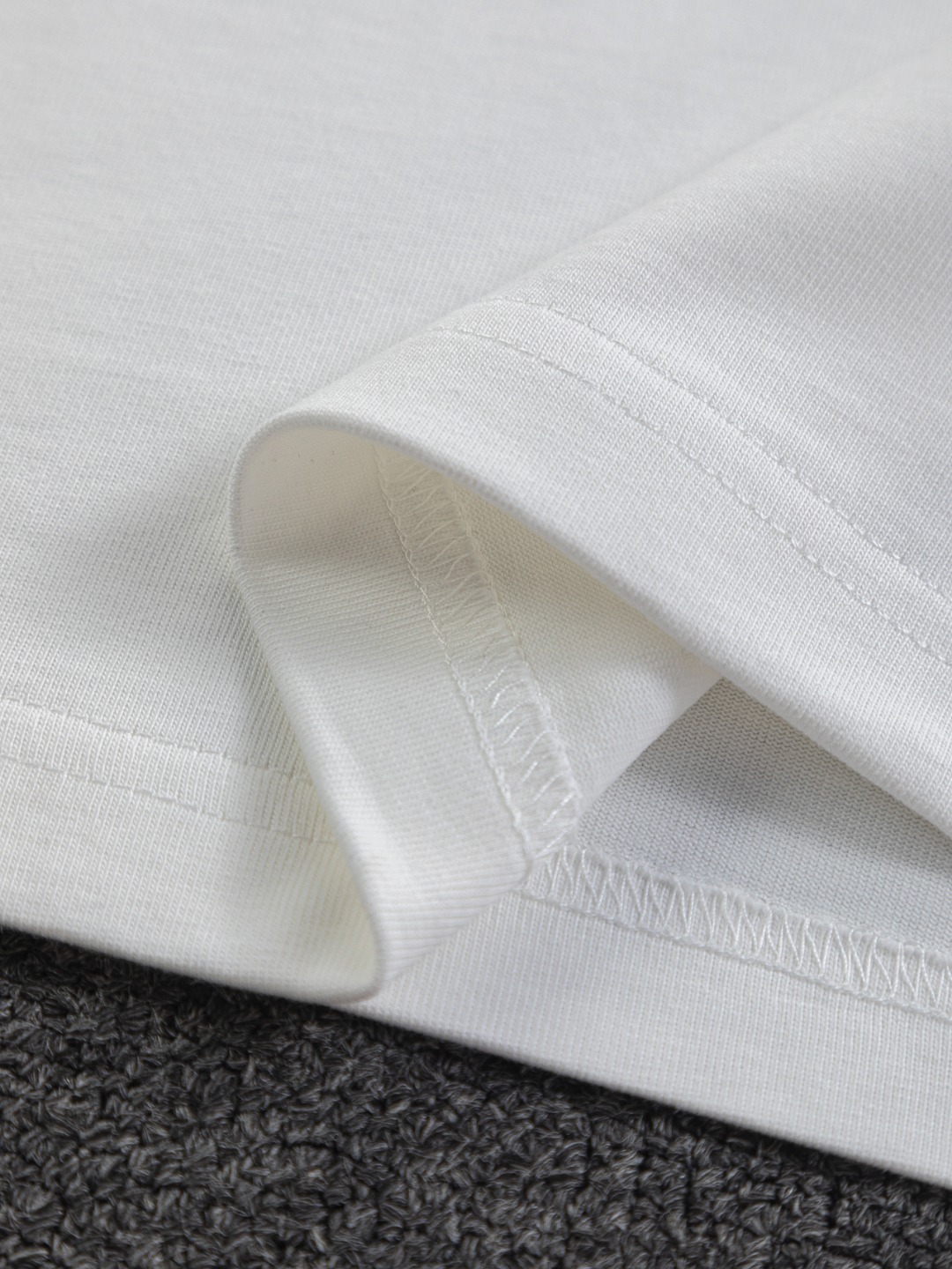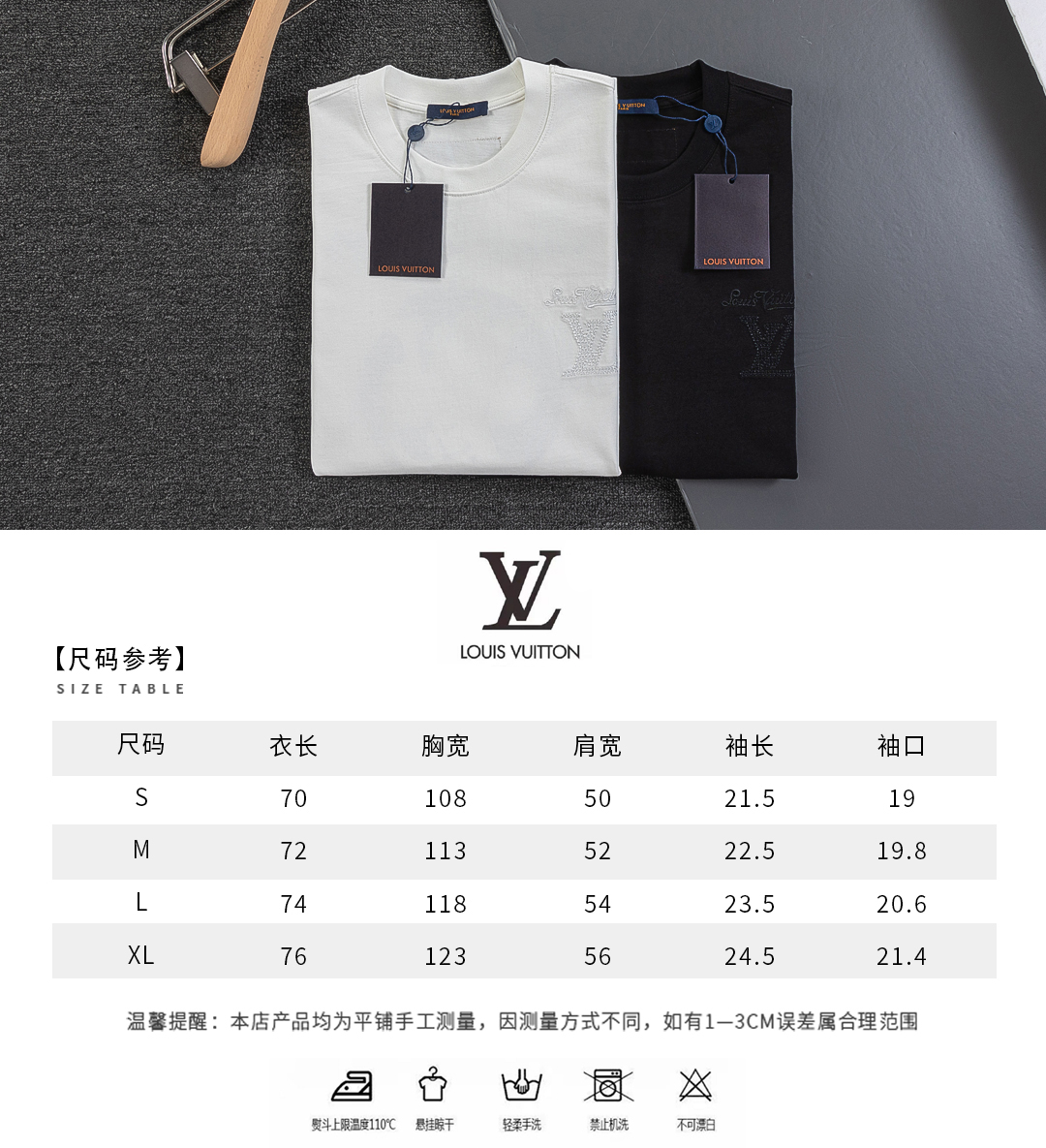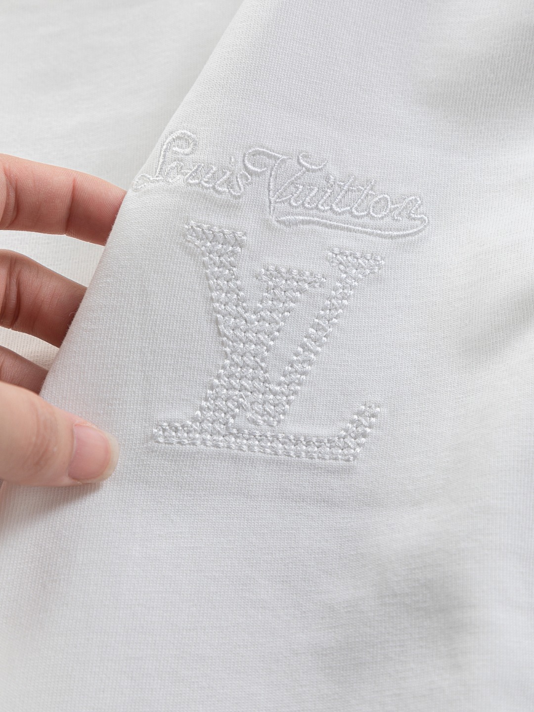 디테일: 가슴 부분 클래식 LV 레터링 자수, 후면 레터링 컷아웃 자수 디테일, 촘촘한 립 조직 라운드 넥 마감으로 안정적인 넥라인 유지.