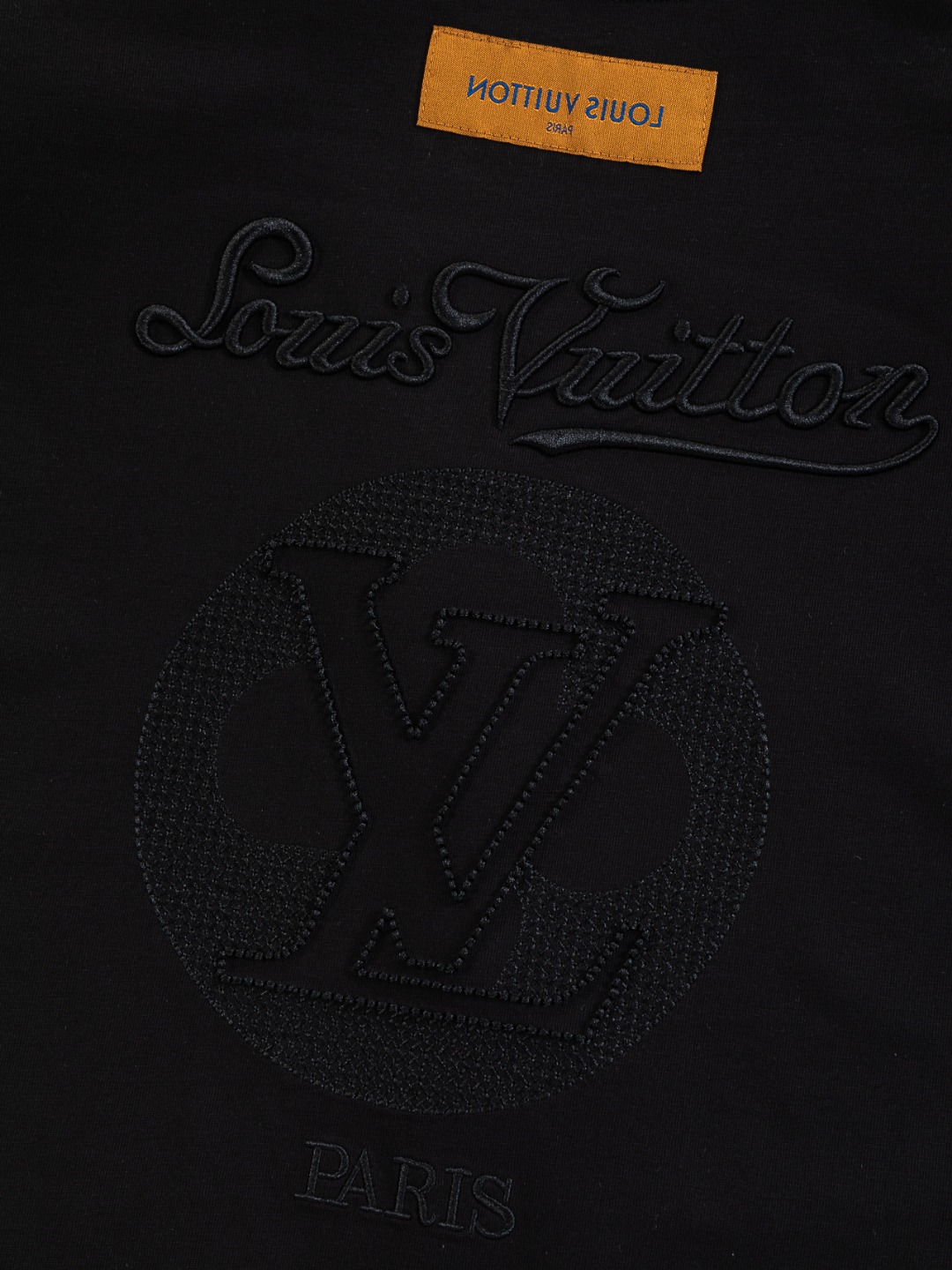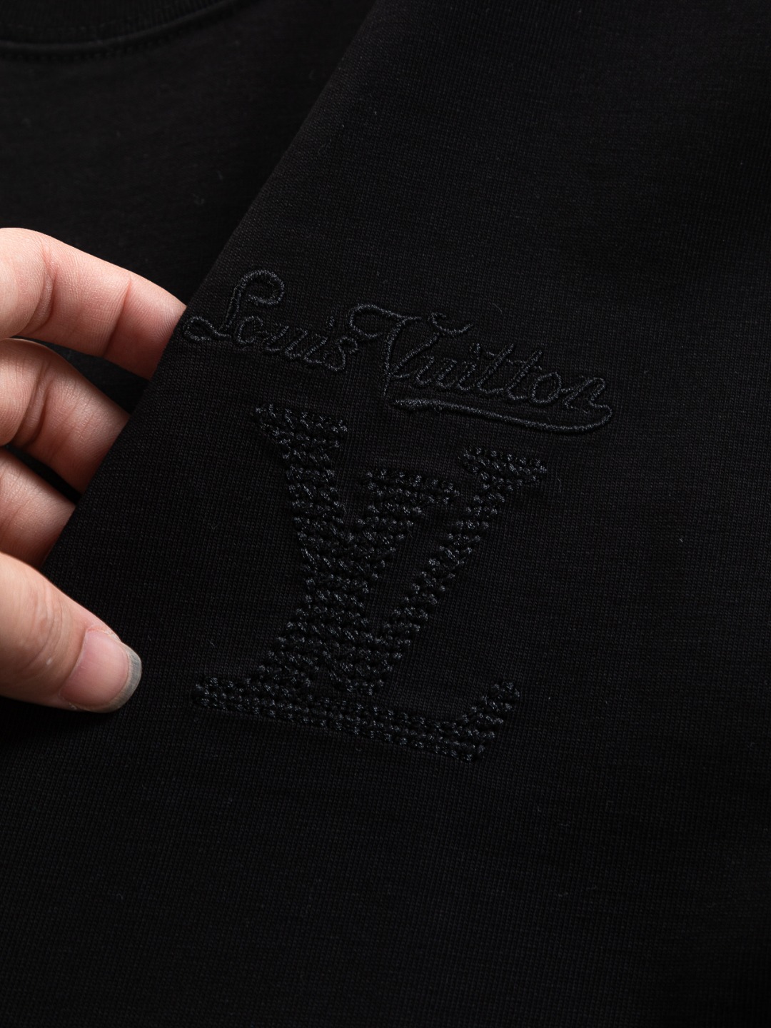 디테일: 가슴 부분 클래식 LV 레터링 자수, 후면 레터링 컷아웃 자수 디테일, 촘촘한 립 조직 라운드 넥 마감으로 안정적인 넥라인 유지.