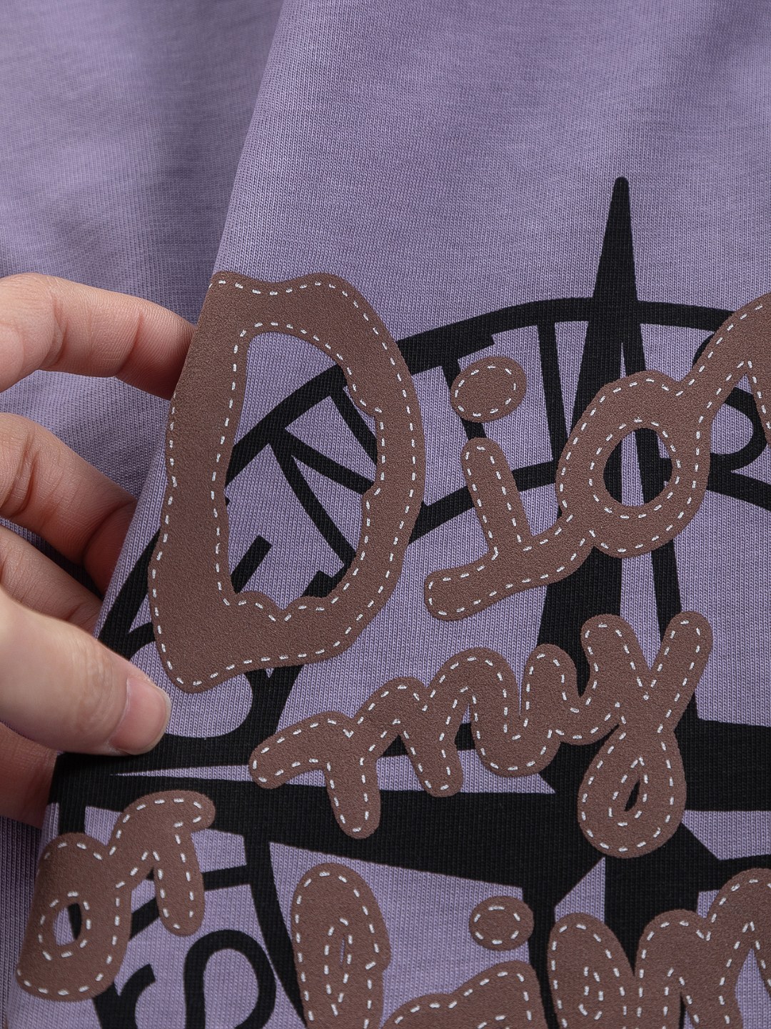 디테일: 전면 레더 레터링 패치와 나침반 모티브 프린트·자수 디테일, 47 패치 자수 포인트, 립 조직 라운드 넥 마감.