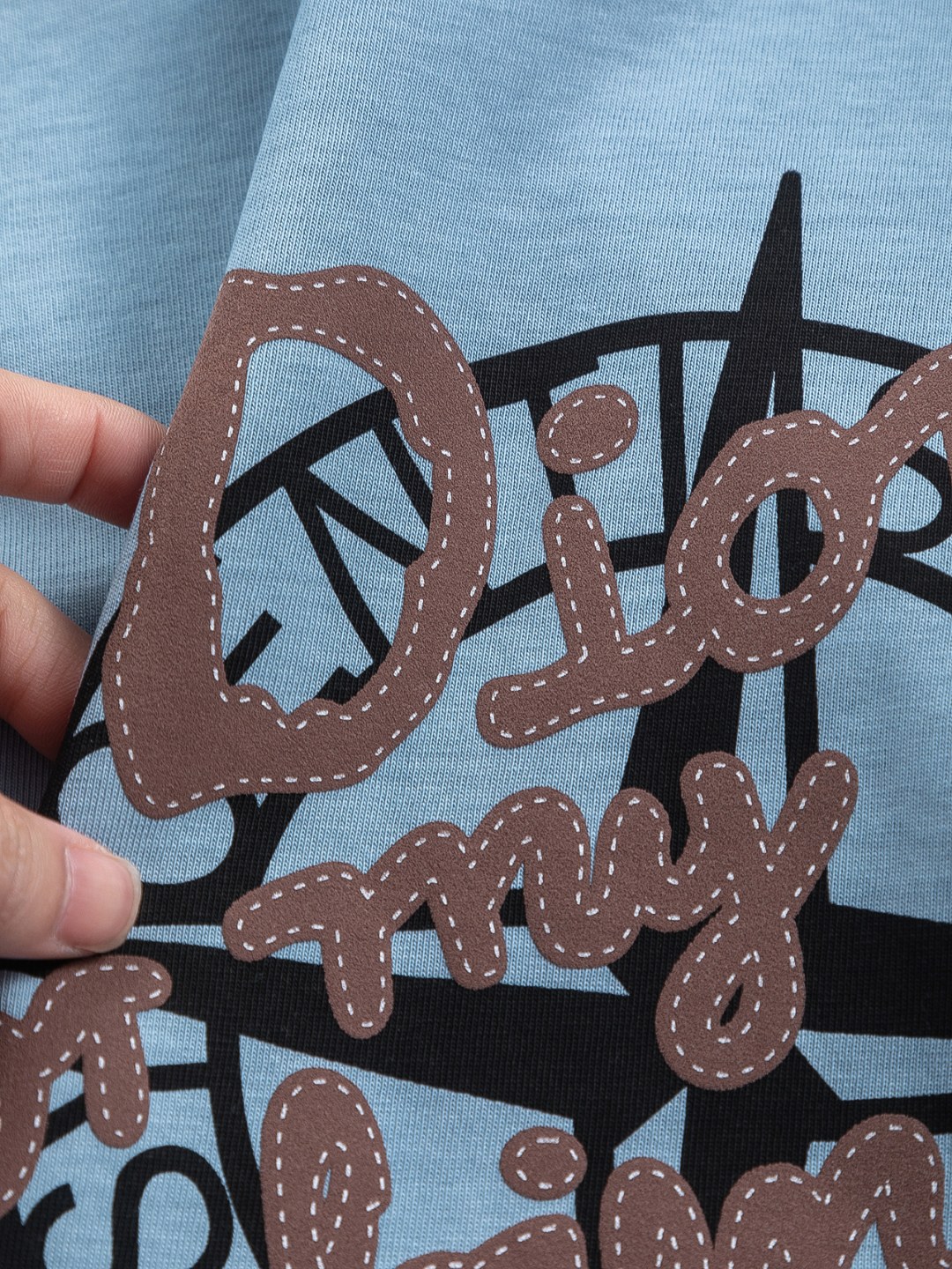디테일: 전면 레더 레터링 패치와 나침반 모티브 프린트·자수 디테일, 47 패치 자수 포인트, 립 조직 라운드 넥 마감.