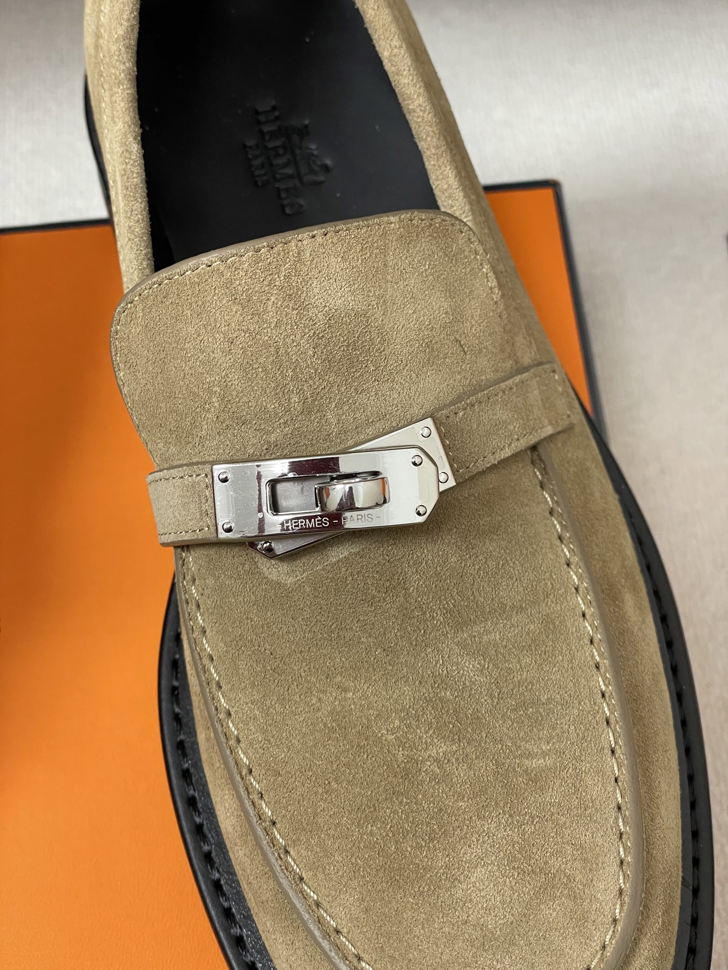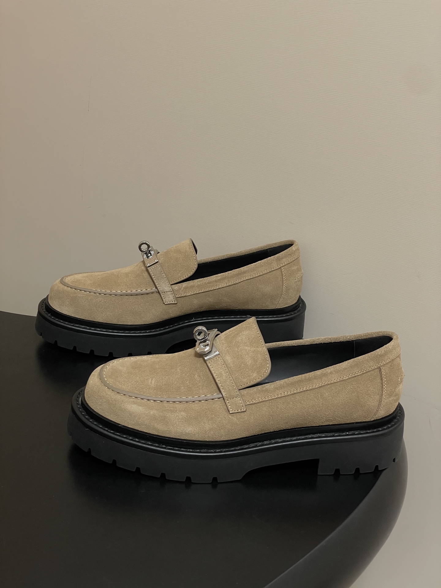 포인트: 고급스러운 스웨이드 질감과 상징적인 켈리 버클로 완성된 데일리 럭셔리 슈즈.