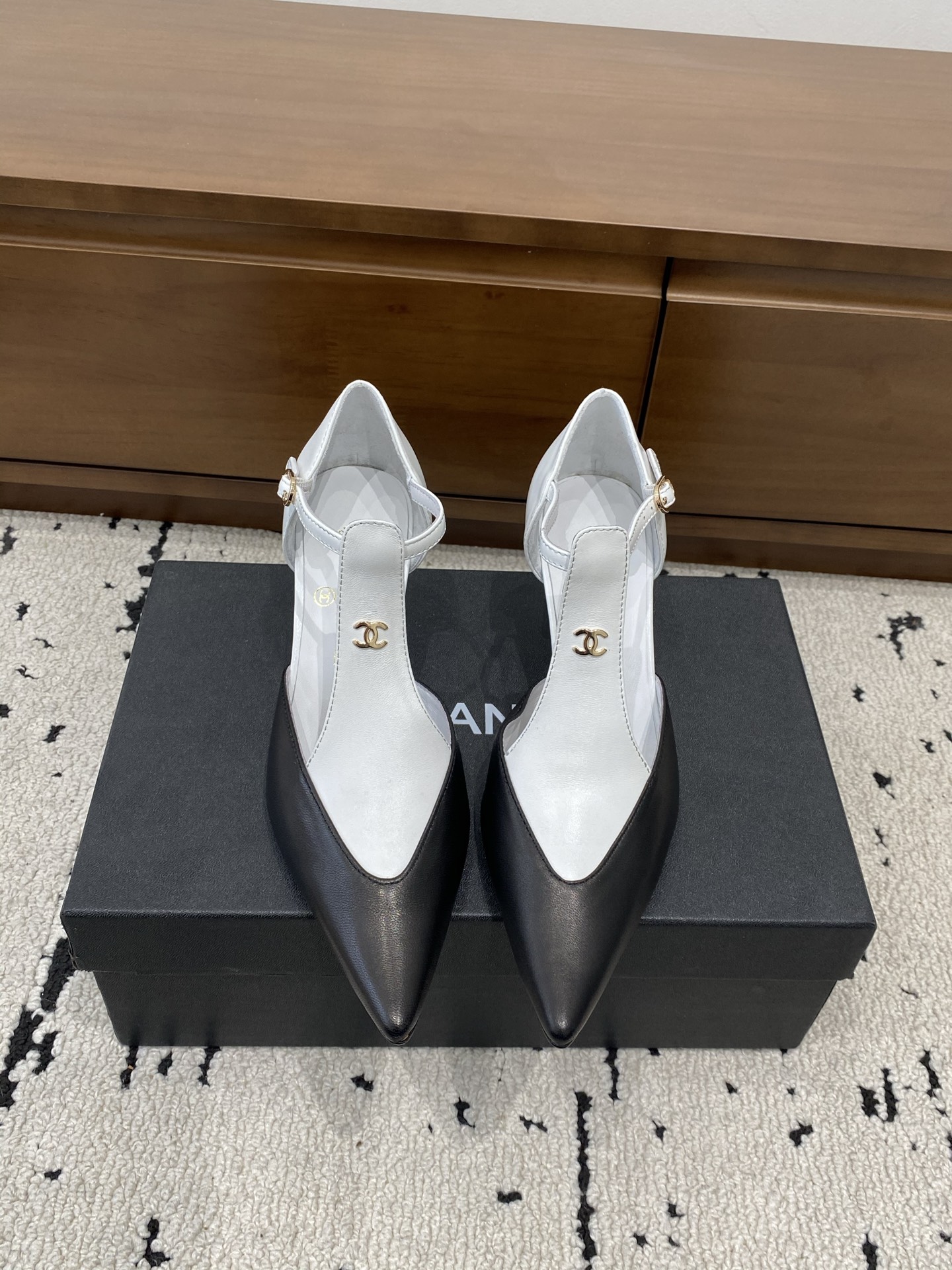 디자인: 샤프한 앞코 + 트위드 로고 자수 + 사이드 오픈(중공)
