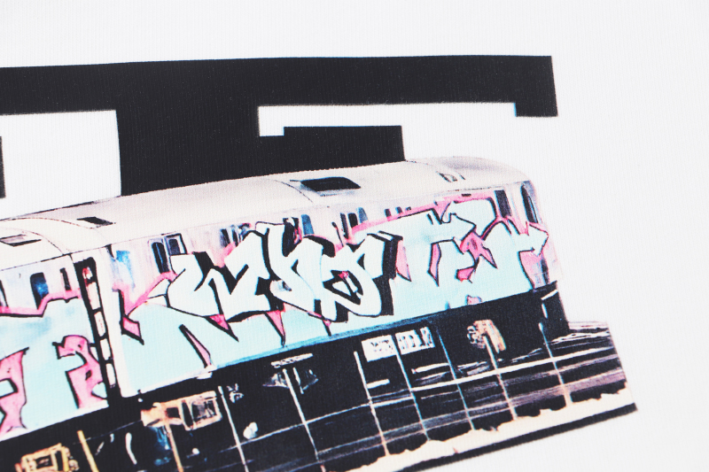 디테일: 정글 사운드·트레인 모티브 디지털 프린트, 리브 조직 넥라인, 스트레이트 밑단 마감