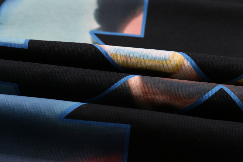 디테일: 후면 인물·애로우 디지털 화이트 잉크 프린트, 리브 조직 넥라인, 스트레이트 밑단 마감