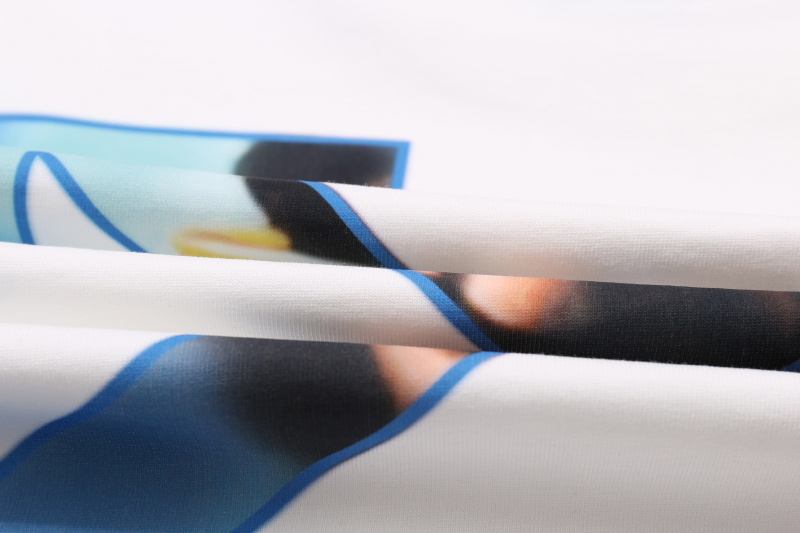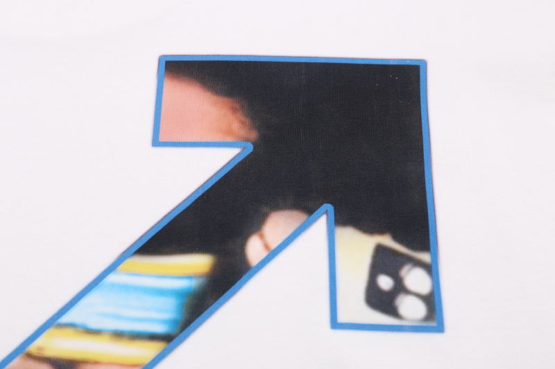 디테일: 후면 인물·애로우 디지털 화이트 잉크 프린트, 리브 조직 넥라인, 스트레이트 밑단 마감