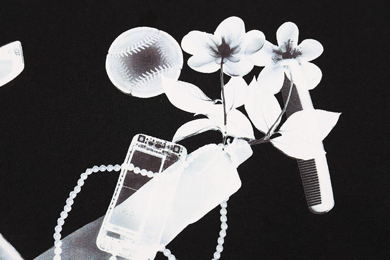 디테일: 전면 안경·모바일 그래픽 프린트, 후면 뉴스페이퍼 그래픽 및 애로우 로고, 1x1 고탄성 리브 넥라인, 스트레이트 밑단 마감