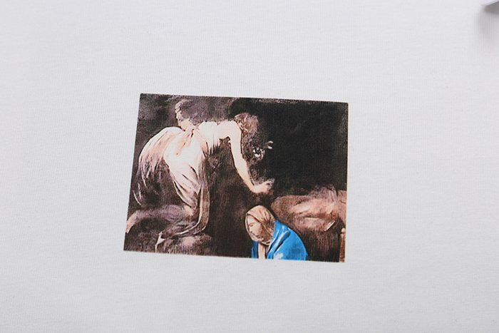“컬러 종교 회화 그래픽과 애로우 포인트가 더해진 오버사이즈 반팔”