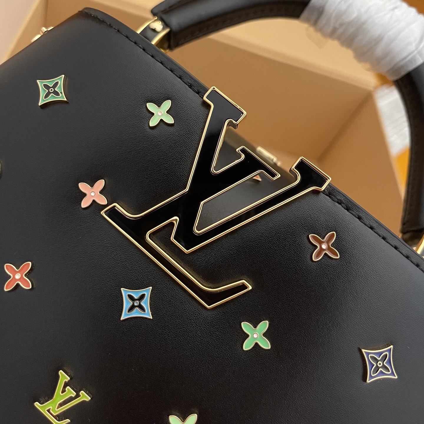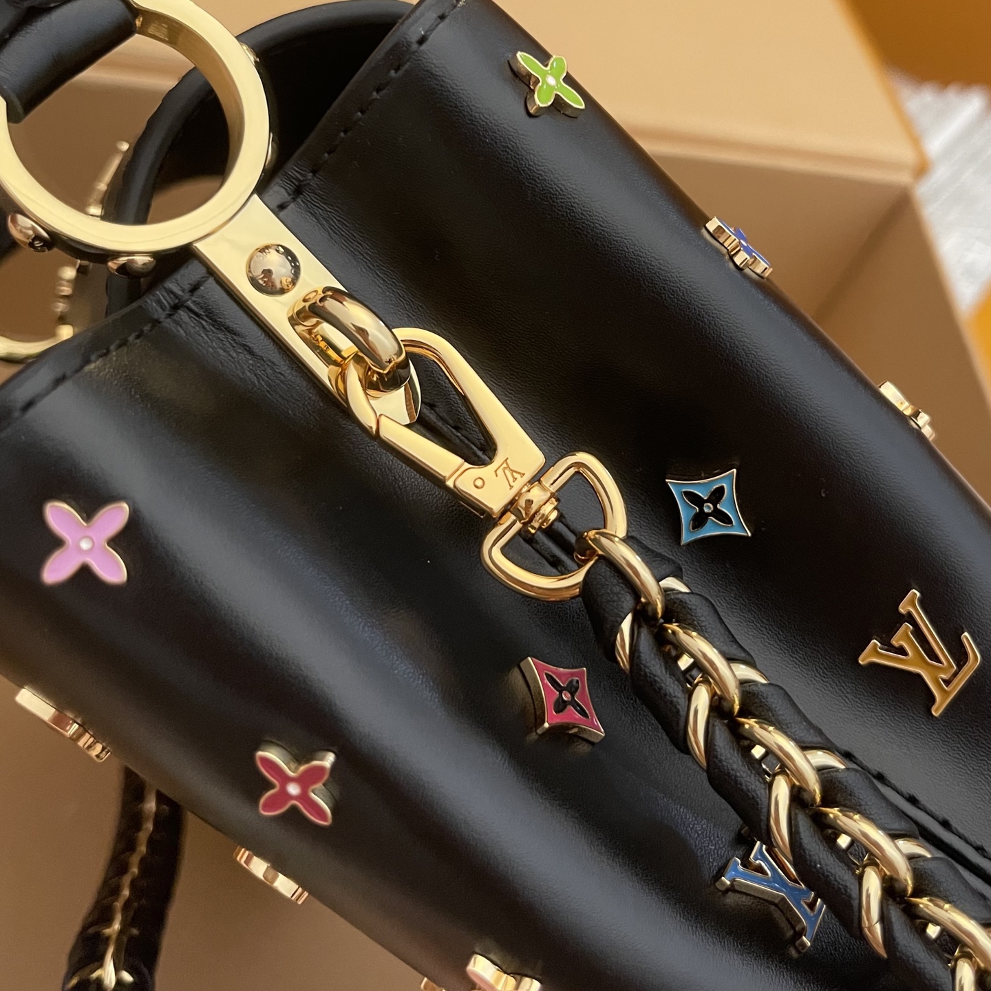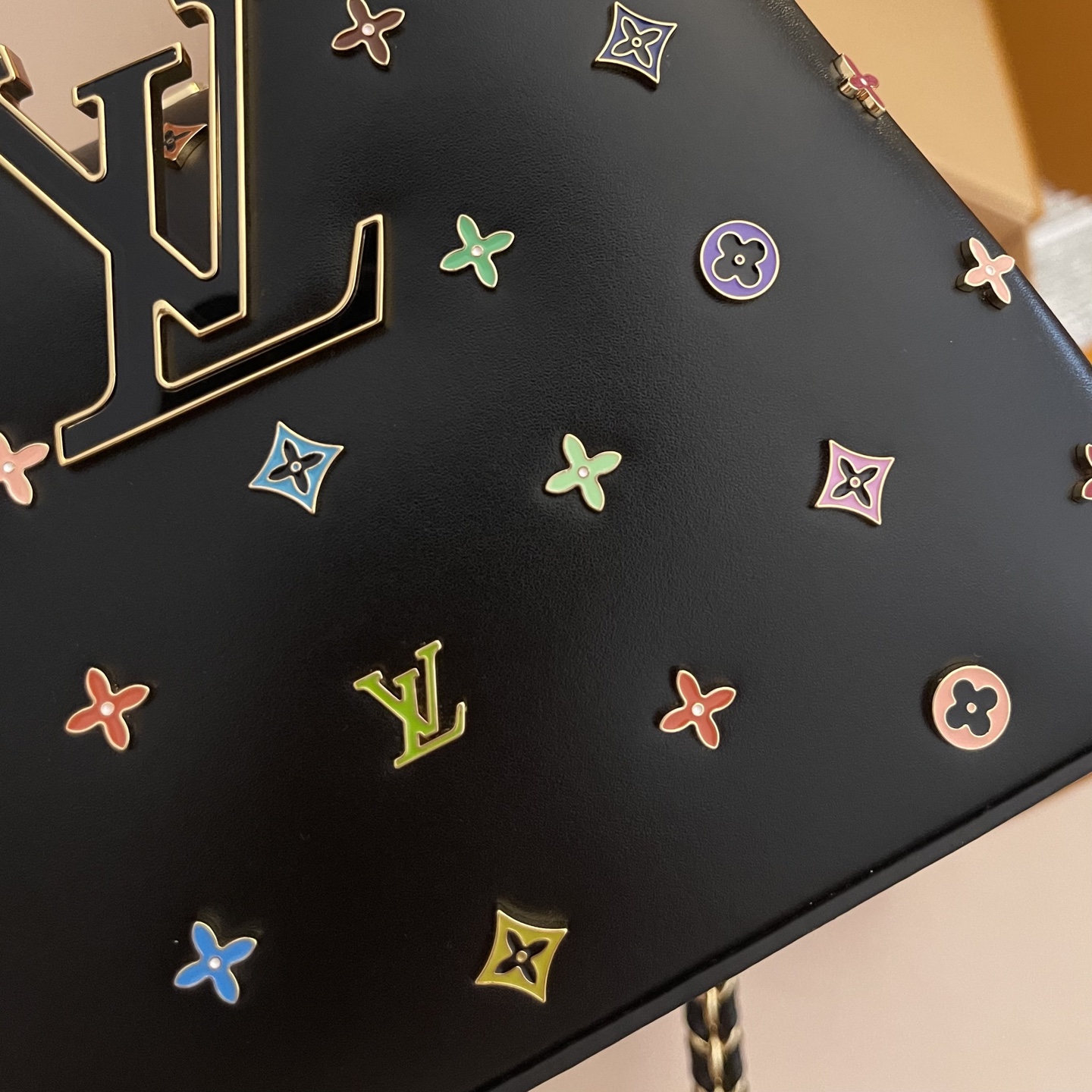 포인트: 루이비통의 'V' 로고와 컬러풀한 플라워 스터드가 조화를 이룬 쿠튀르 감성의 디자인