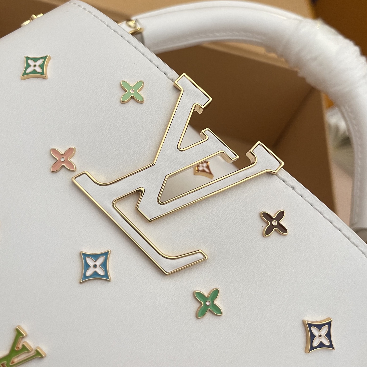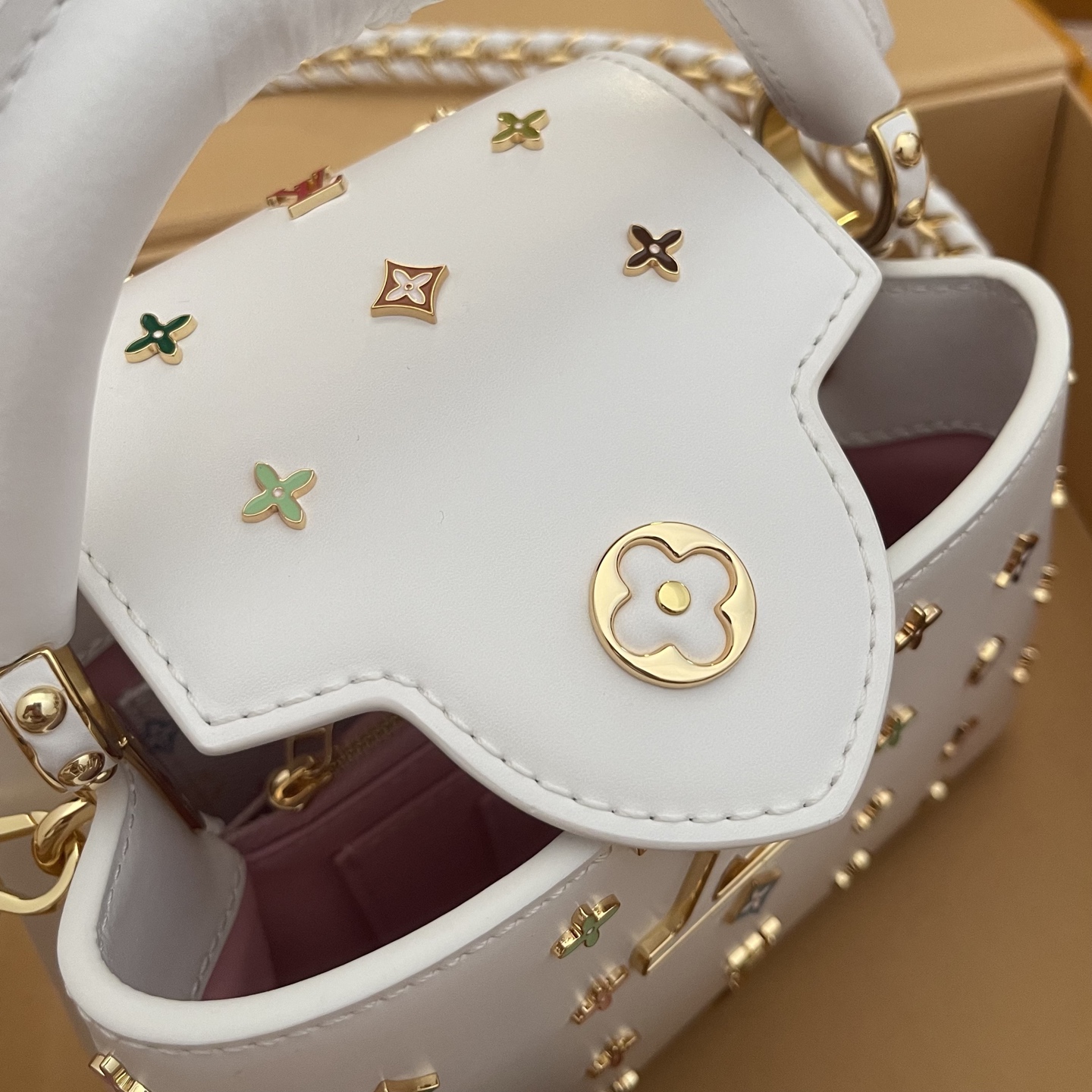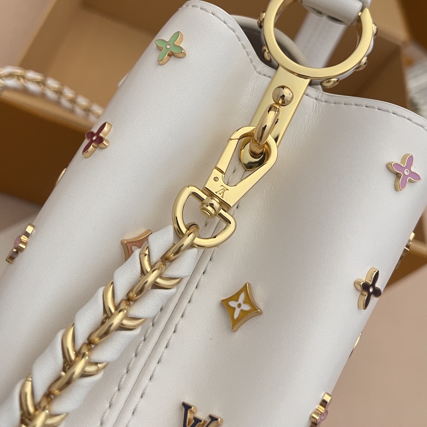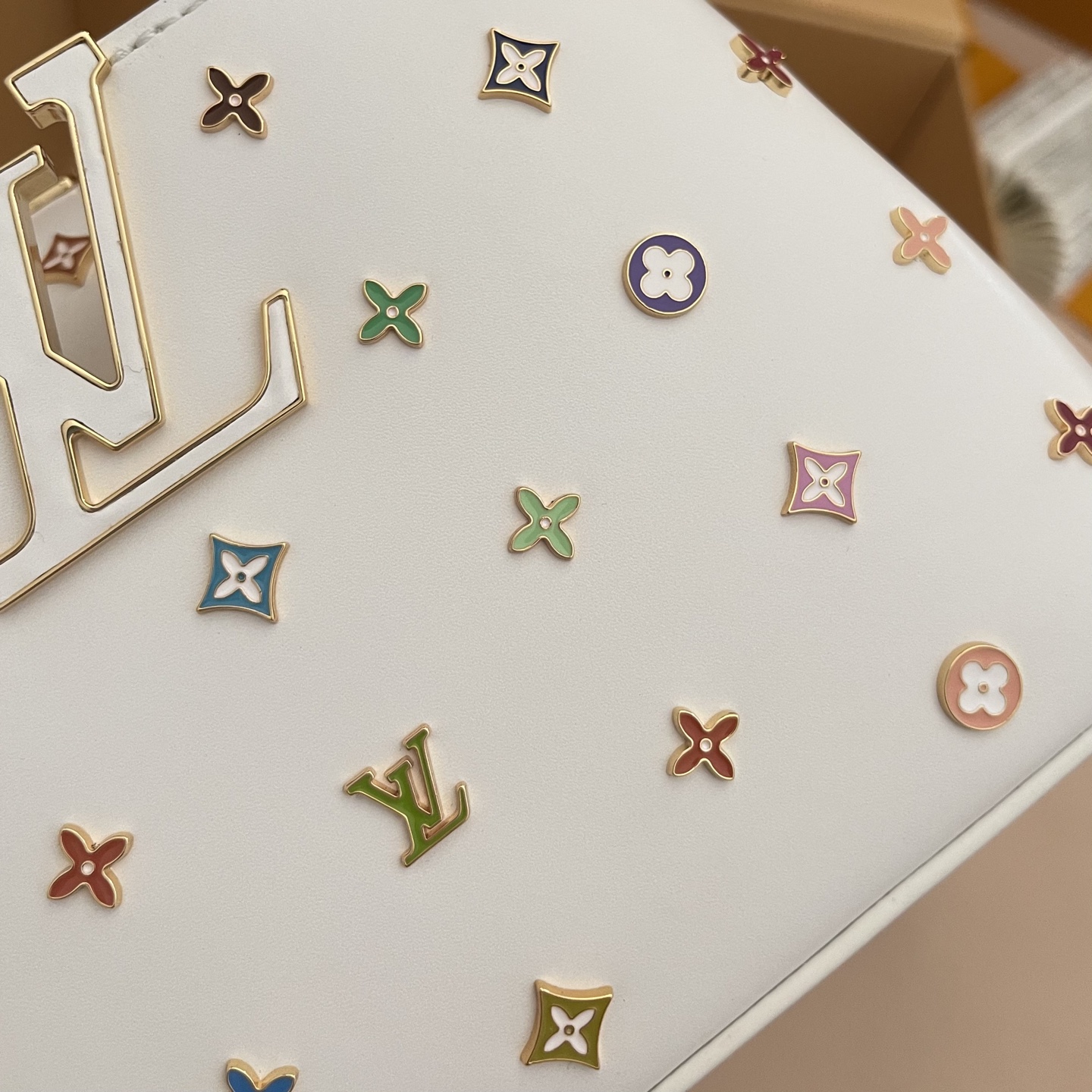 포인트: 루이비통의 'V' 로고와 컬러풀한 플라워 스터드가 조화를 이룬 쿠튀르 감성의 디자인