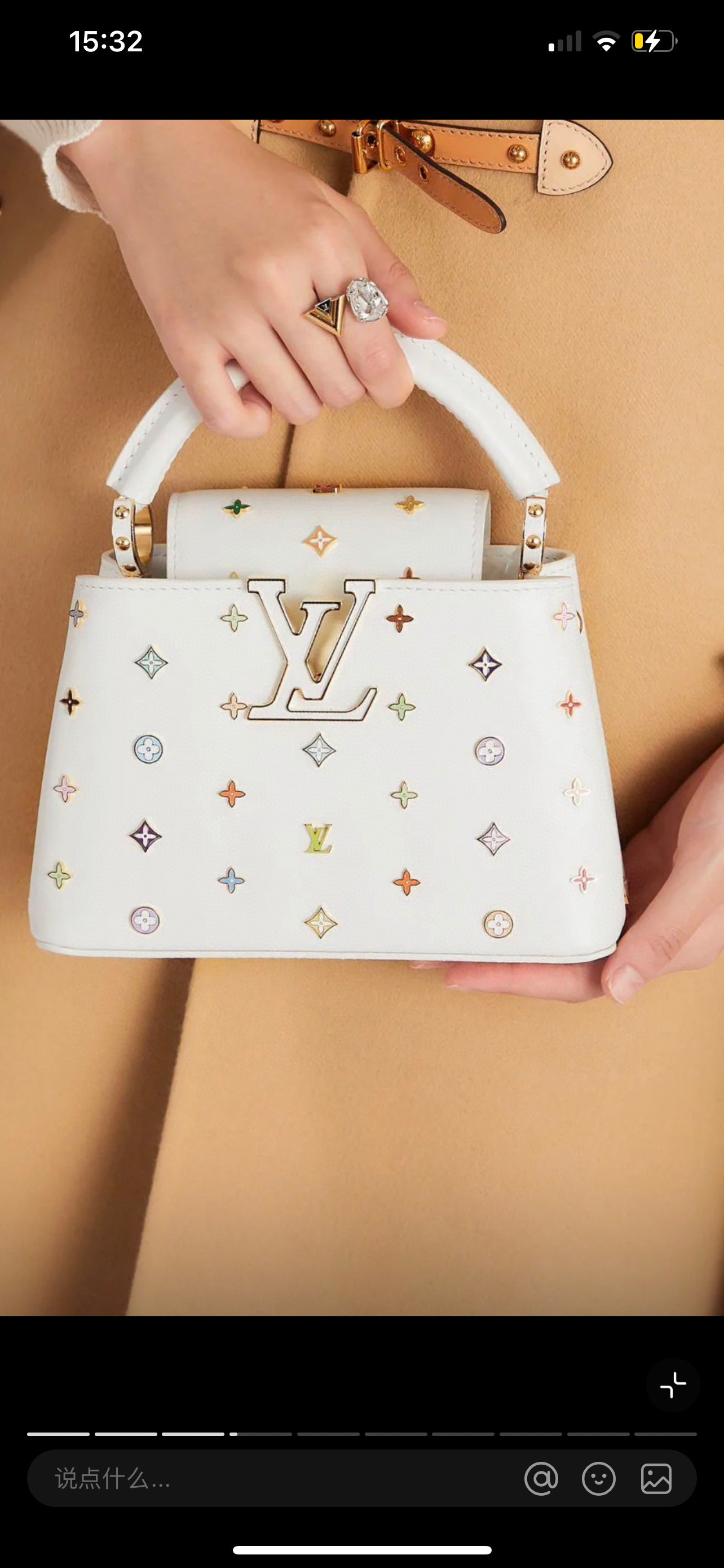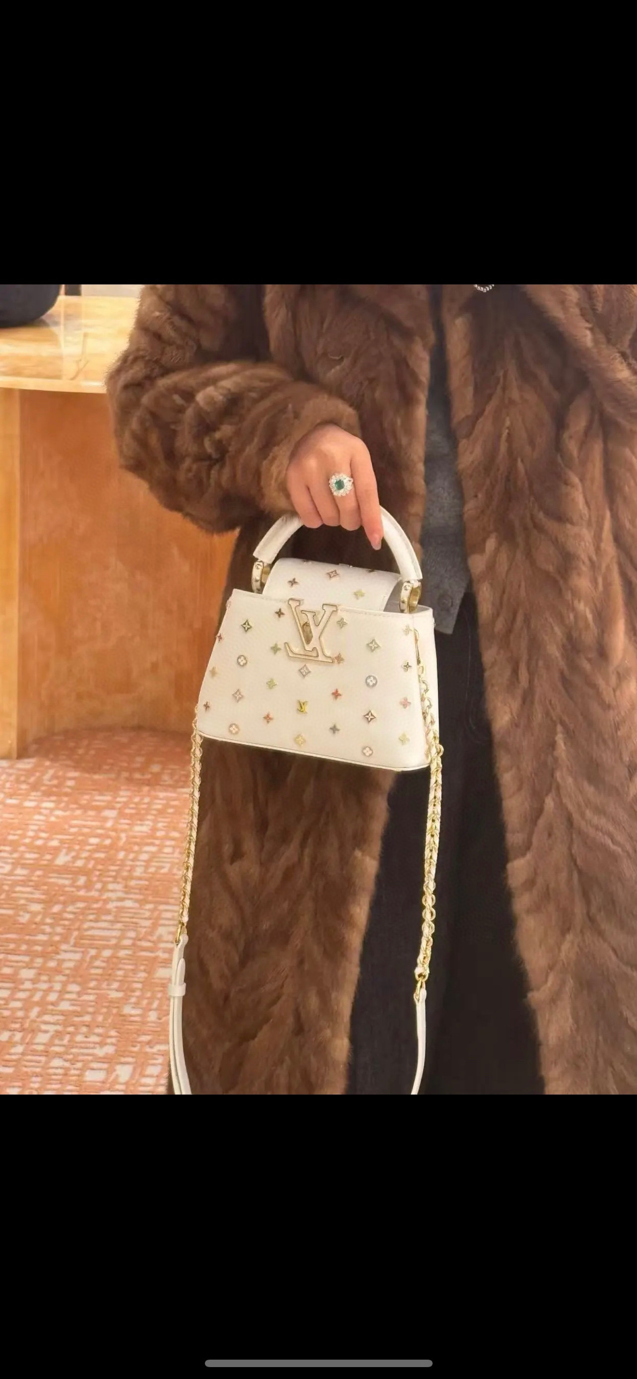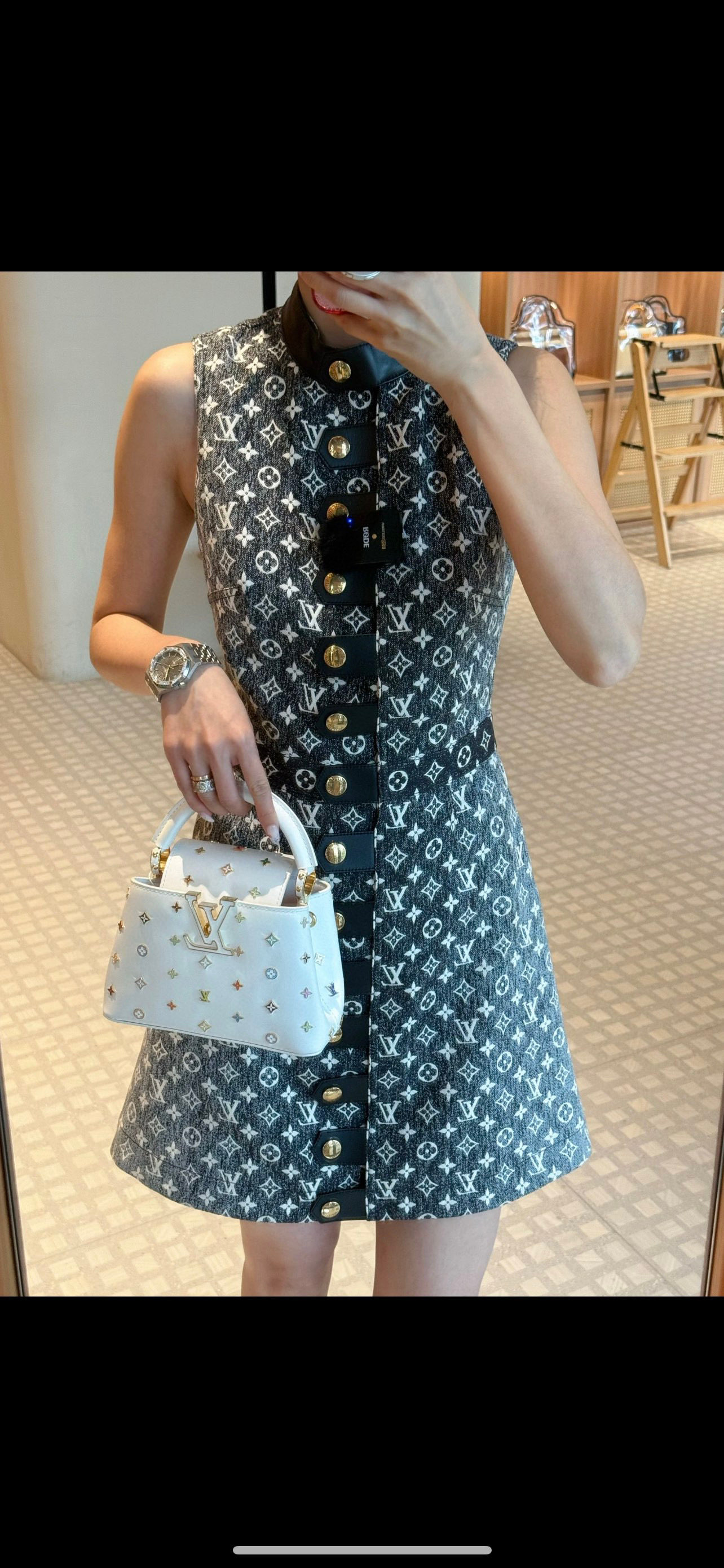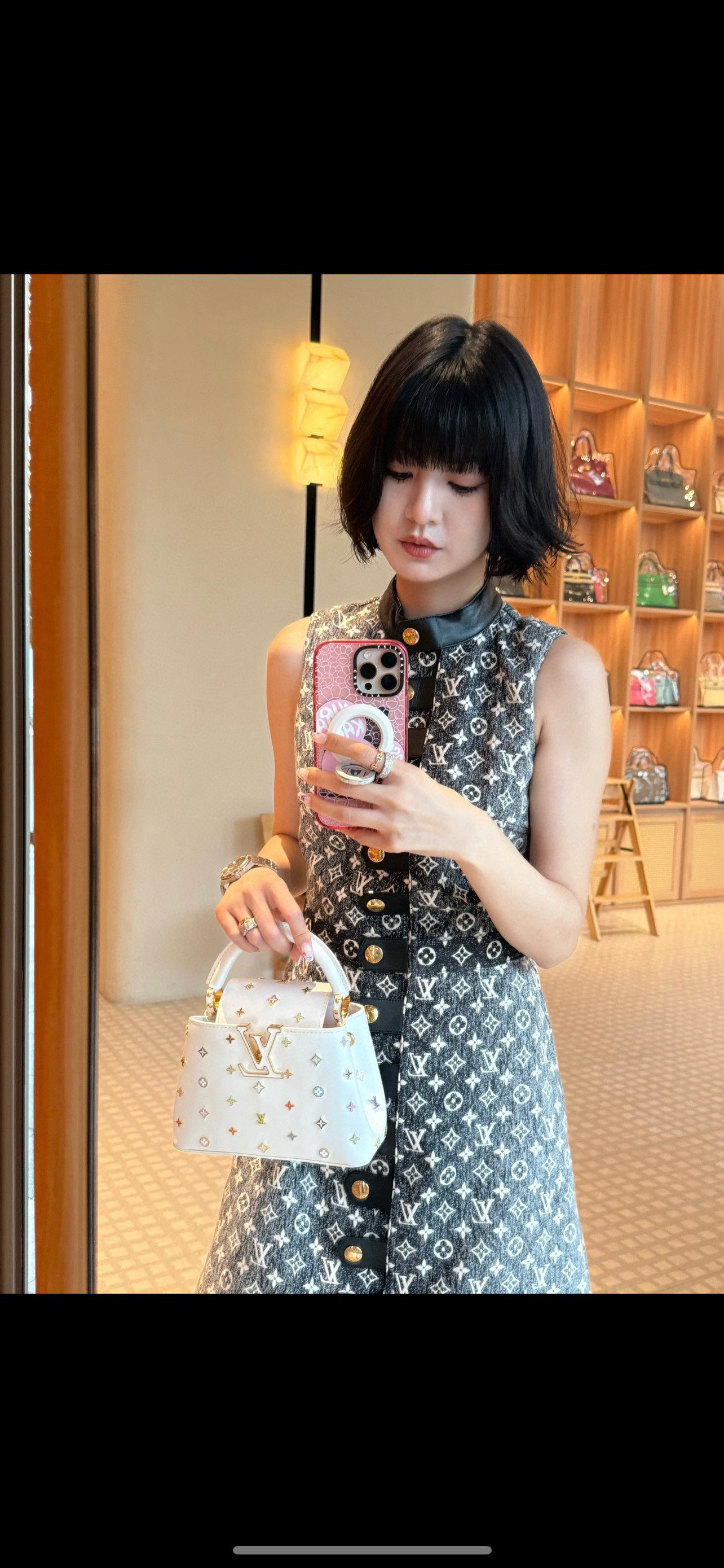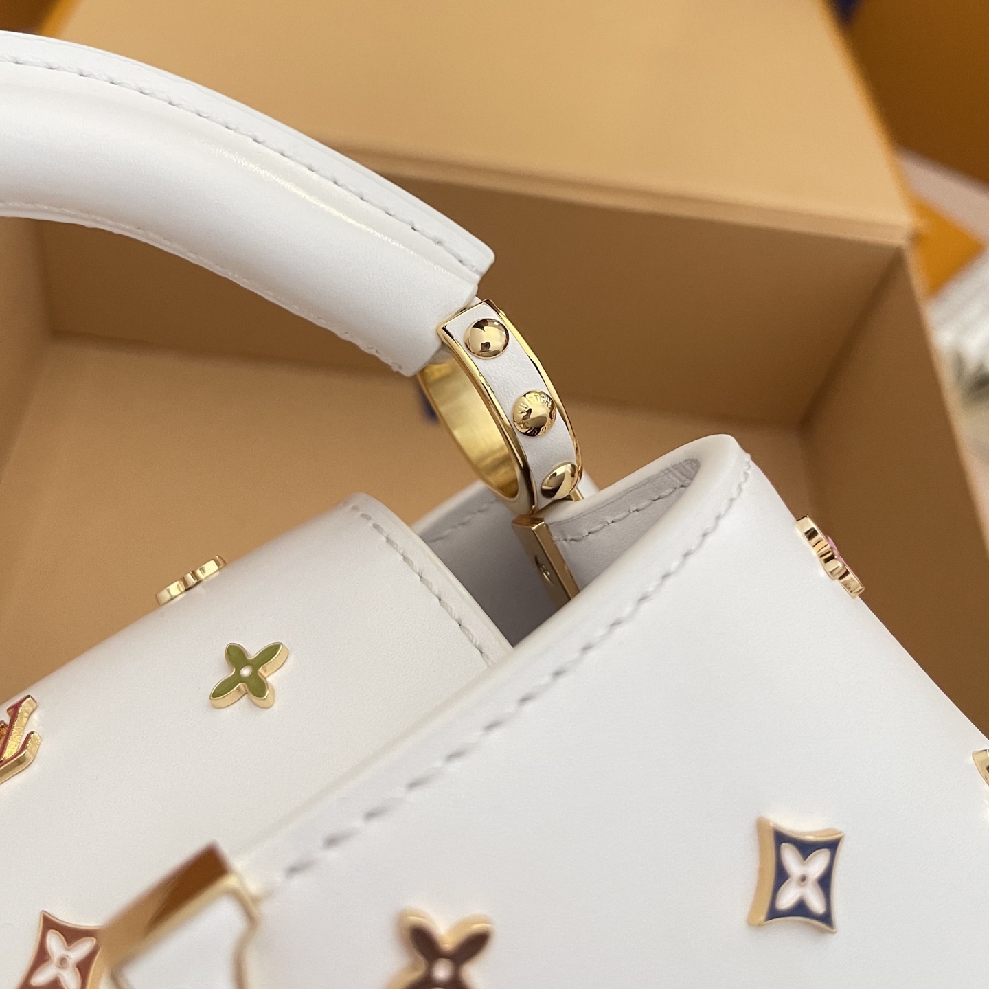 포인트: 루이비통의 'V' 로고와 컬러풀한 플라워 스터드가 조화를 이룬 쿠튀르 감성의 디자인