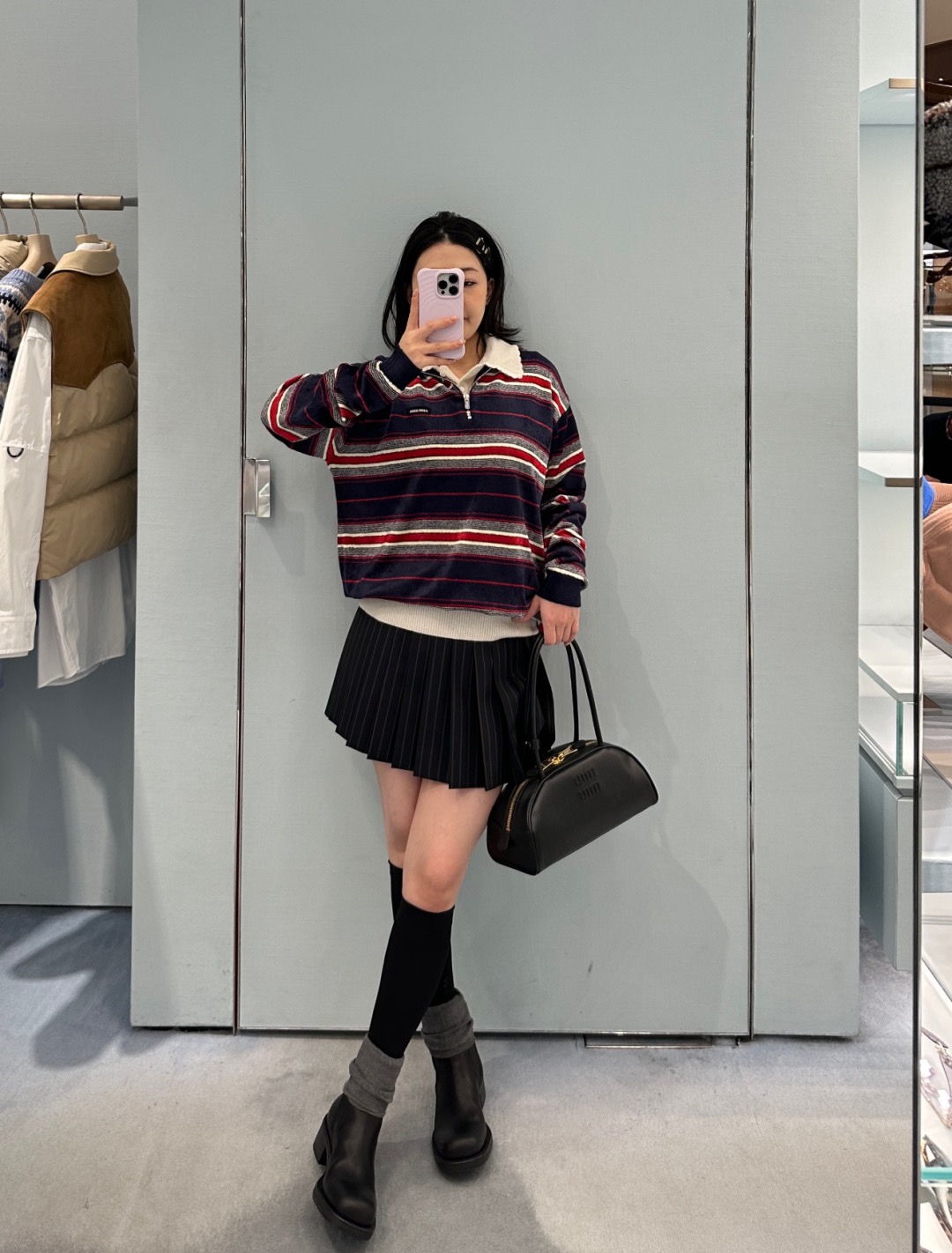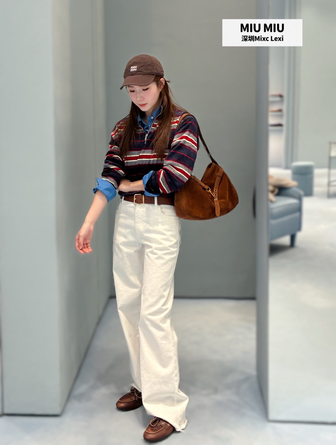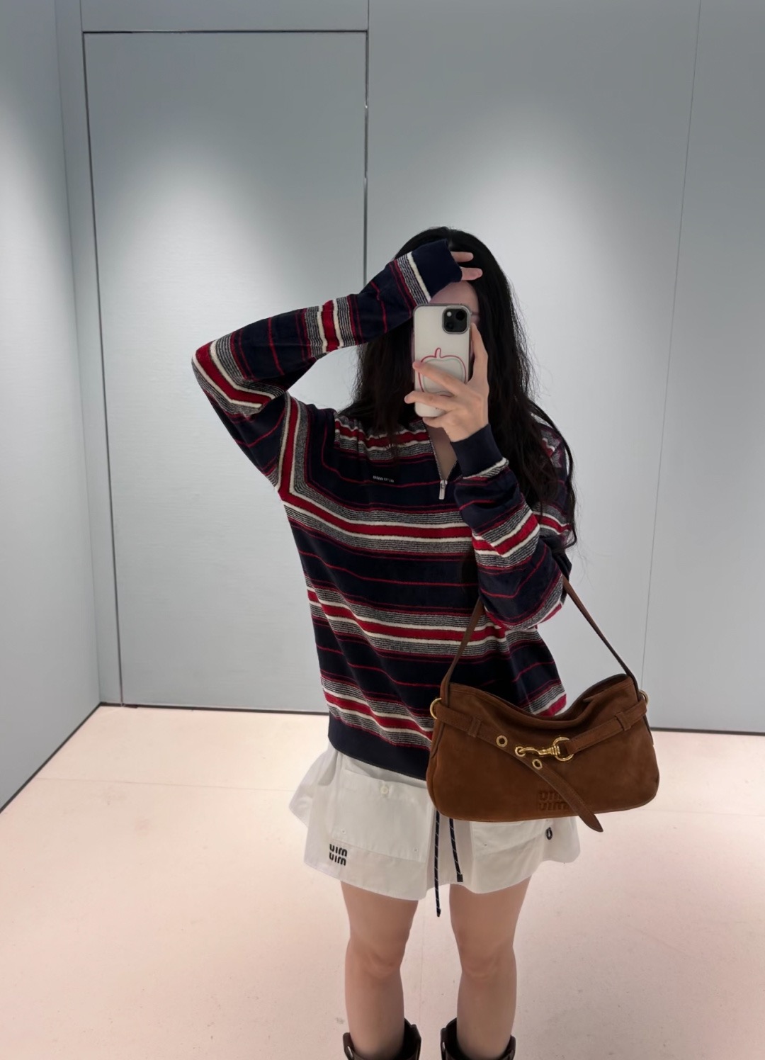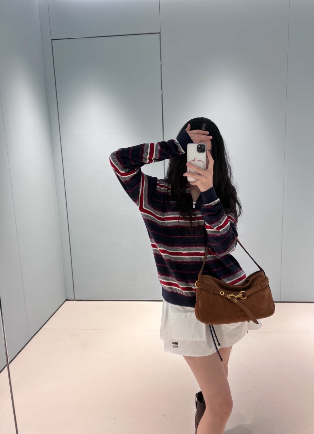 디테일: 가슴 부분의 미우미우 로고가 과하지 않으면서도 고급스러운 브랜드 감성을 은은하게 보여줘요.