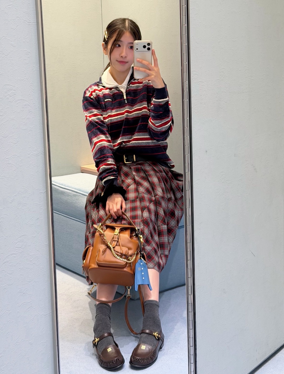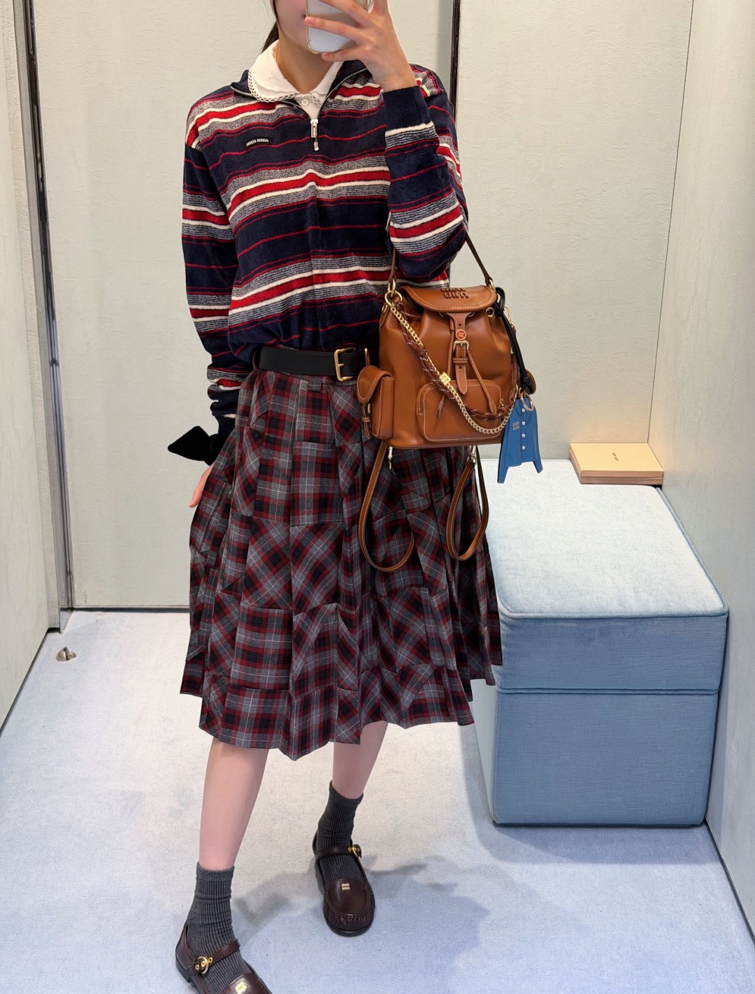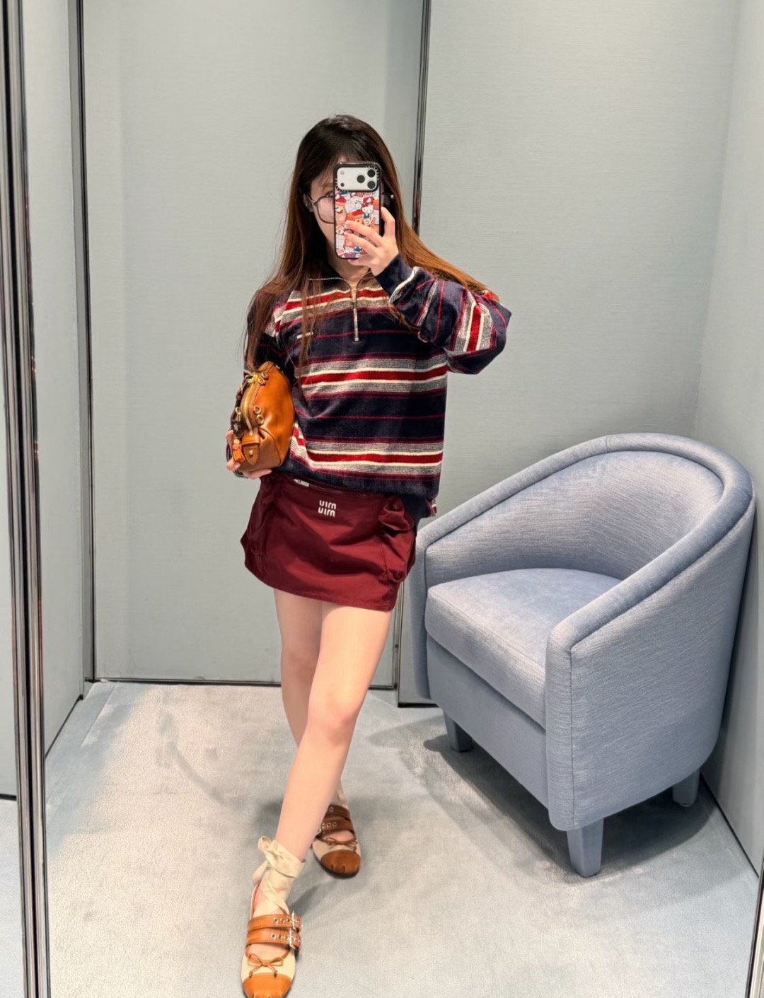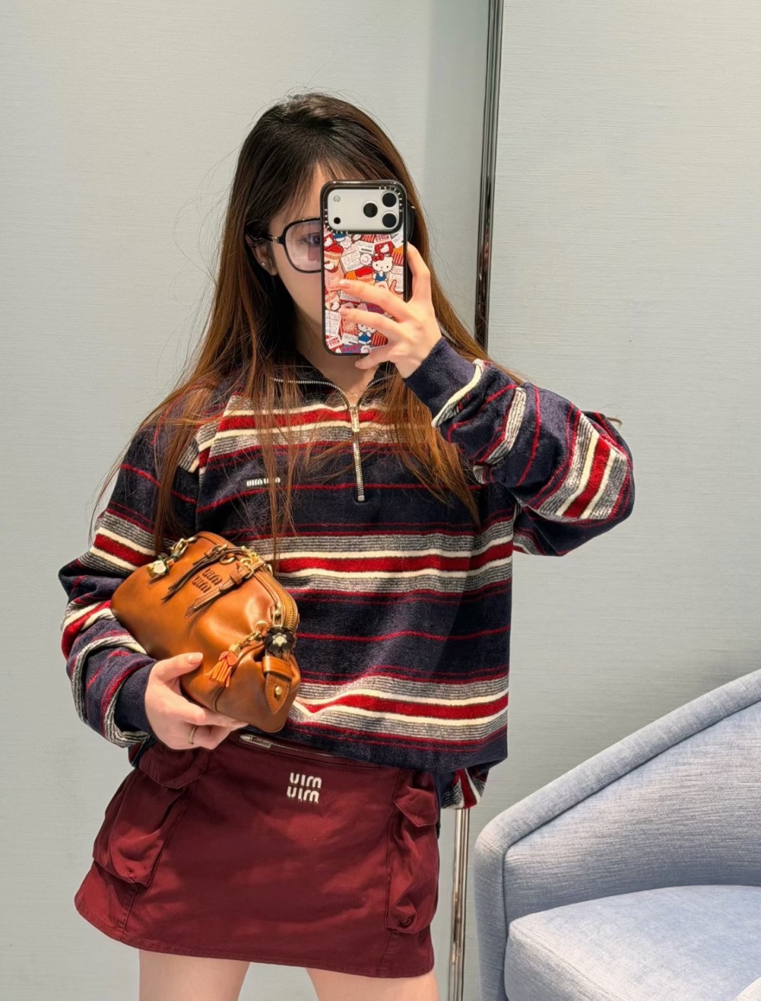 디테일: 가슴 부분의 미우미우 로고가 과하지 않으면서도 고급스러운 브랜드 감성을 은은하게 보여줘요.