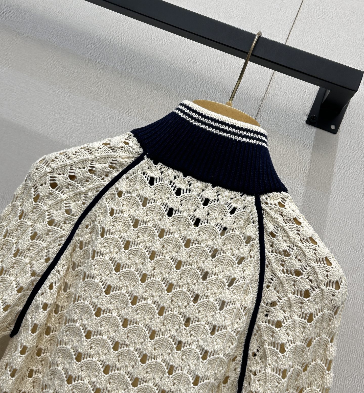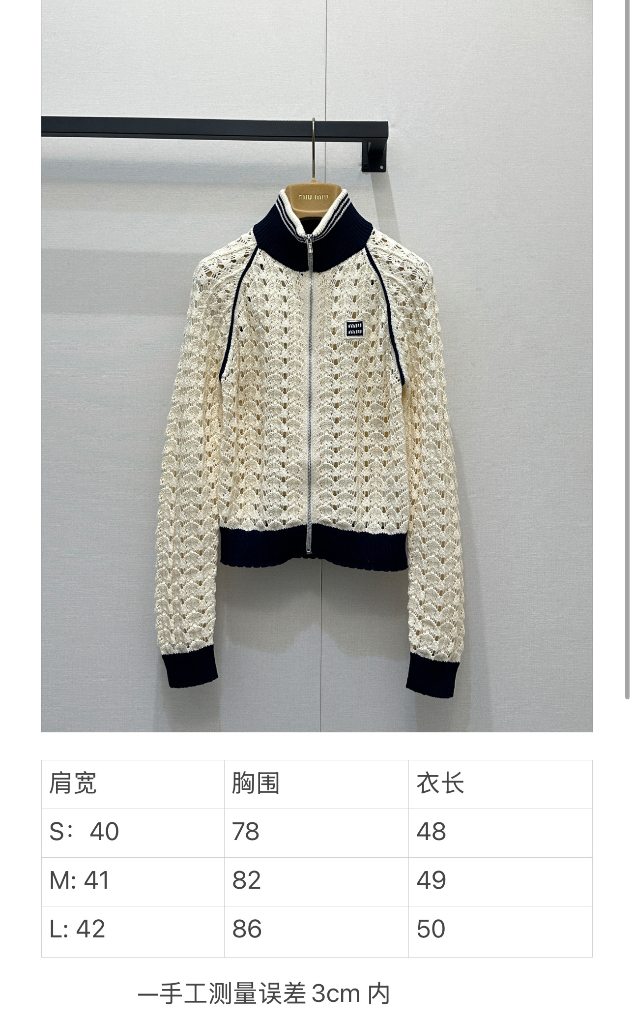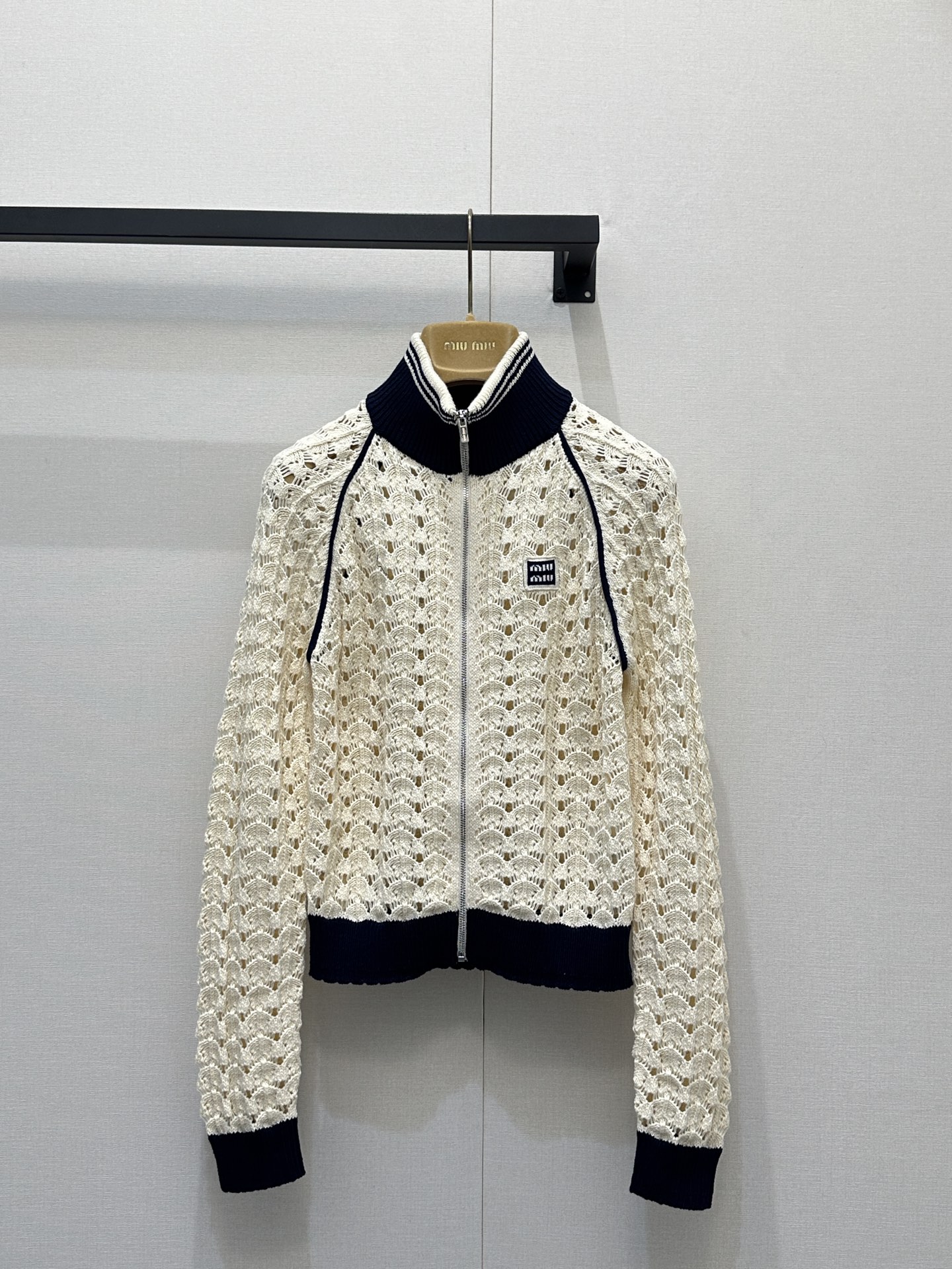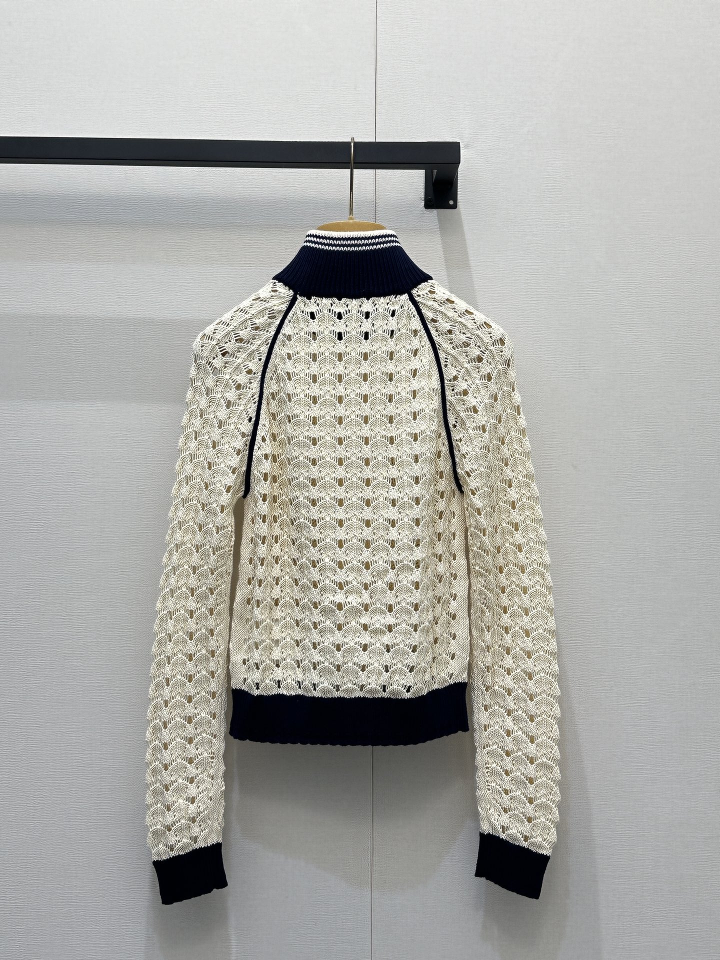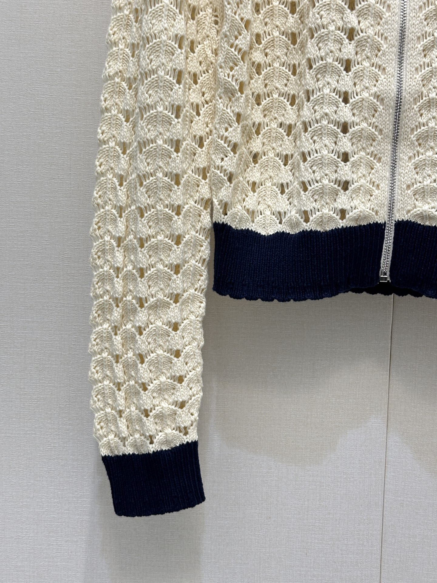 디테일: 스캘럽 형태 펀칭 니트 패턴, 배색 리브 스탠드 카라 및 소매, 가슴 미니 로고, 풀 집업 구조
