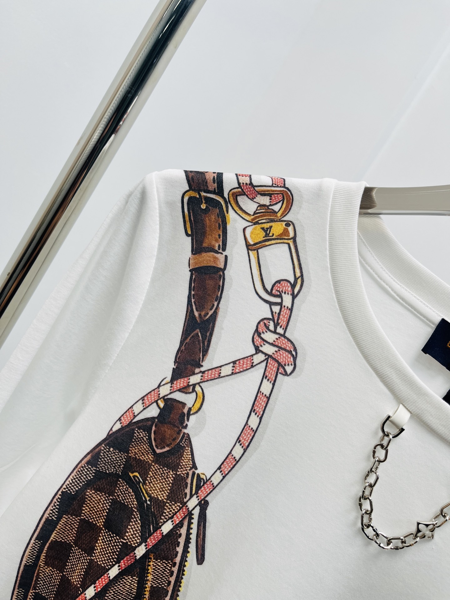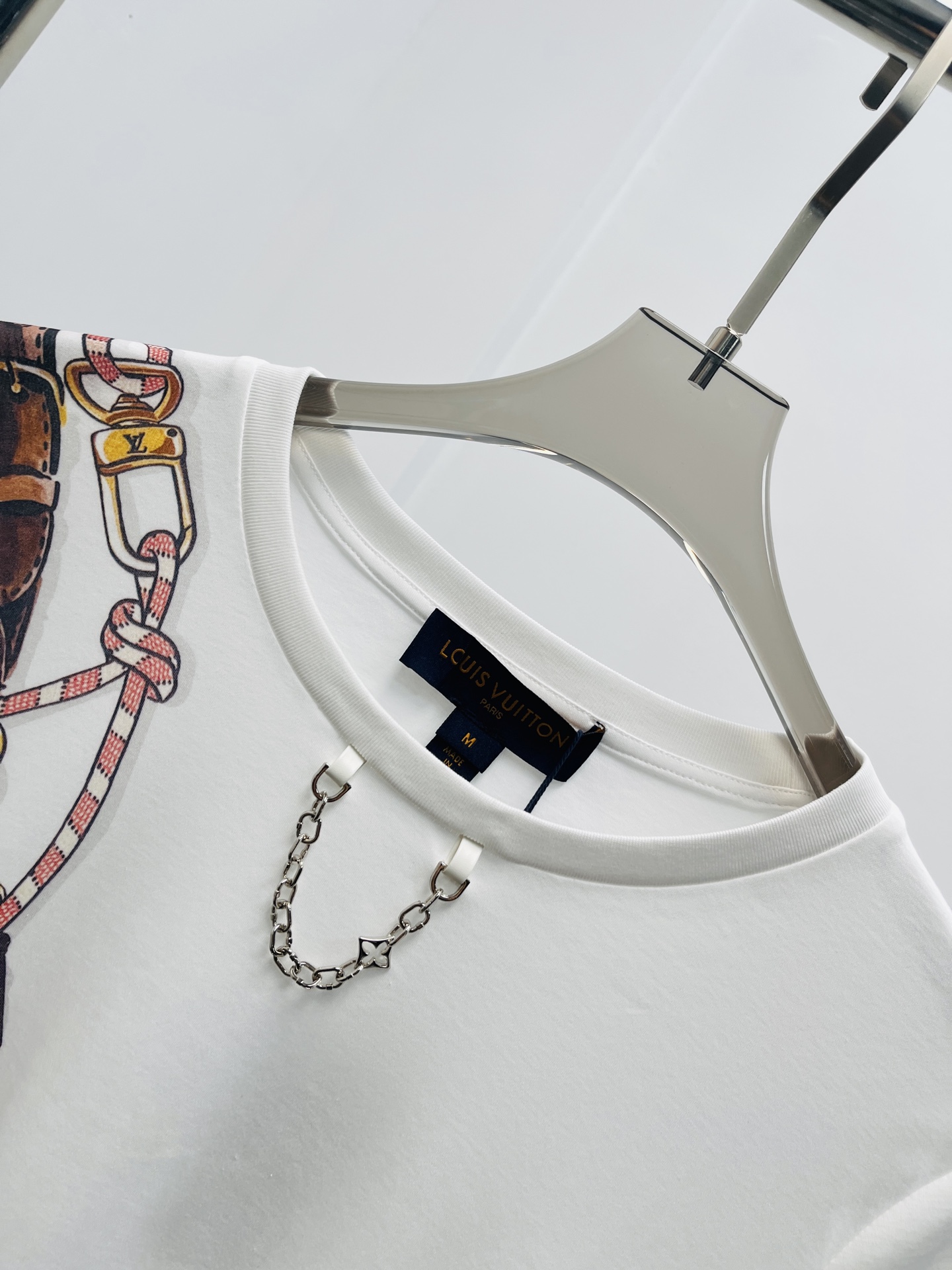 클로버 패턴과 네크라인 체인 레터링 디테일, 후면까지 연결