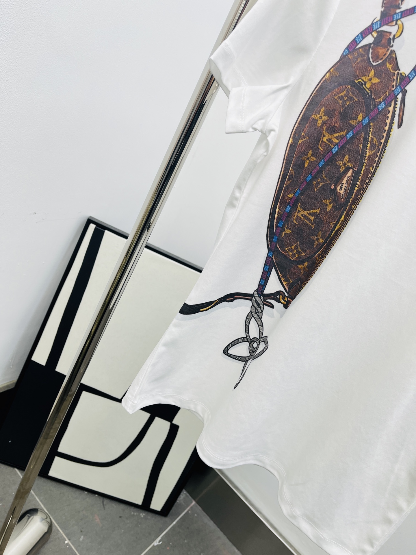 가슴 프린트로 핸드드로잉 느낌의 가방 외곽과 포인트 컬러 강조