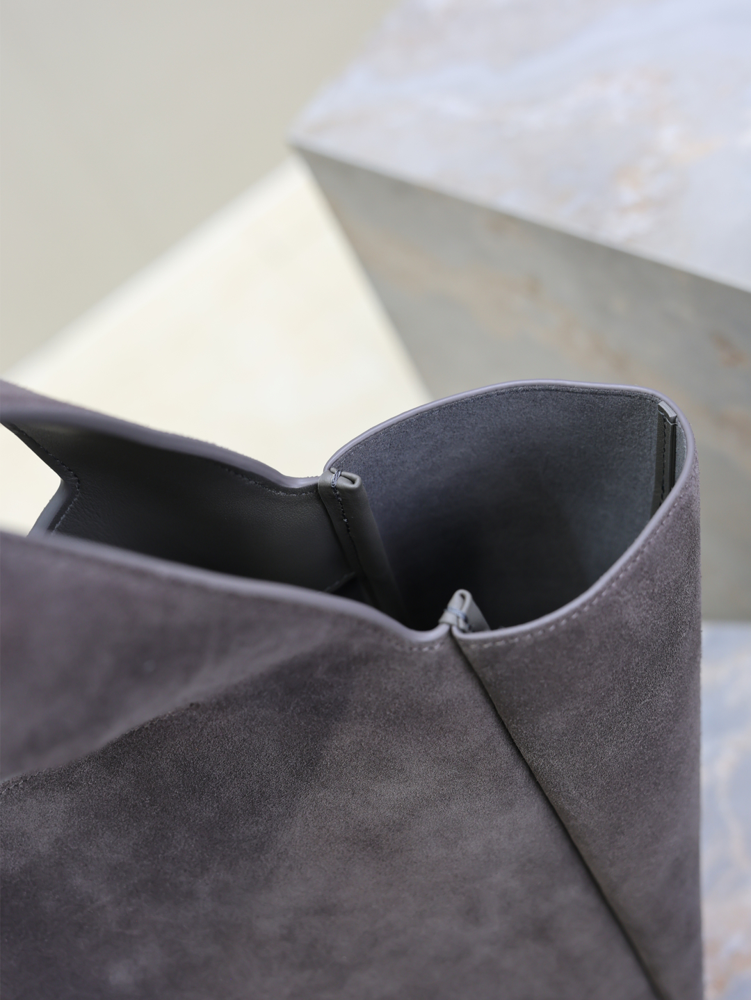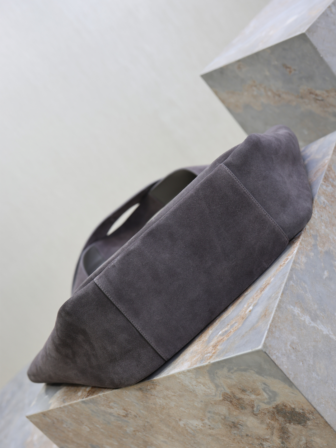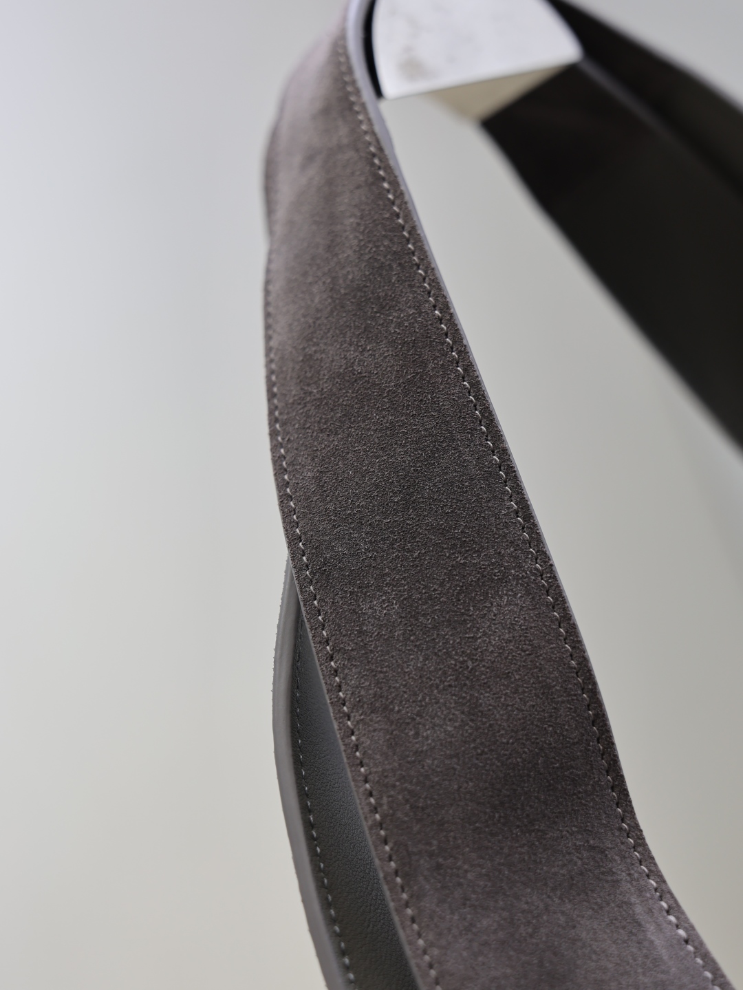 부드러운 스웨이드 가죽 소재로 자연스러운 곡선 실루엣이 특징이며, 내부 가죽 스트랩을 묶으면 호보백 형태로 변형 가능