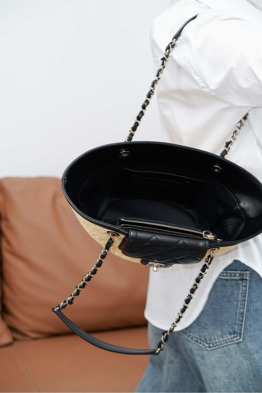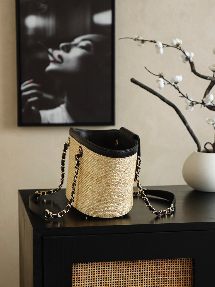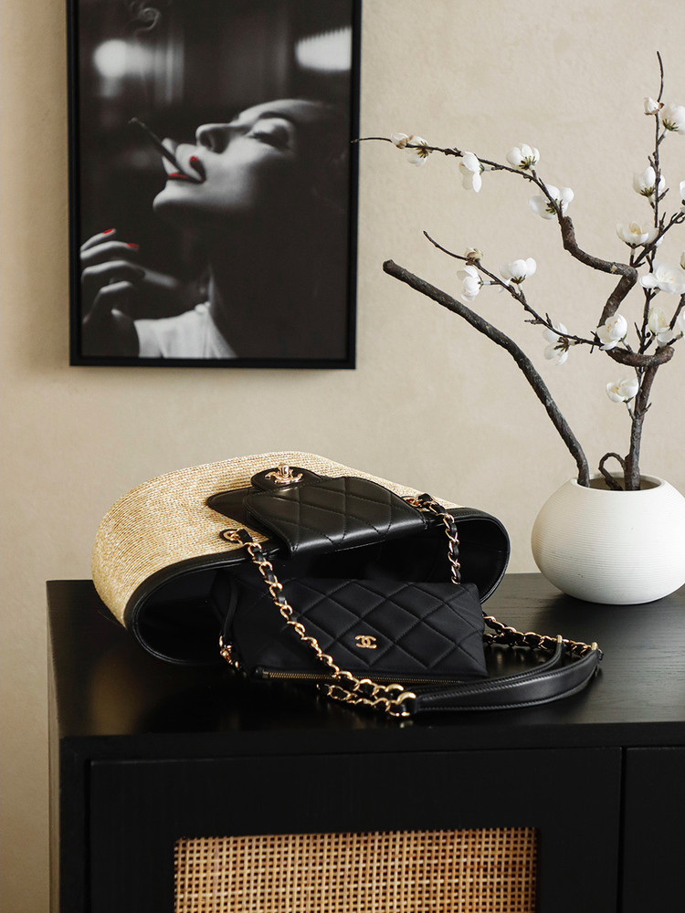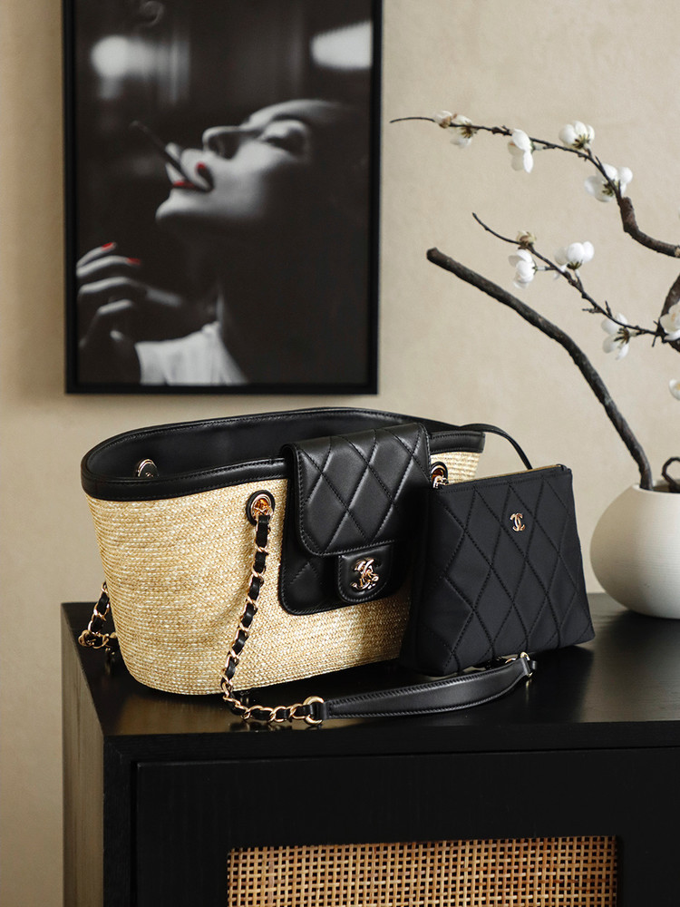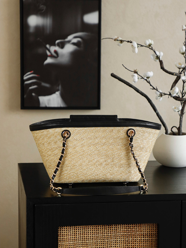 디자인: 샤넬 26C 크루즈 컬렉션의 최신상으로, 휴양지의 낭만을 담은 바스켓 쇼퍼백입니다. 메인 백과 내부 파우치가 세트인 자모백 구성으로 수납 효율을 높였습니다.