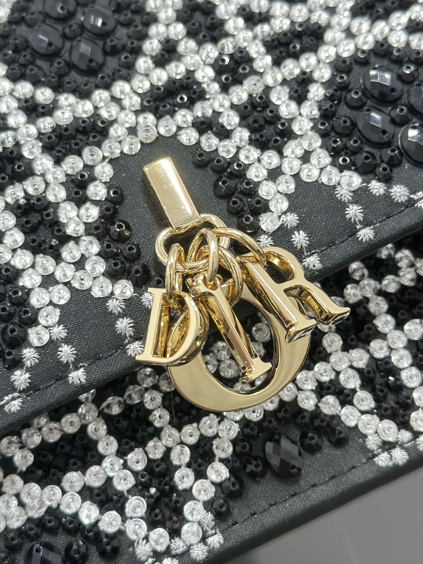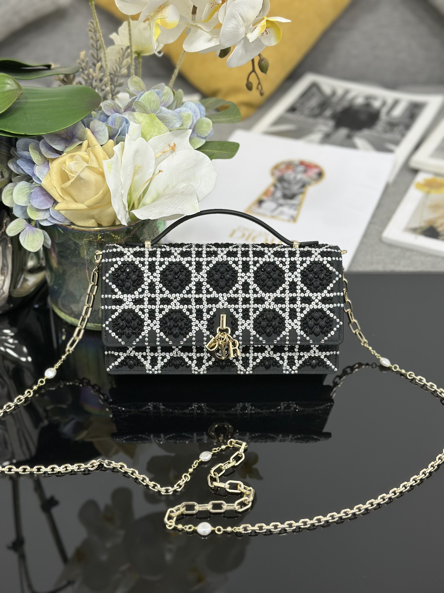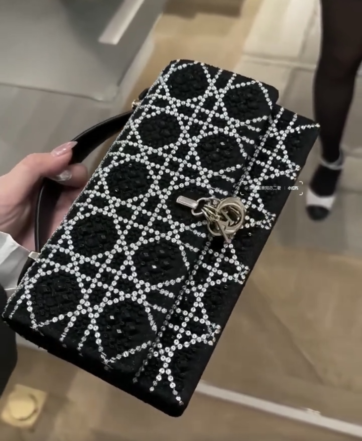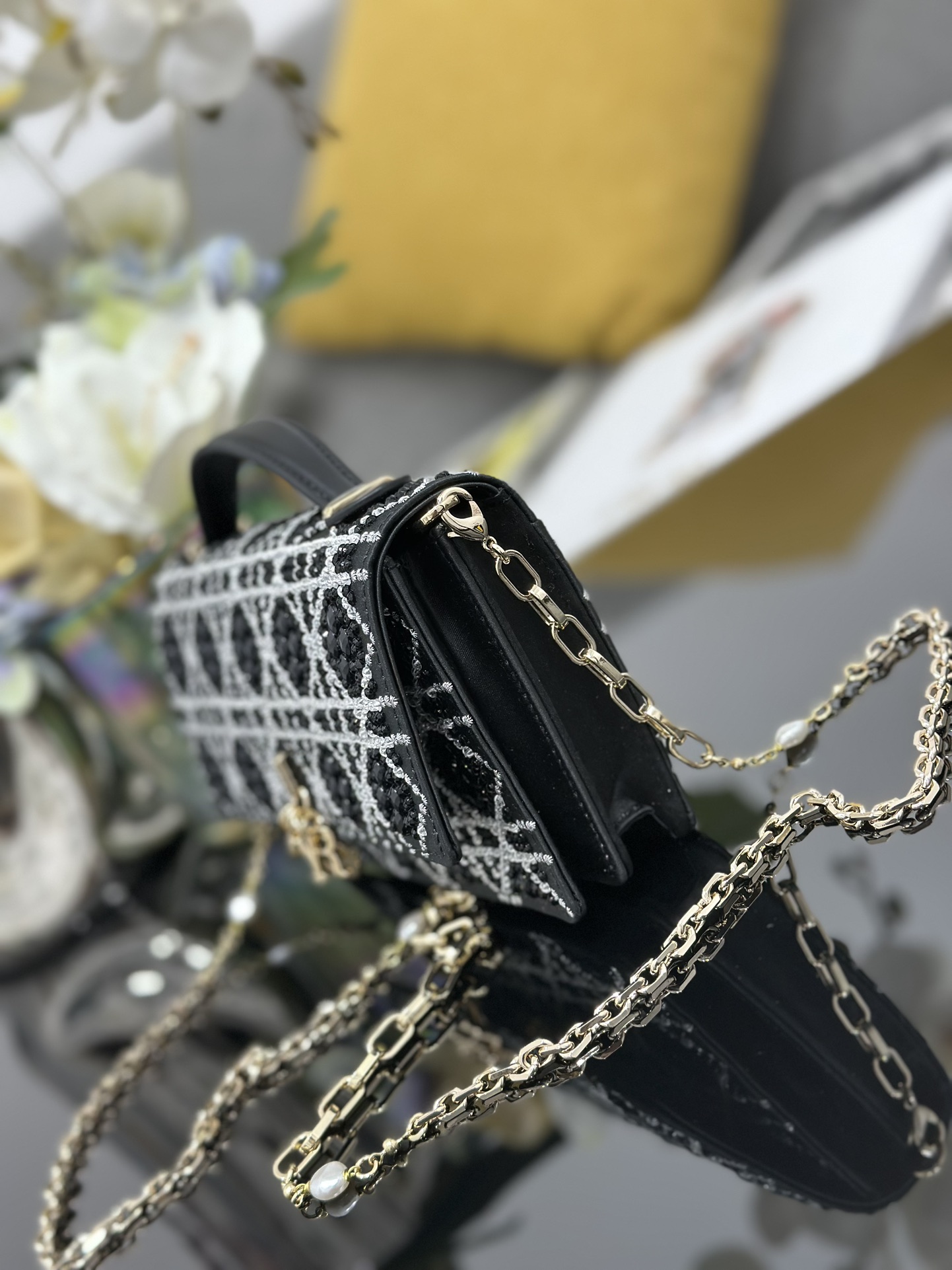 디자인: 우아함과 실용성을 겸비한 미스 디올 라인의 신제품입니다. 유려한 유성(Shooting Star) 퀼팅 라인을 따라 장식된 크리스탈 자수가 밤하늘처럼 영롱하게 빛나는 디자인입니다.