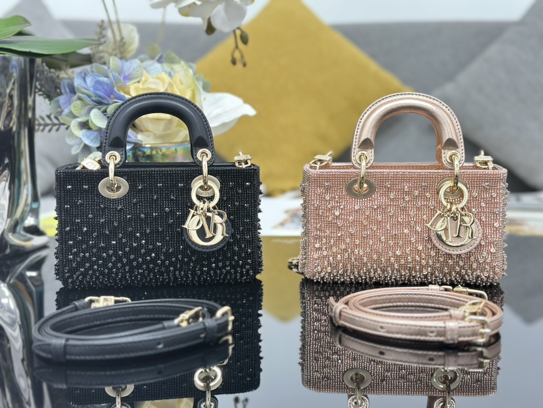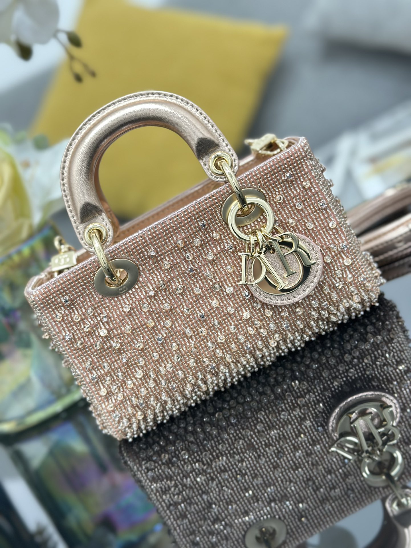 디테일: 연한 골드(Light Gold) 마감의 D.I.O.R. 참이 핑크 비즈와 어우러져 더욱 화사하고 우아한 분위기를 완성합니다.