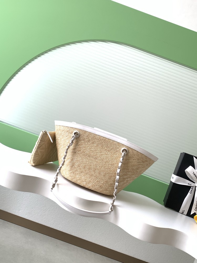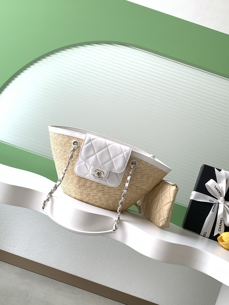 소재 및 디테일: 가벼운 라피아 소재에 샤넬의 상징인 다이아몬드 퀼팅 가죽 포켓이 더해졌으며, 화이트 가죽 핸들과 메탈 체인 스트랩이 정교하게 어우러져 있습니다. 정면의 더블 C 로고가 확실한 포인트가 됩니다.