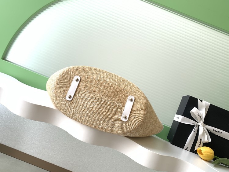 소재 및 포인트: 가벼운 라피아 바디에 샤넬의 시그니처인 다이아몬드 퀼팅 가죽 디테일이 더해져 캐주얼하면서도 럭셔리한 무드를 놓치지 않았습니다. 정면의 더블 C 로고와 가죽 믹스 메탈 체인이 브랜드 특유의 정체성을 강조합니다.