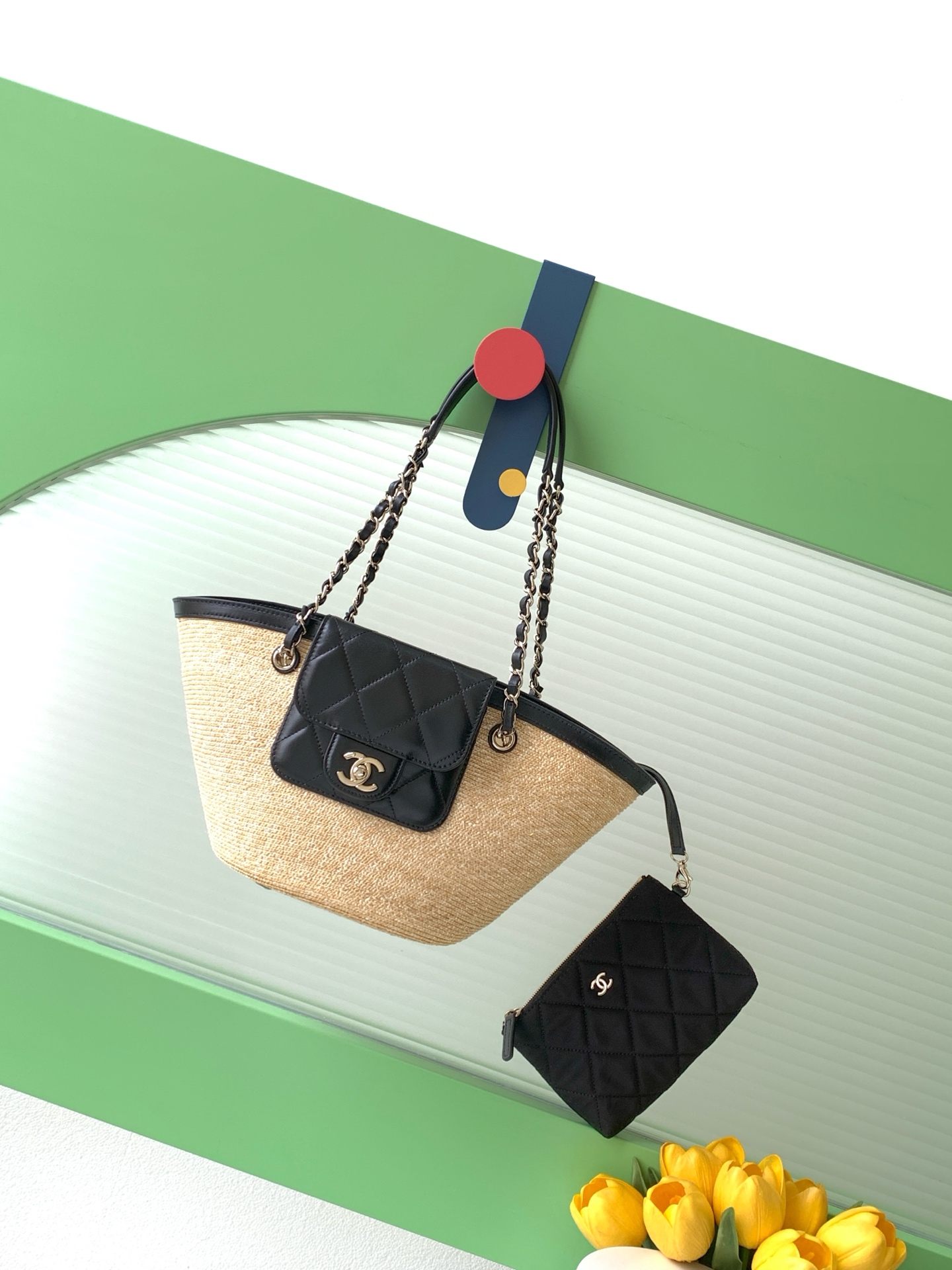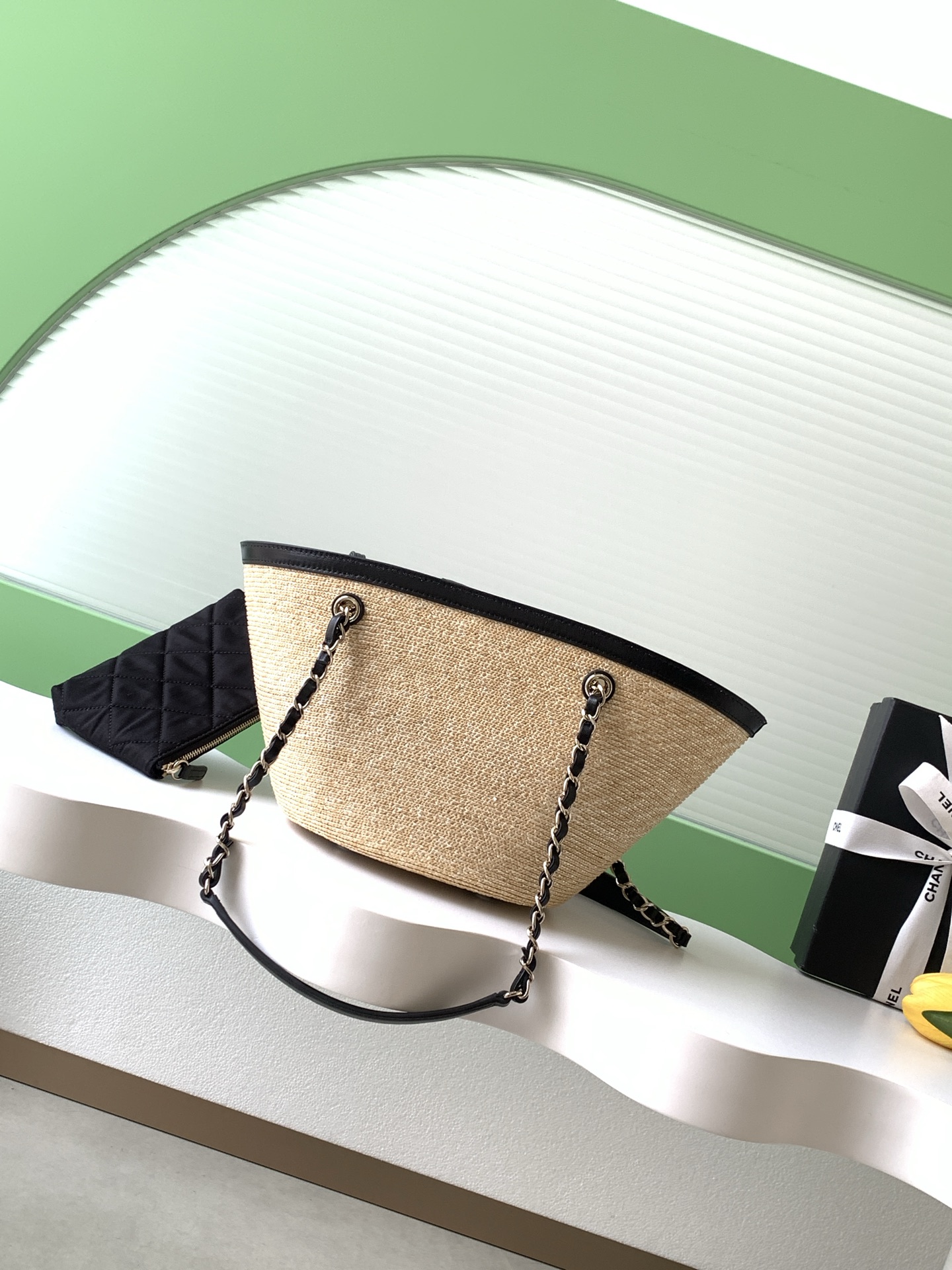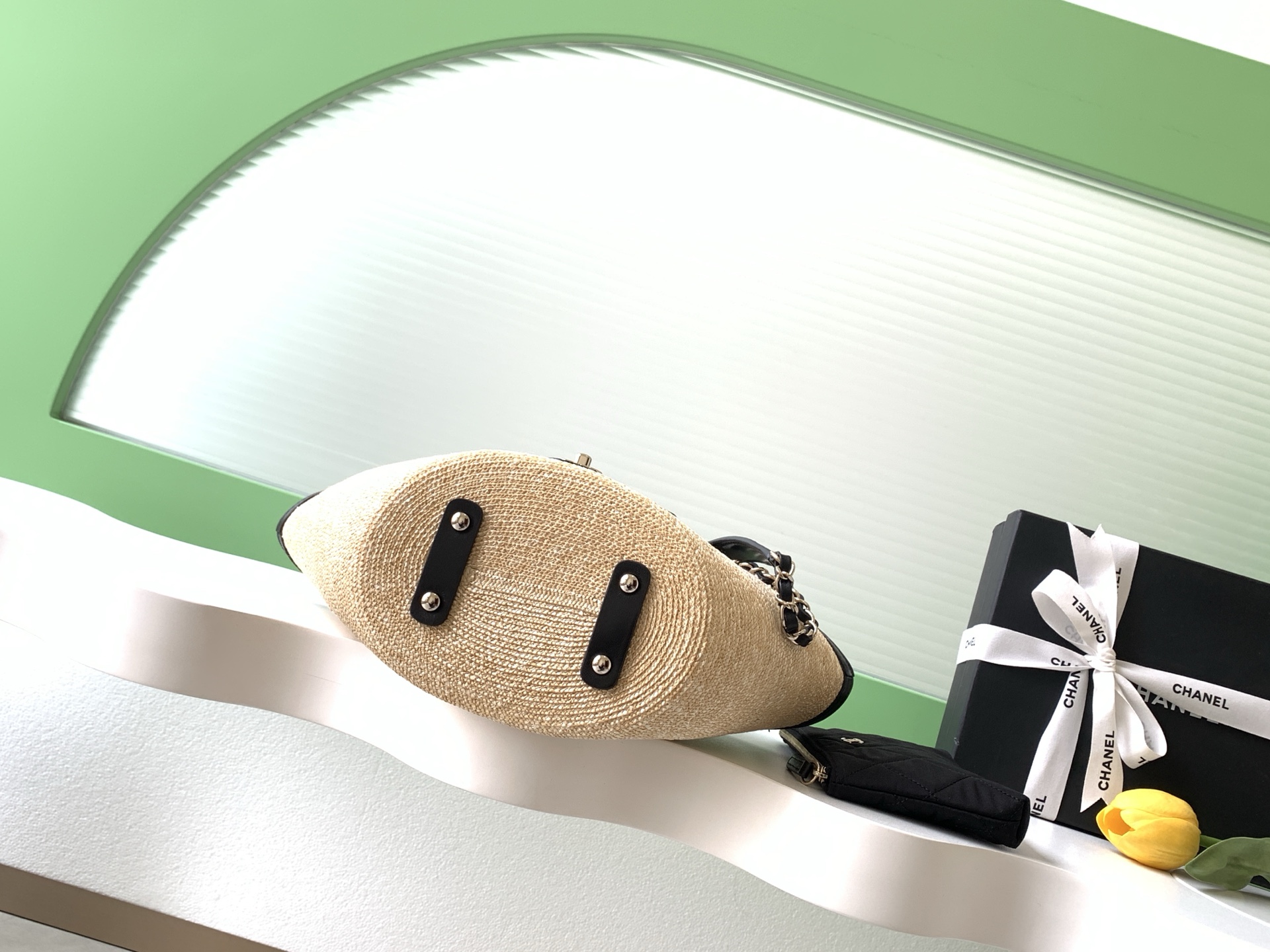 디자인: 이탈리아 리조트 무드에서 영감을 받은 26C 크루즈 컬렉션의 신상 바스켓 백입니다. 내추럴한 **라피아**와 시크한 블랙 가죽의 대비가 돋보이며, 여름의 가벼움과 샤넬의 클래식함을 동시에 갖췄습니다.