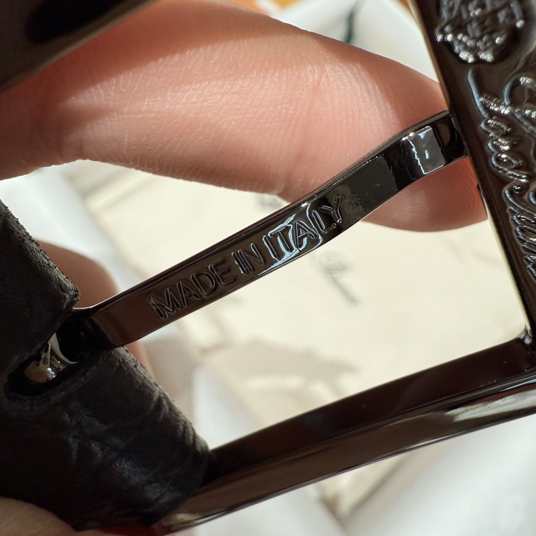 디테일: 로고가 각인된 팔라듐 도금 금속 사각 버클
