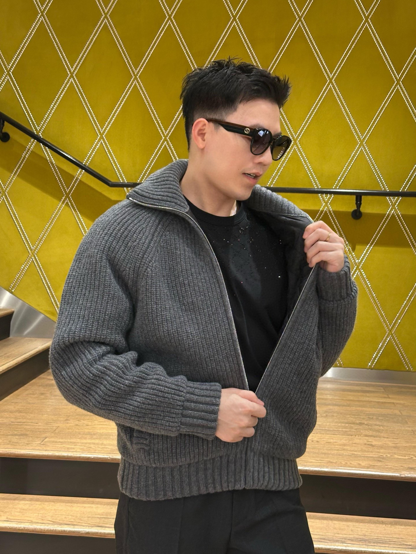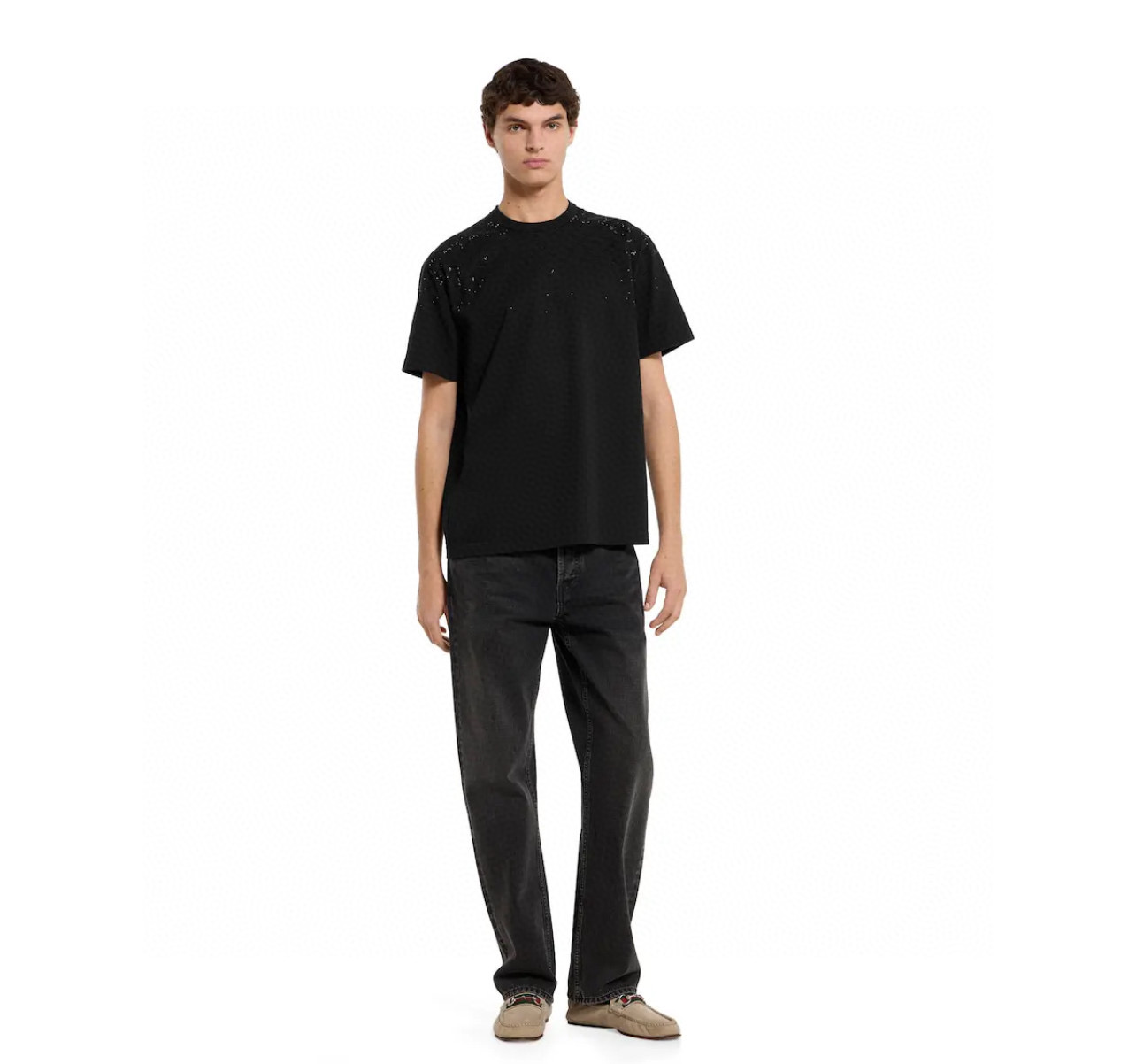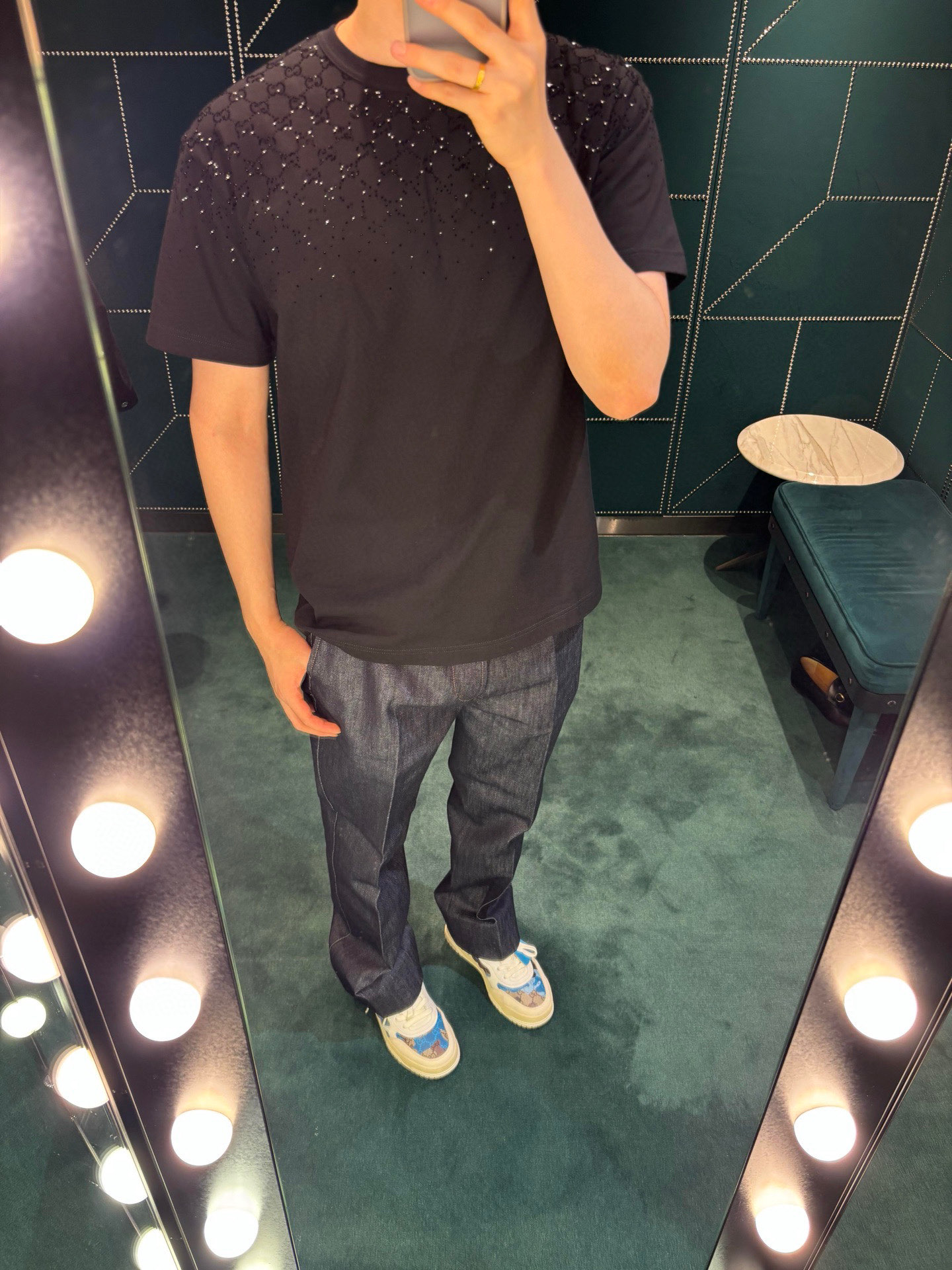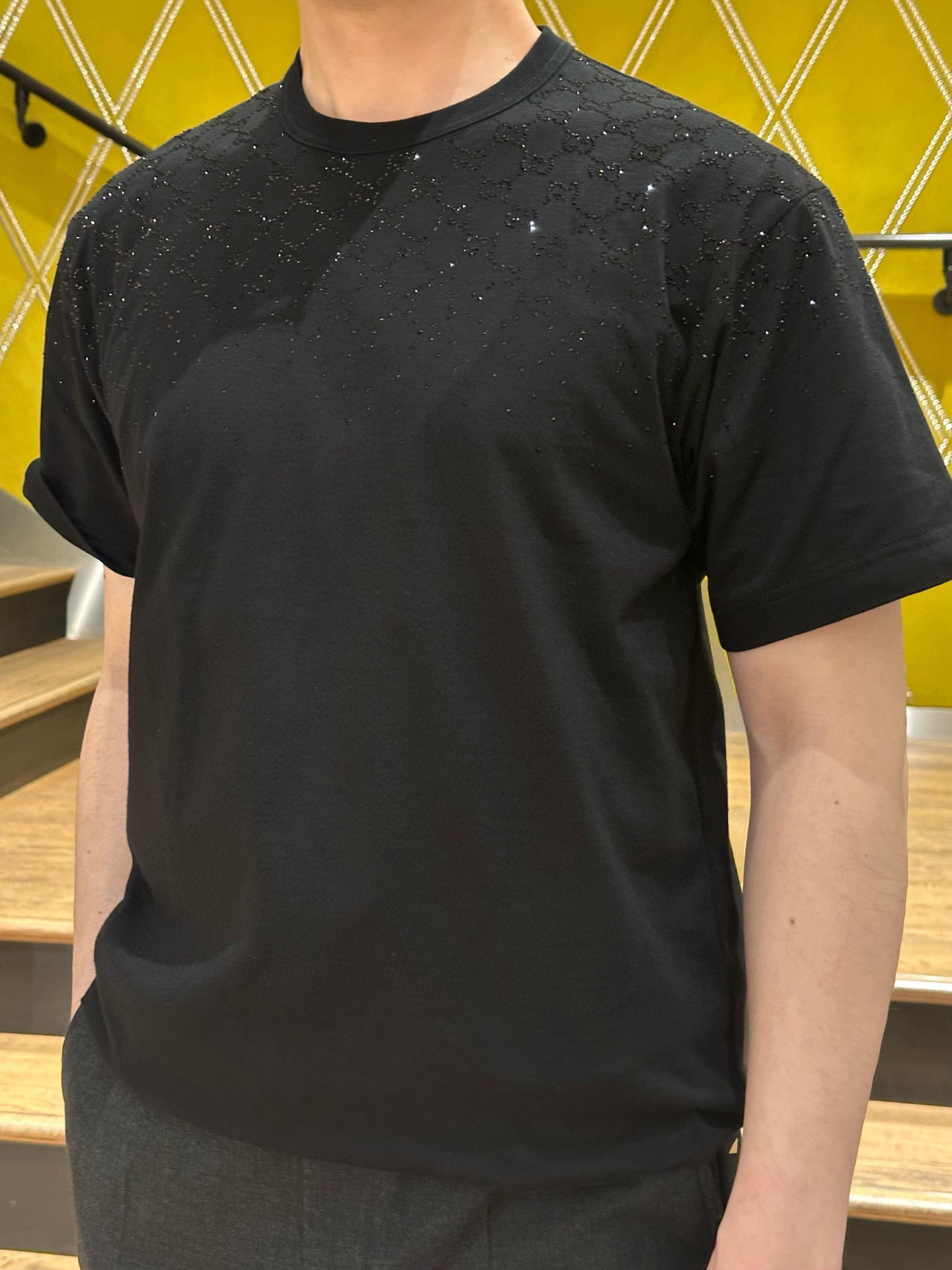디자인: SS26 신상, 크리스탈급 **핫픽스(스톤)**를 사용한 그라데이션 더블G 로고 디자인
