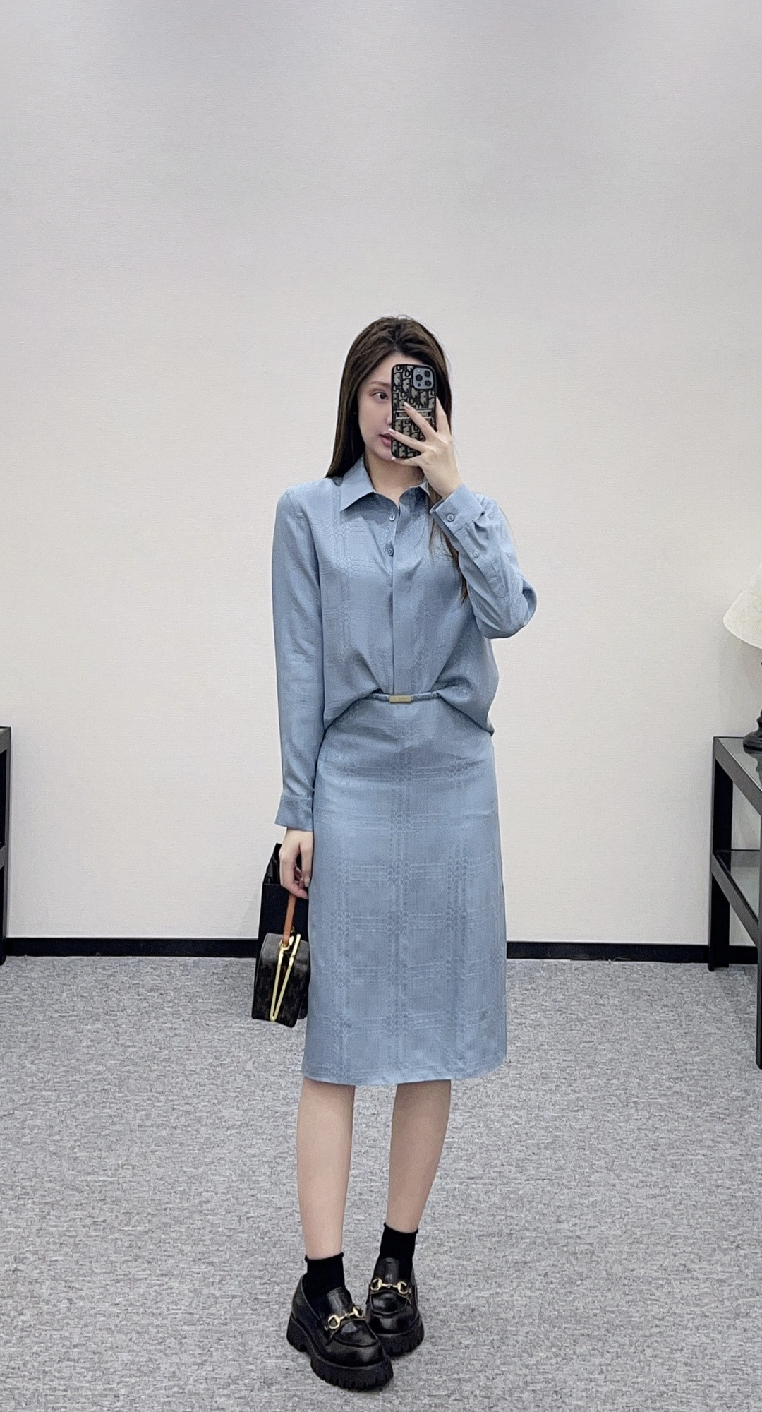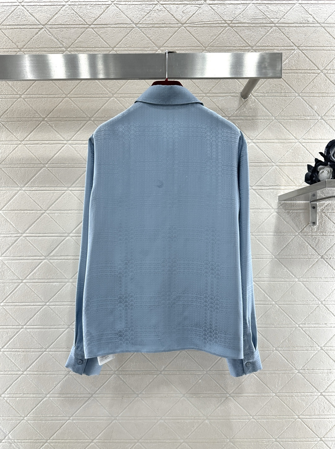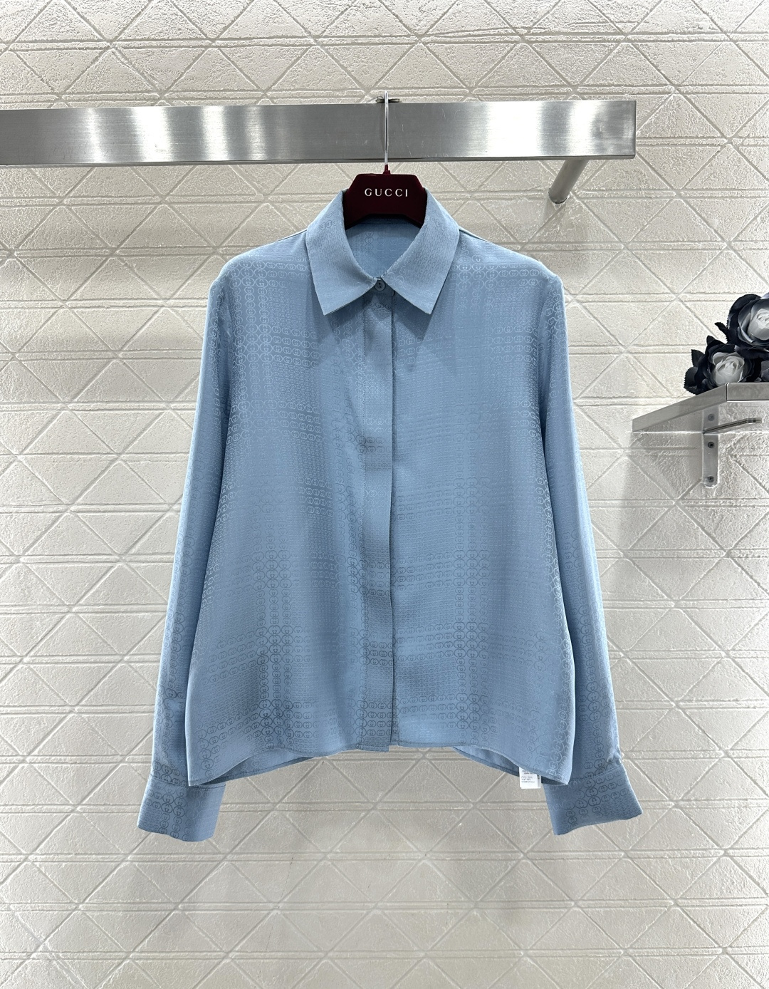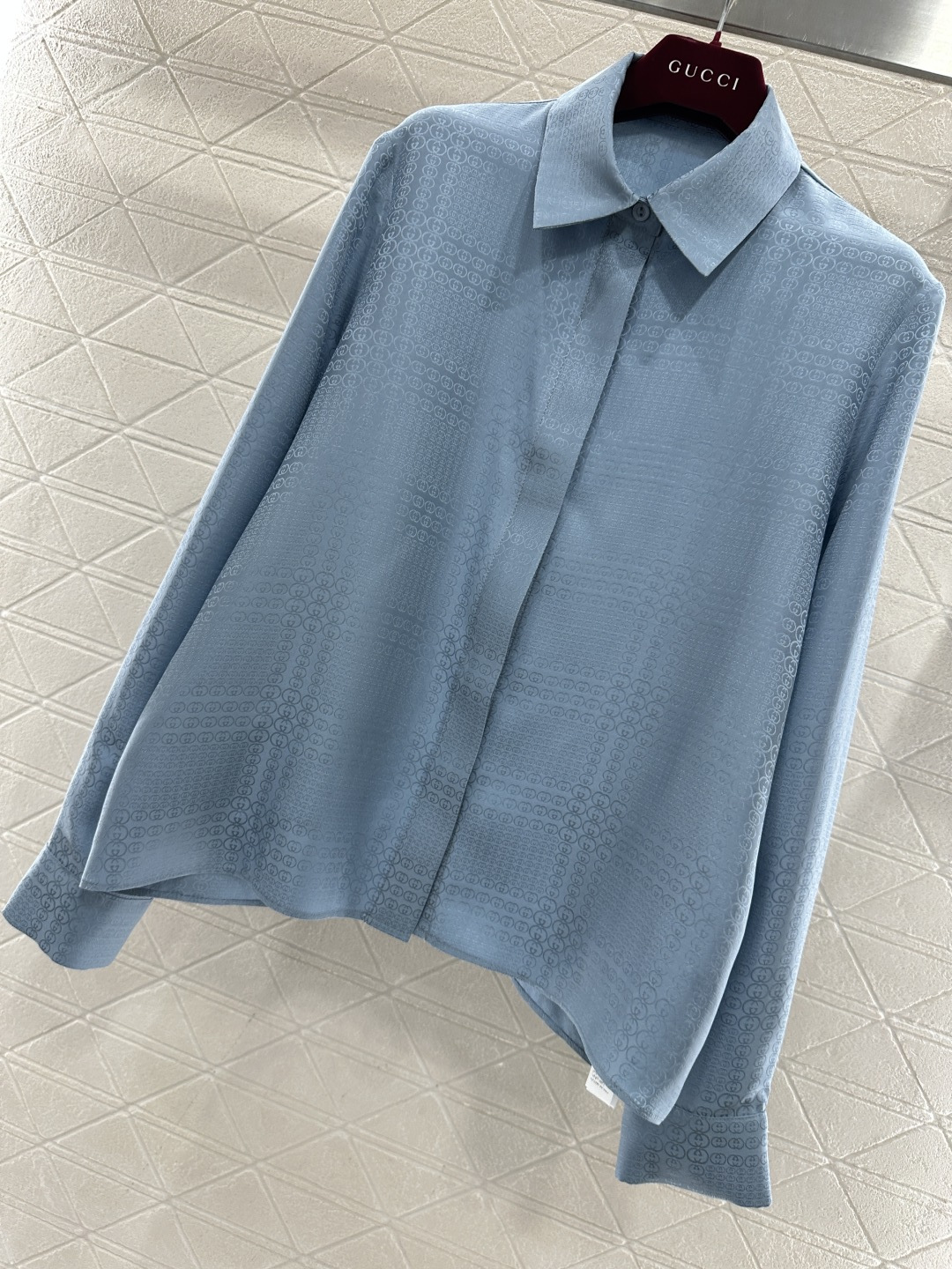 디자인: 우아한 뮤트 블루 컬러에 은은한 더블G 암문 자카드 패턴이 들어간 럭셔리 셋업