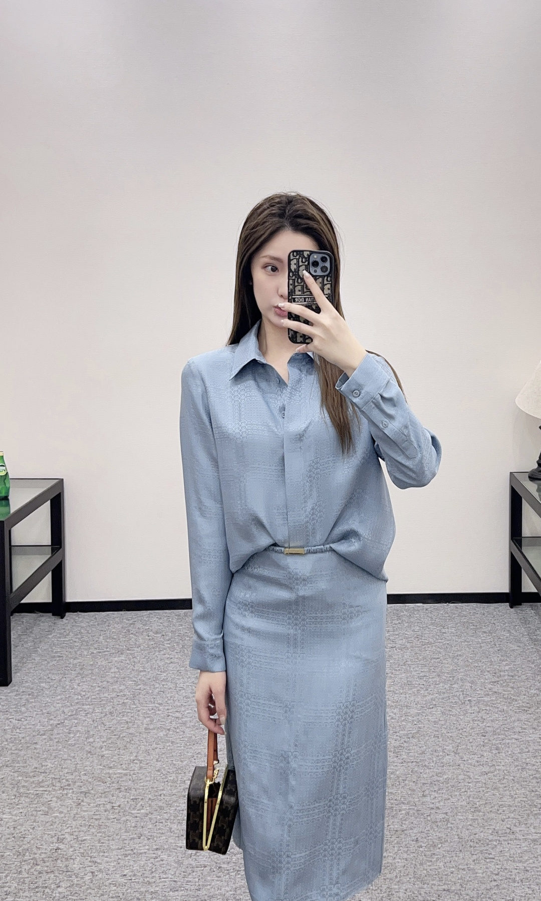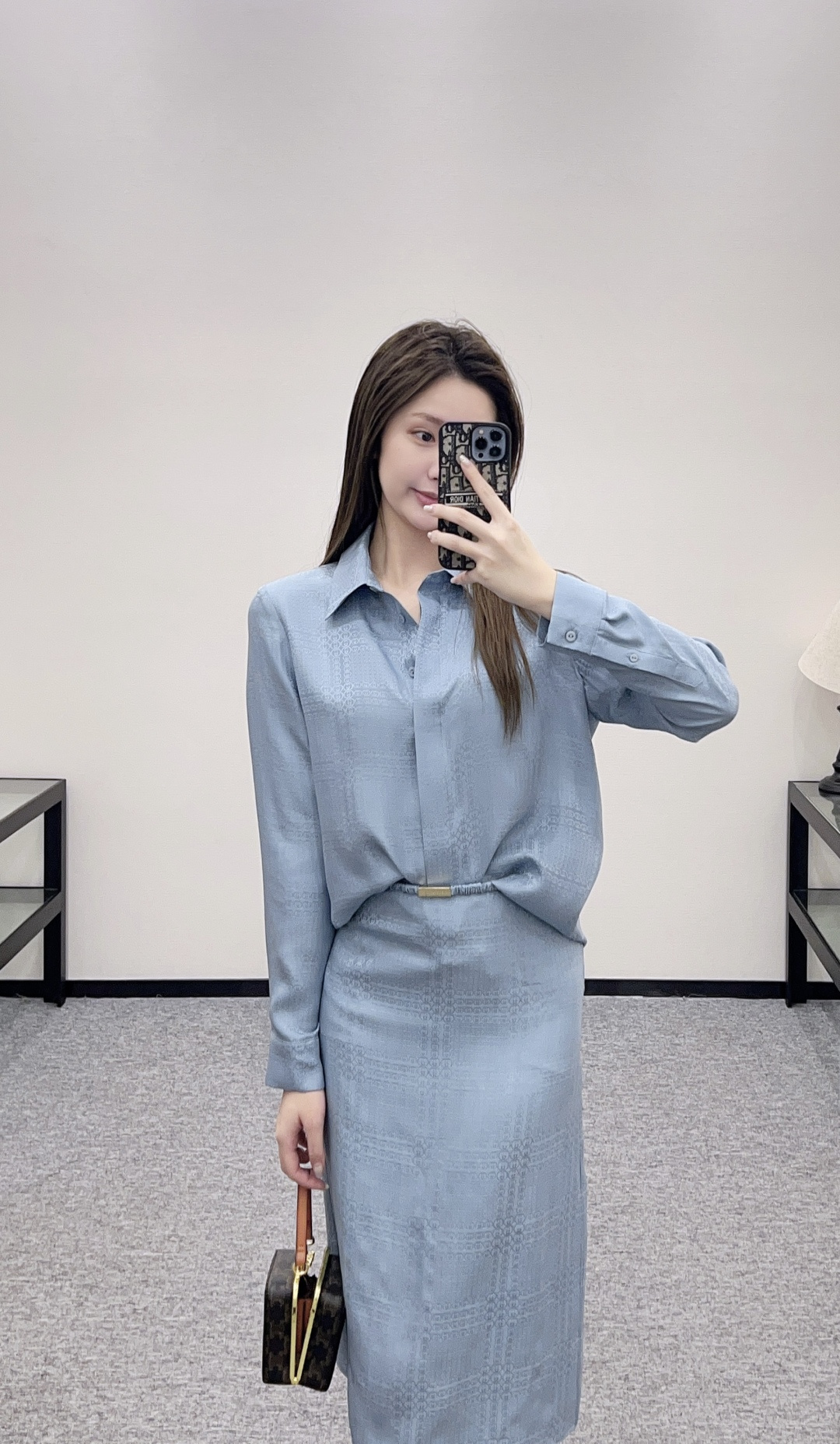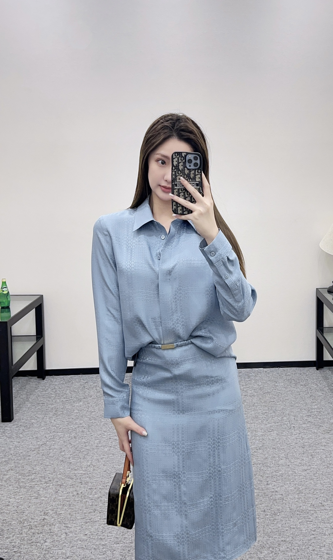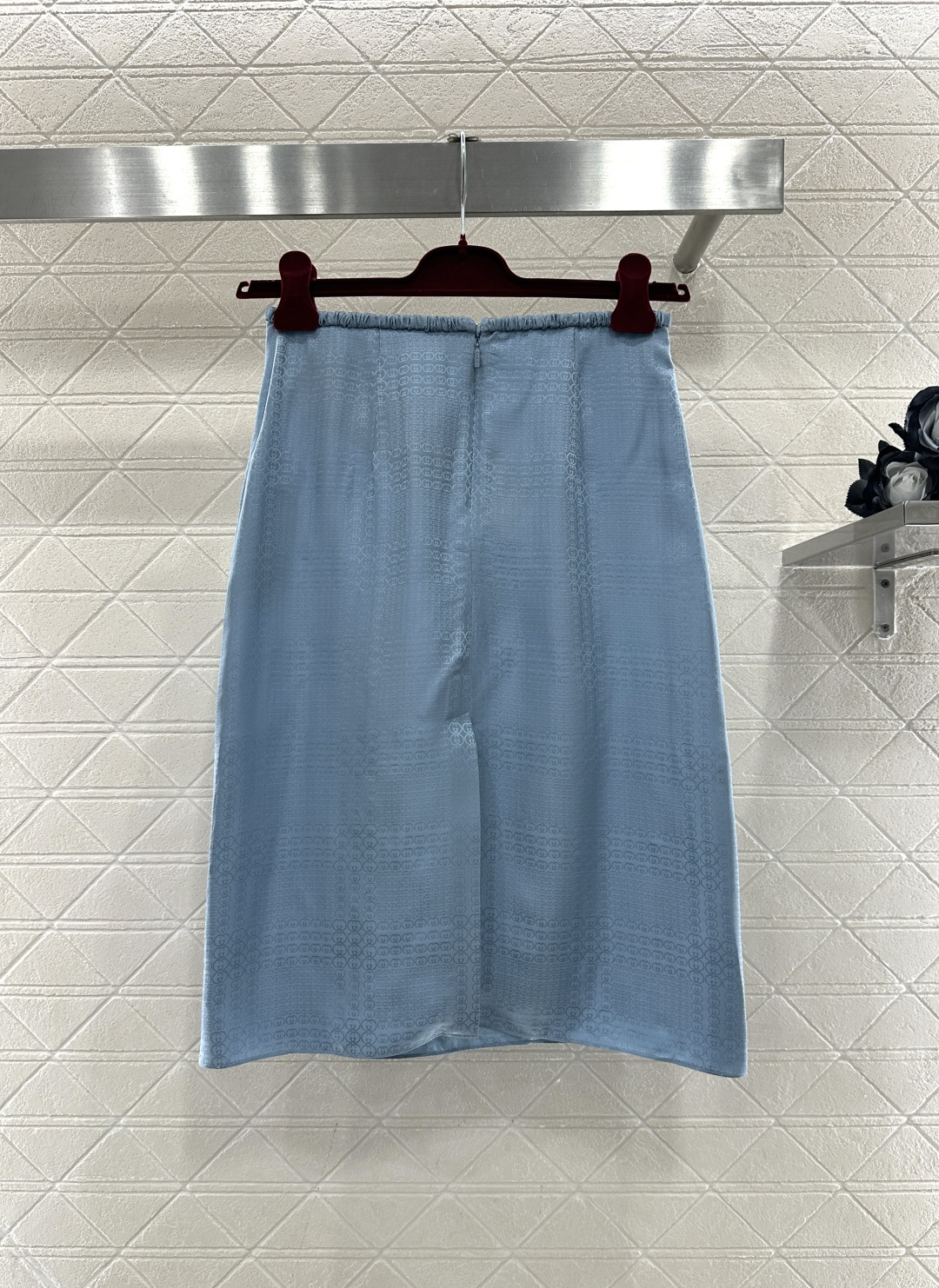 디자인: 우아한 뮤트 블루 컬러에 은은한 더블G 암문 자카드 패턴이 들어간 럭셔리 셋업
