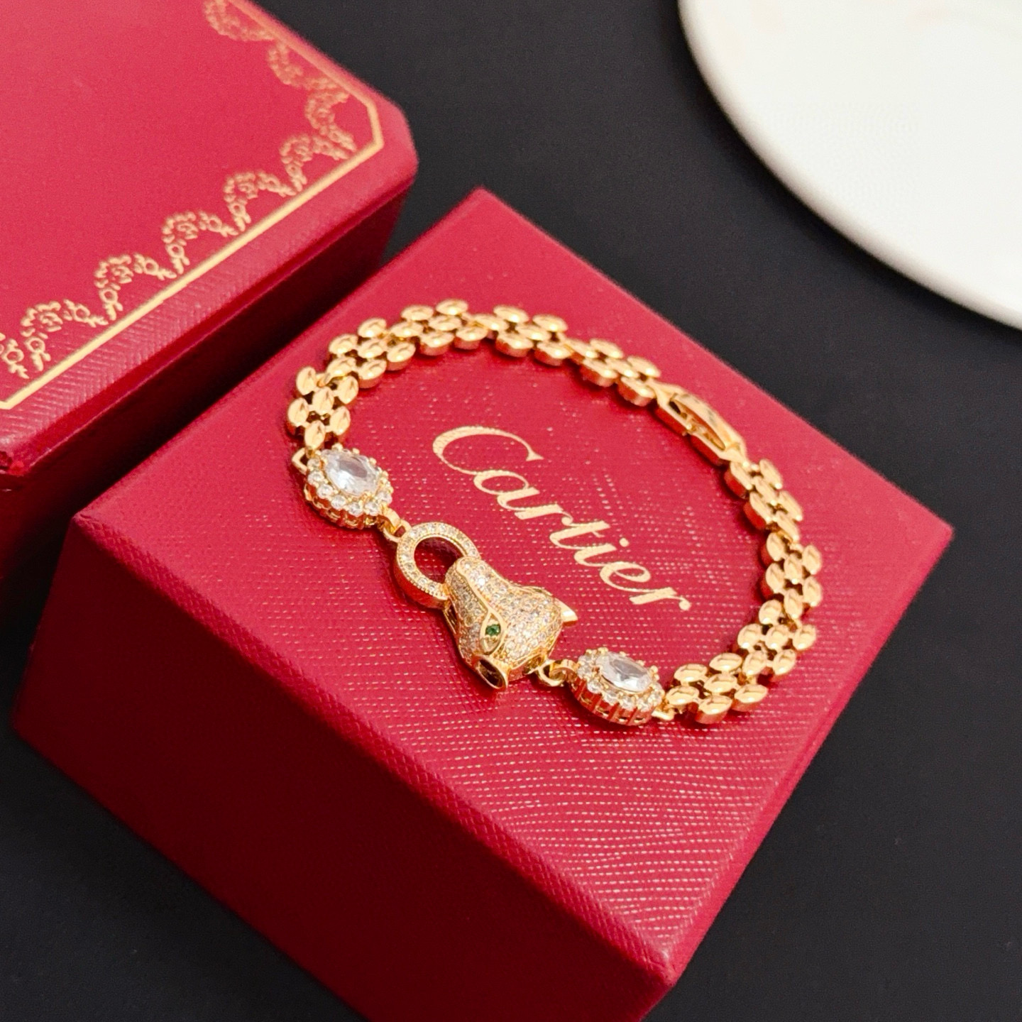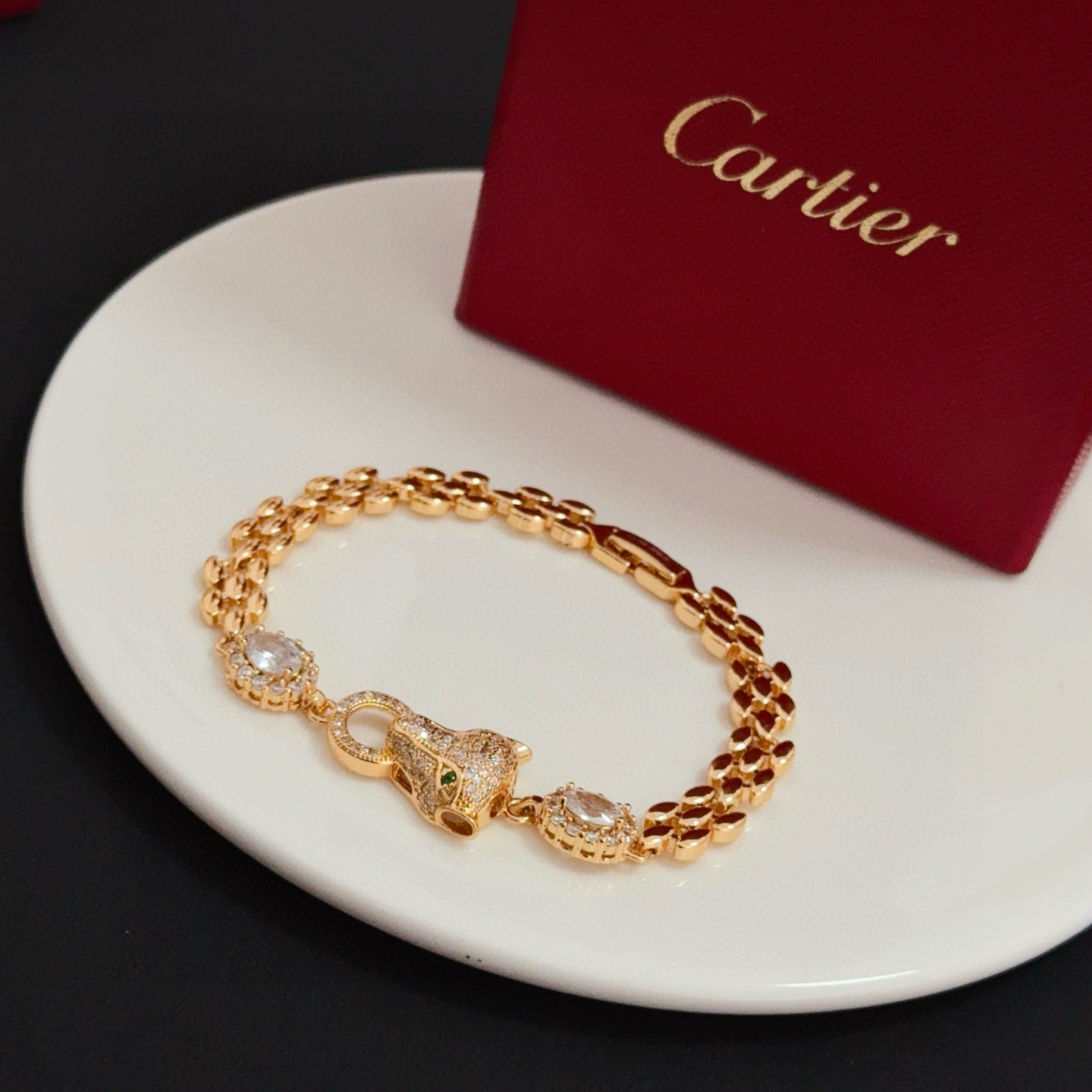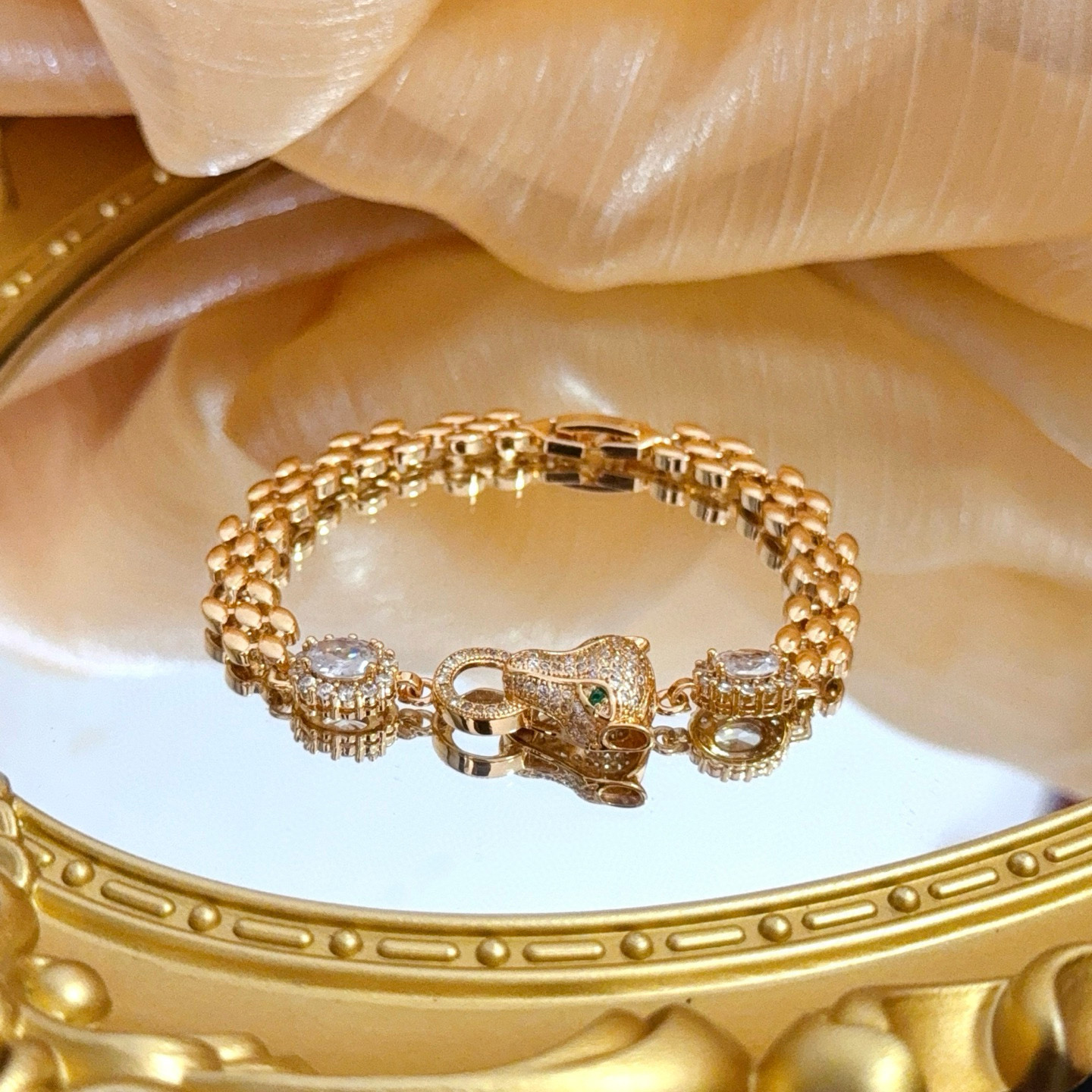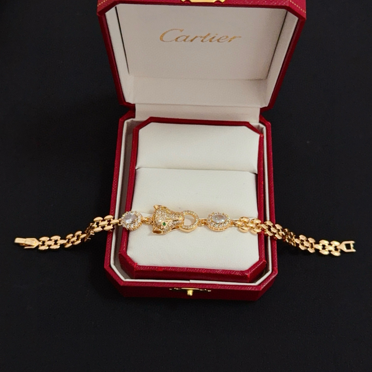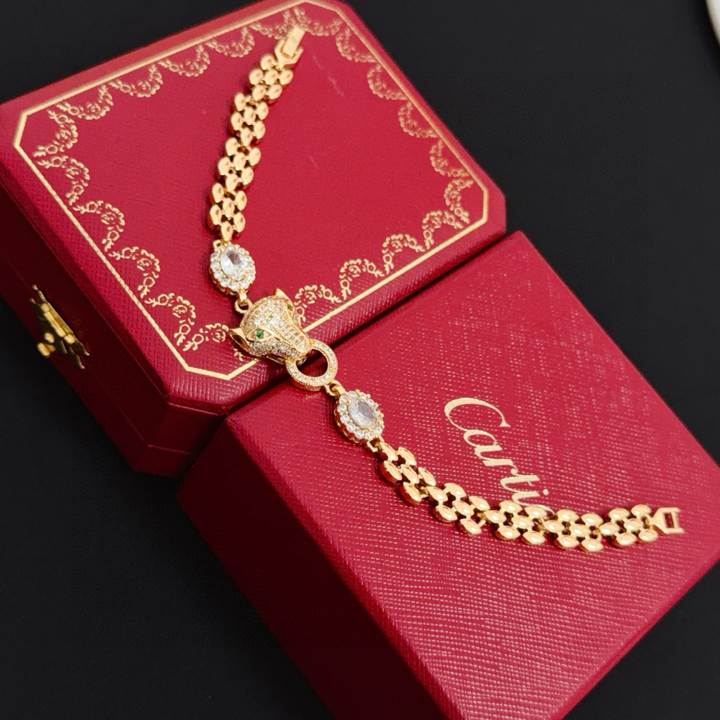 디자인: 까르띠에의 상징인 팬더(표범) 모티프가 돋보이는 체인형 팔찌