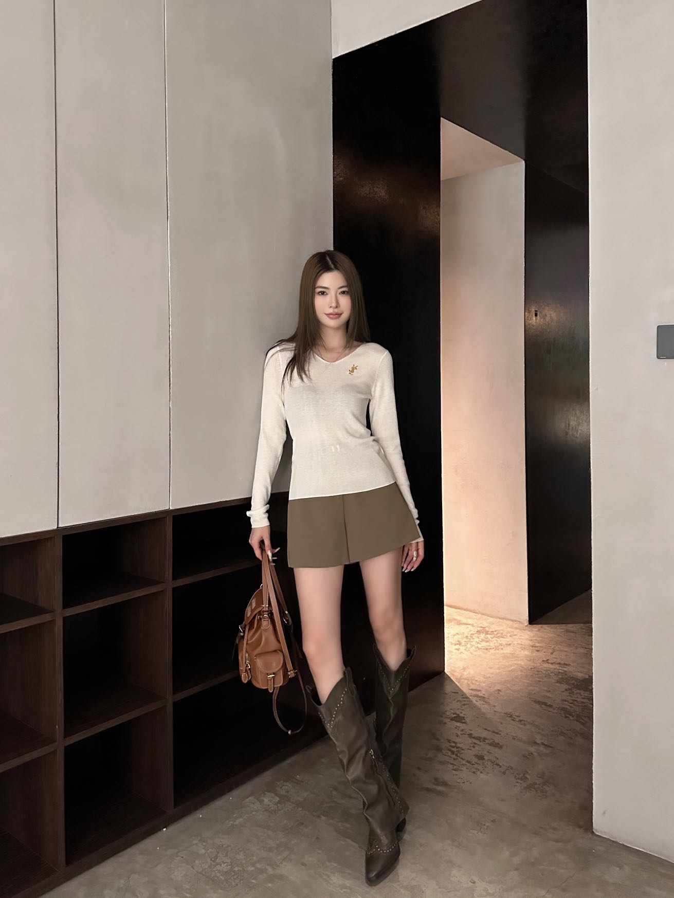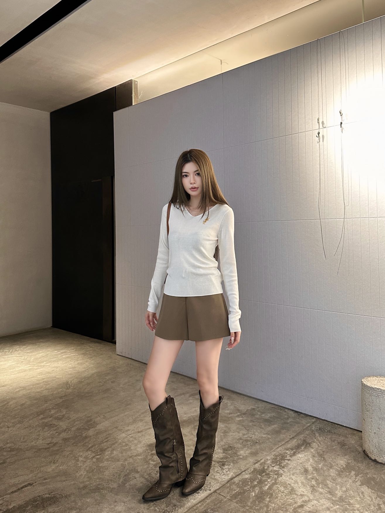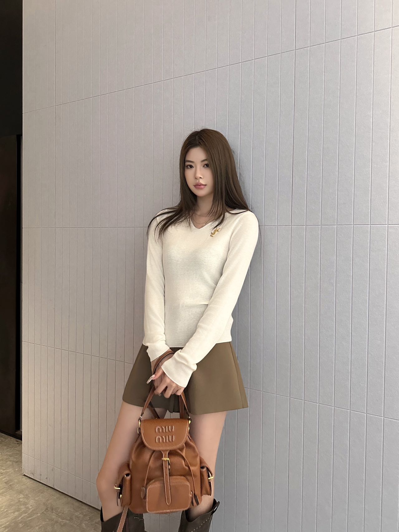디테일: 목선이 길어 보이는 세련된 V넥 라인과 쫀쫀한 조직감