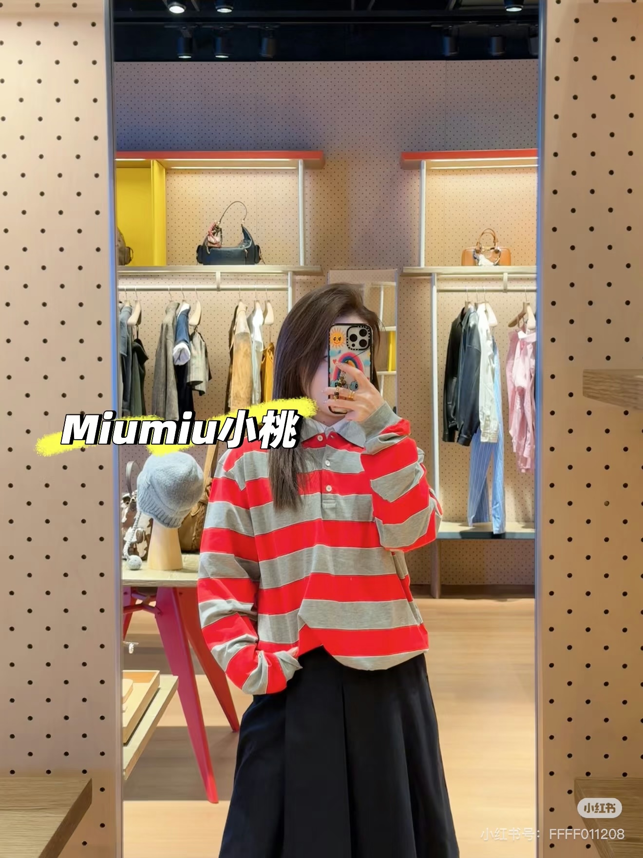 디자인: 세련된 스트라이프 패턴에 브랜드의 상징적인 레터링 로고 패치가 포인트로 더해져, 미우미우 특유의 프레피하고 사랑스러운 무드를 완성합니다.