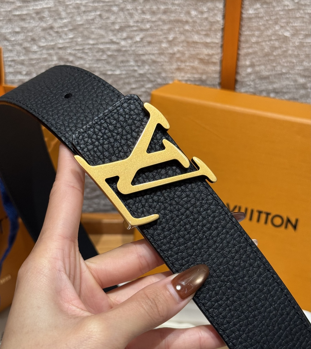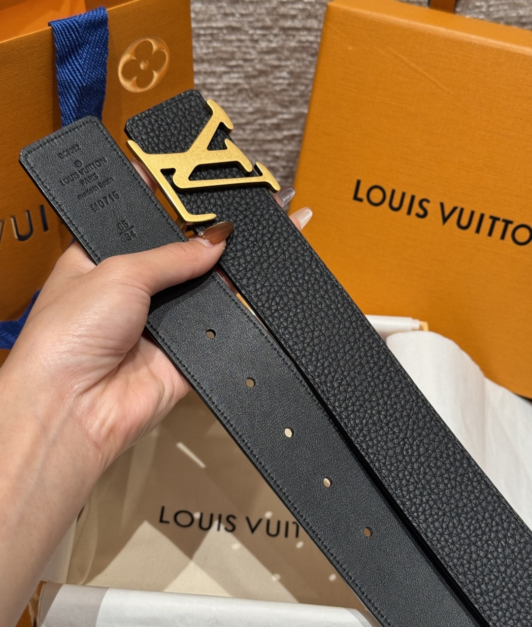 디자인: 브랜드의 상징적인 LV 이니셜 버클이 중앙에 배치되어 절제된 화려함과 현대적인 우아함을 보여줍니다.