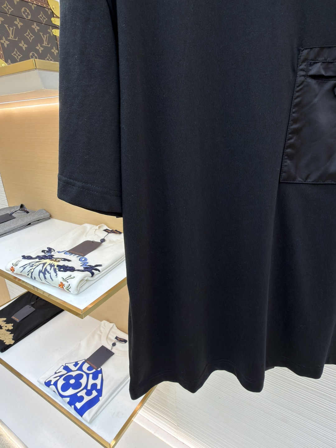 디테일: 가슴 전면에는 프라다 시그니처 삼각 로고를 포인트로 배치하고, 나일론 소재를 더한 포켓 디테일로 구조적인 실루엣을 완성함