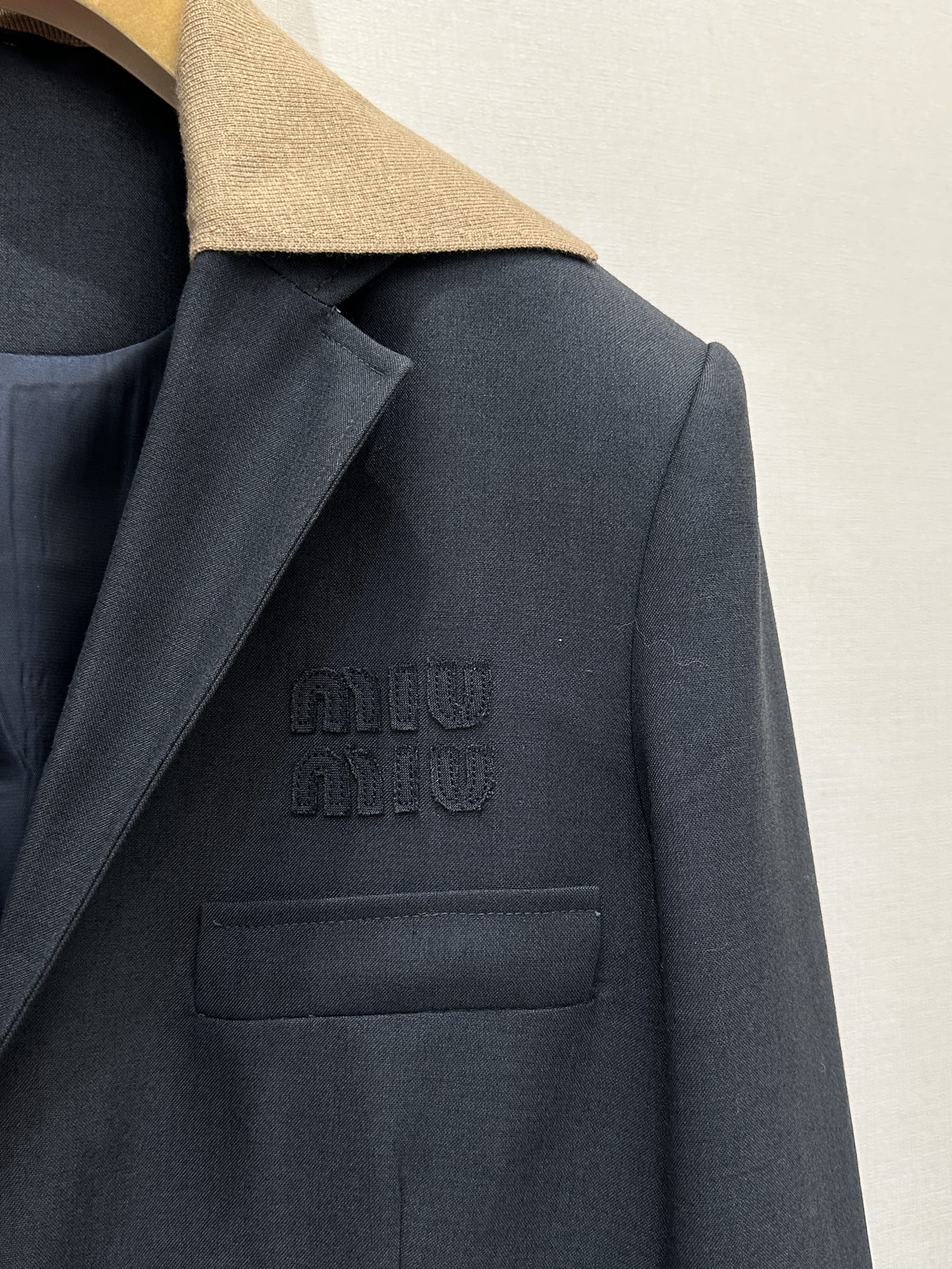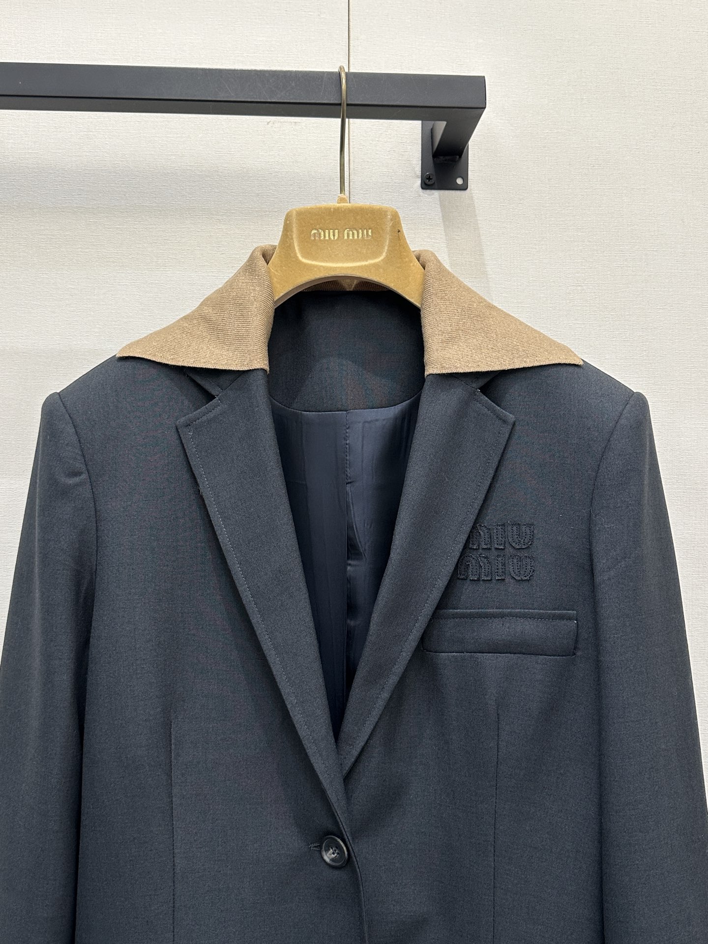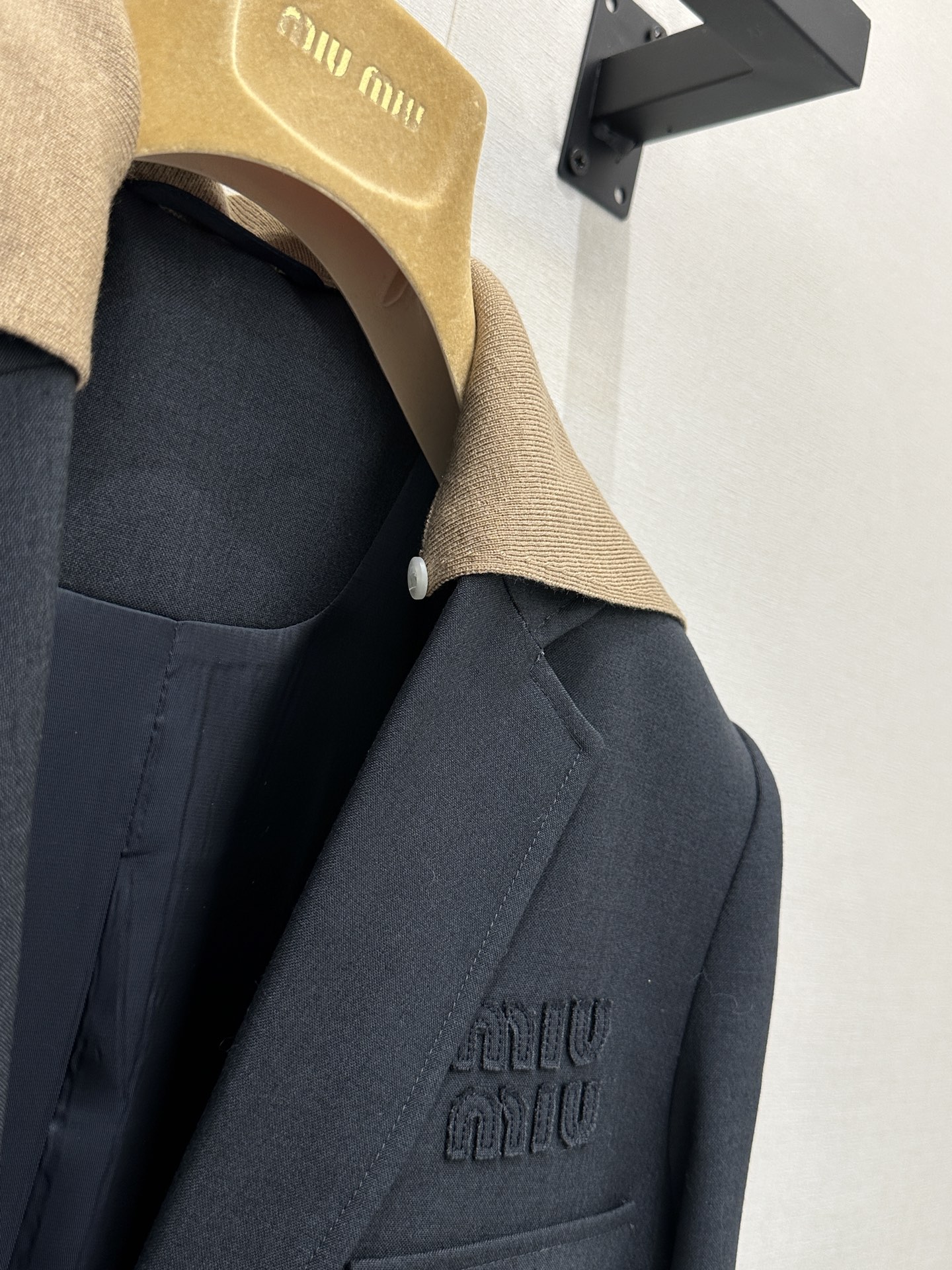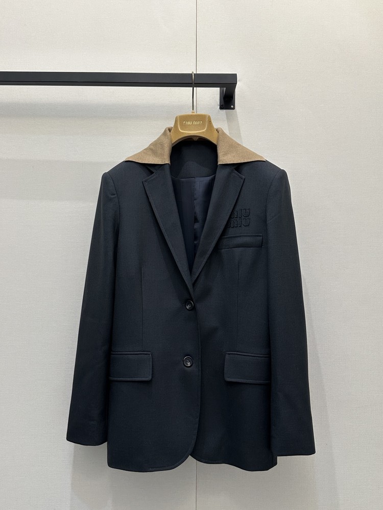 클래식한 수트 핏에 포근한 니트 디테일을 더한 미우미우 특유의 위트가 돋보이는 셋업입니다.