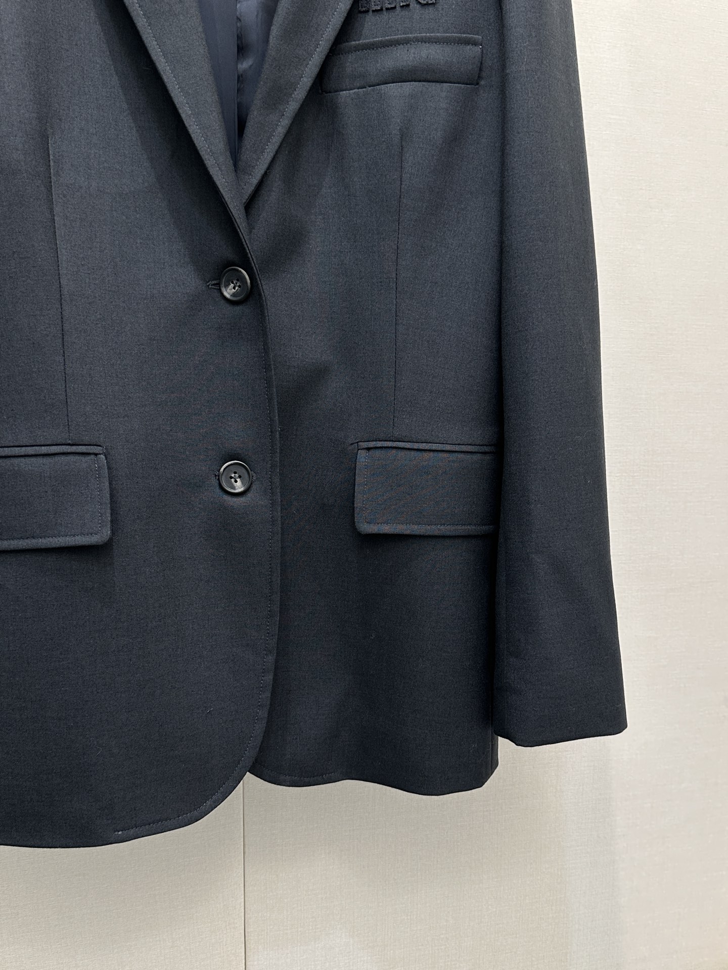 디자인: 세련된 피크드 라펠 자켓 + 가슴 입체 로고 휘장 포인트