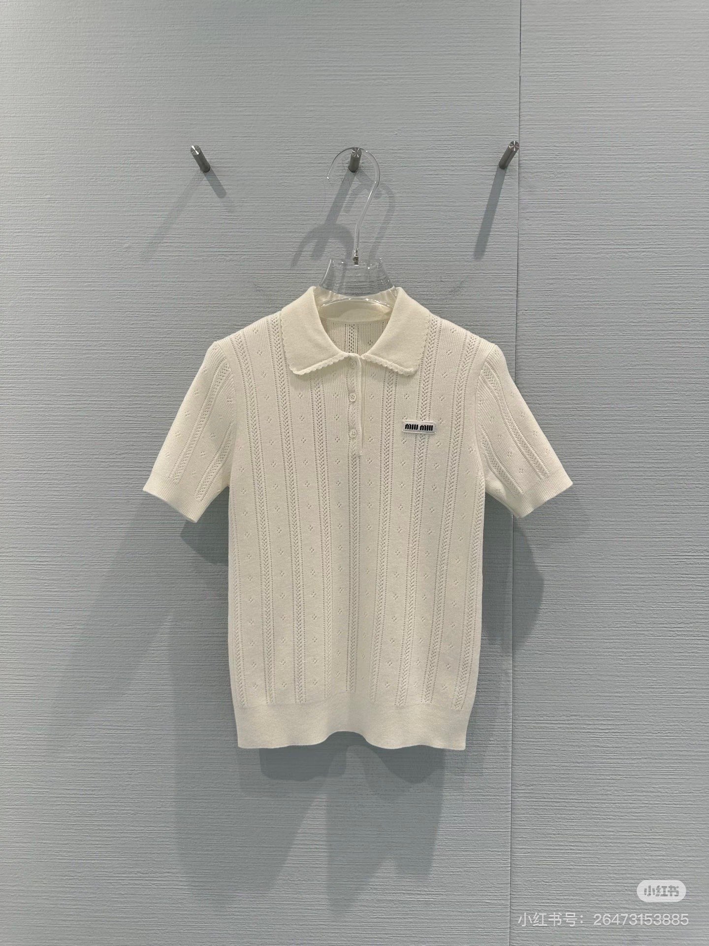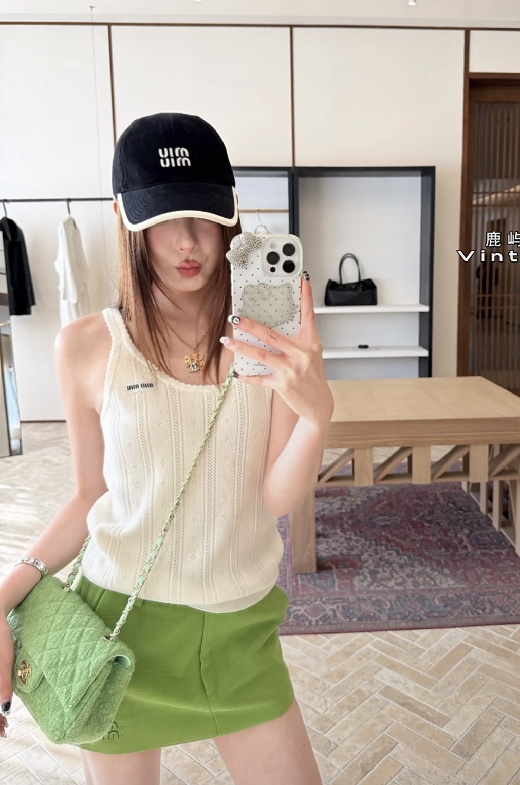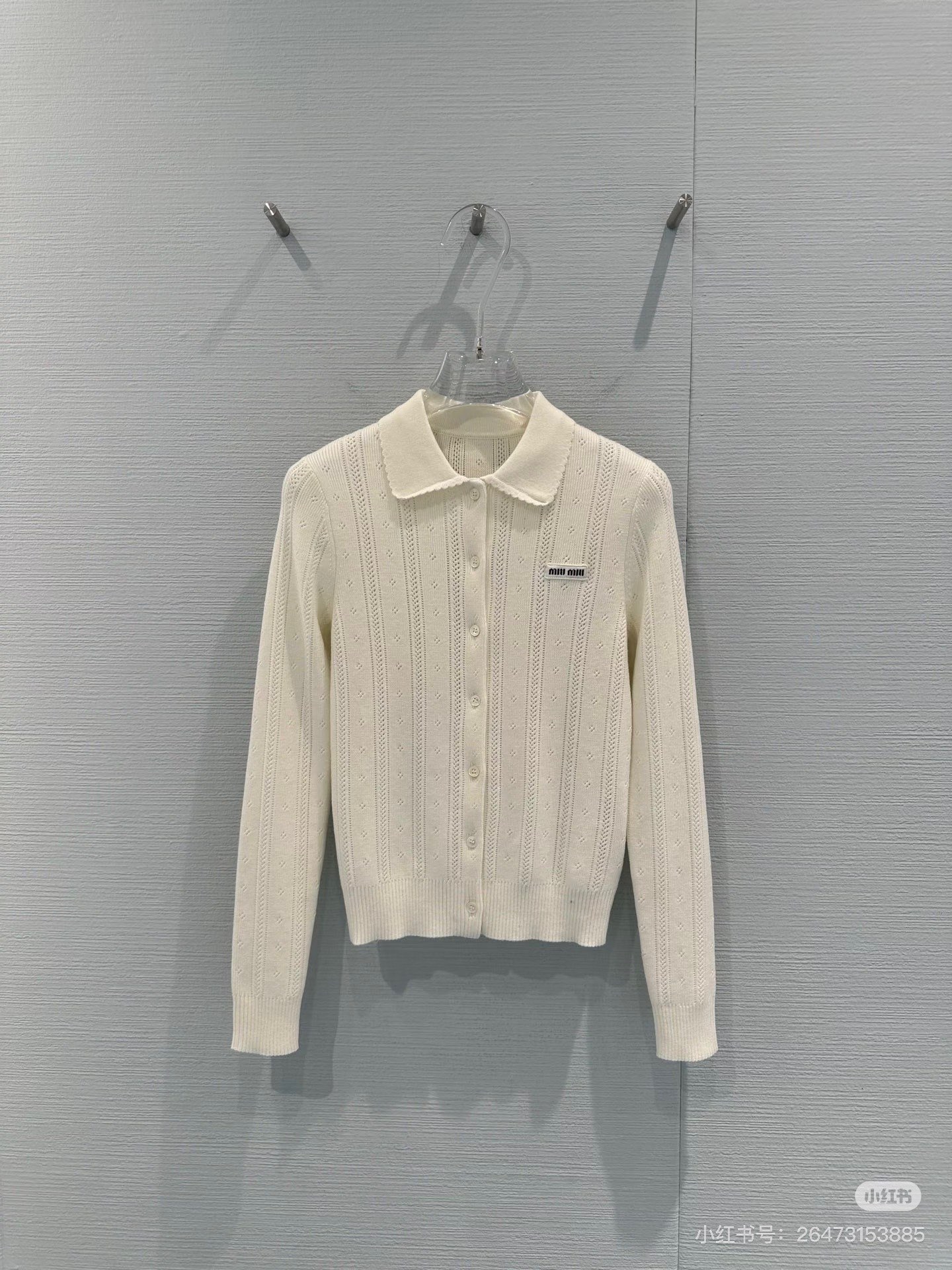 포인트: 가슴 부분의 미우미우 시그니처 로고 자수 포인트가 브랜드 특유의 무드 완성