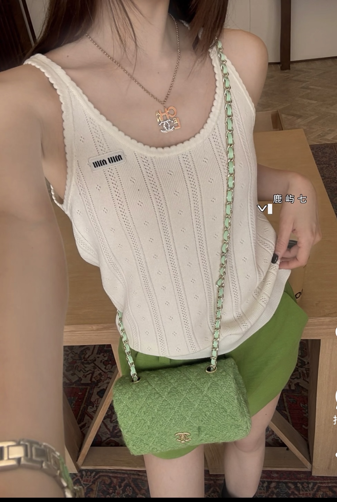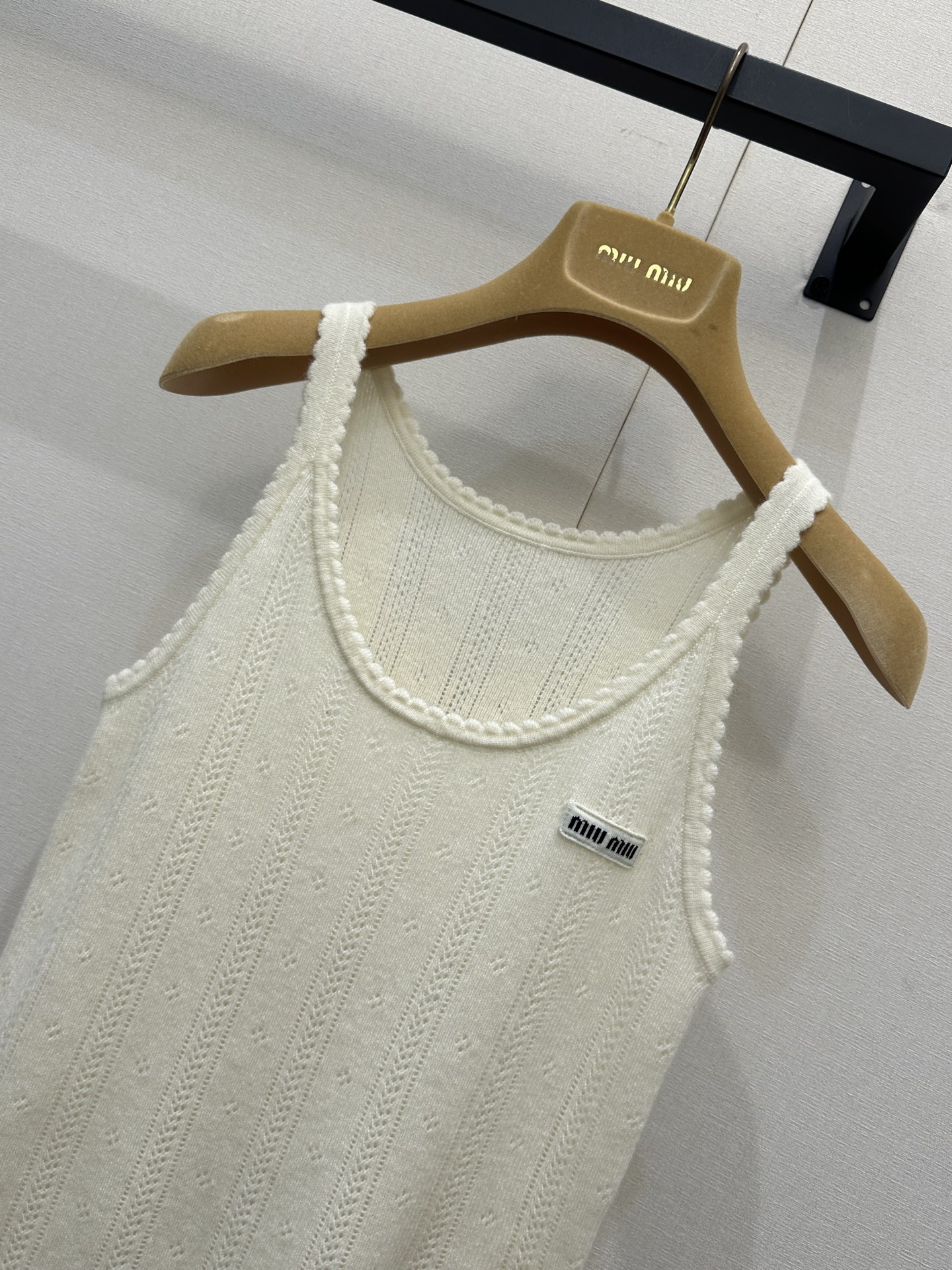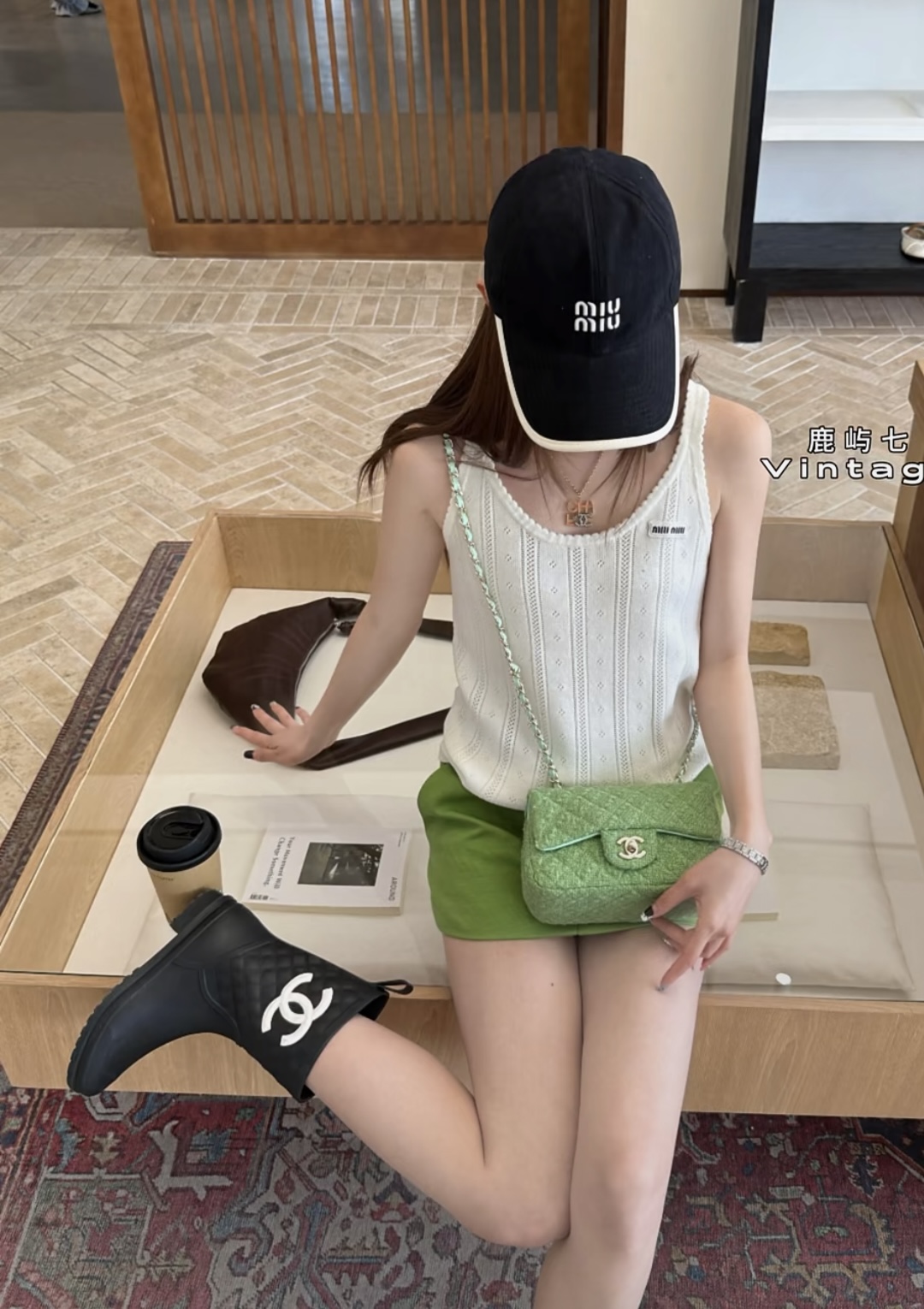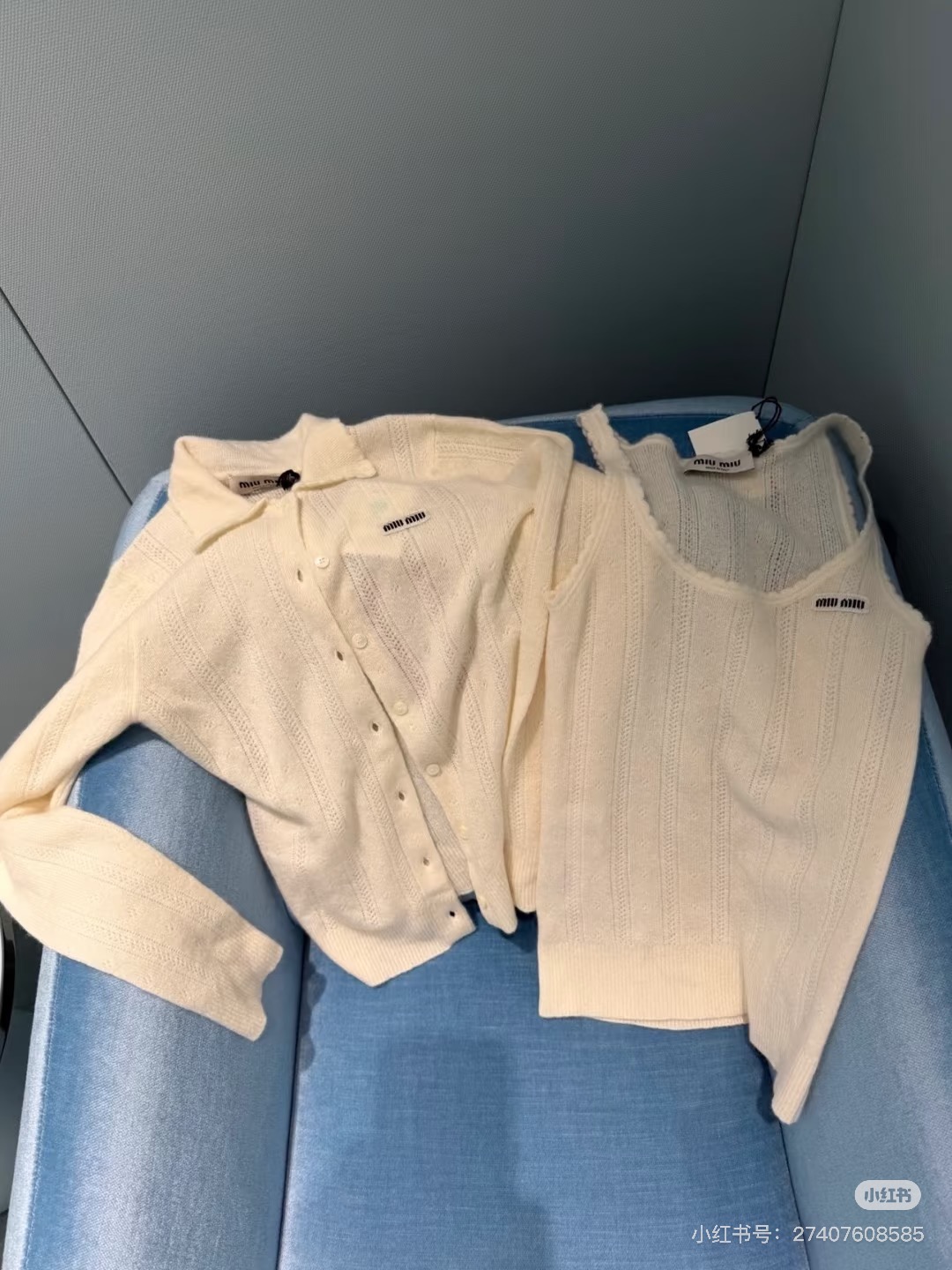 포인트: 가슴 부분의 미우미우 시그니처 로고 자수 포인트가 브랜드 특유의 무드 완성