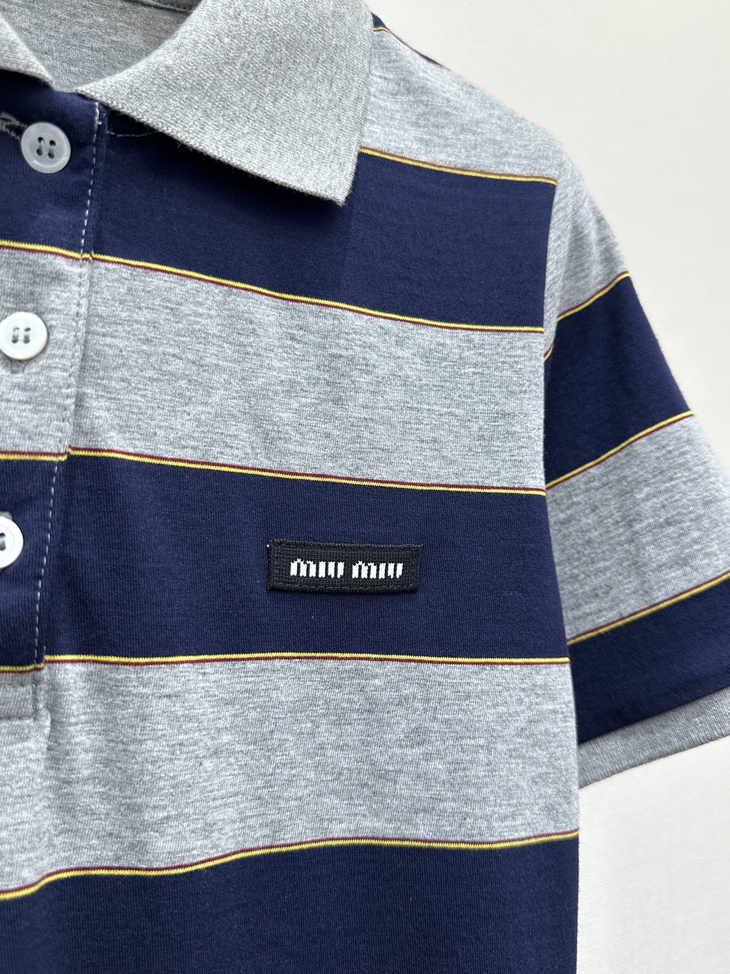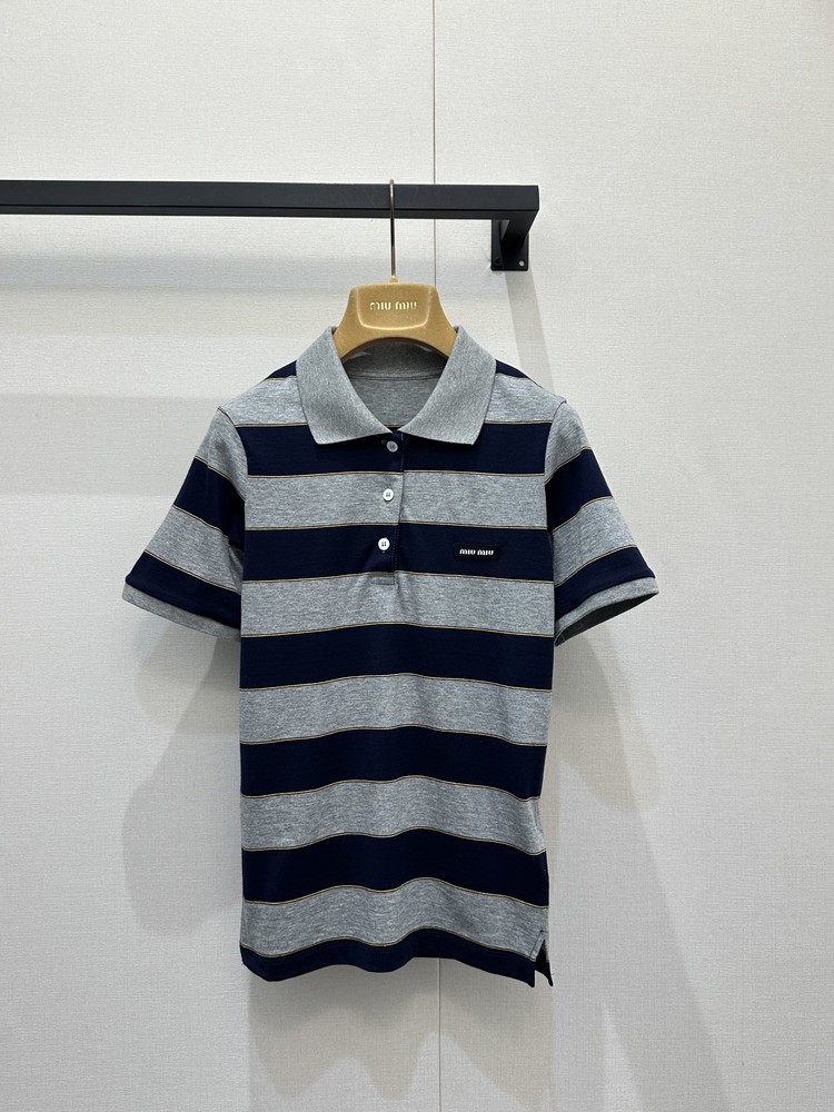 미우미우(MiuMiu) 네이비-그레이 스트라이프 폴로 카라 반팔 니트 티셔츠 의류SALE