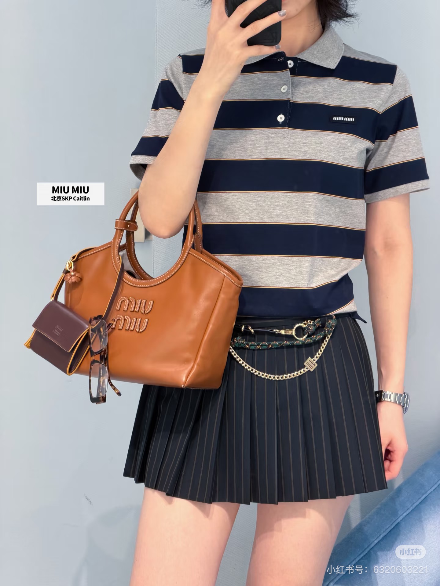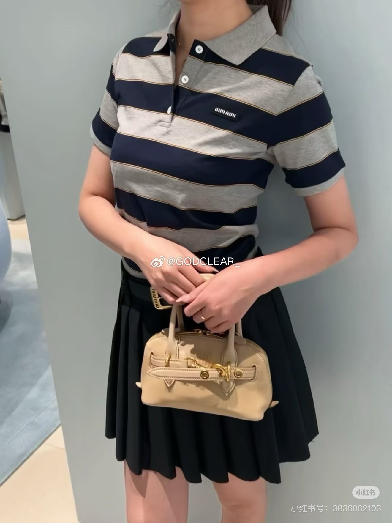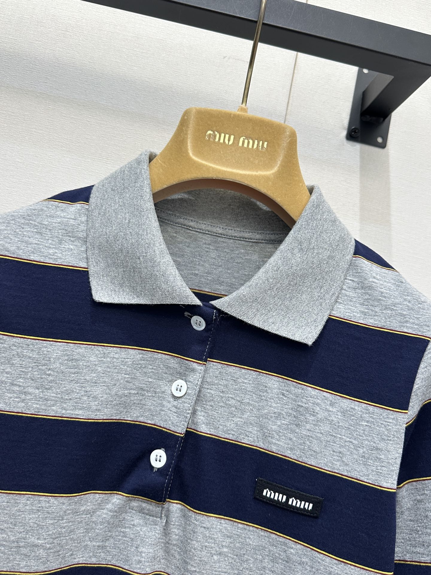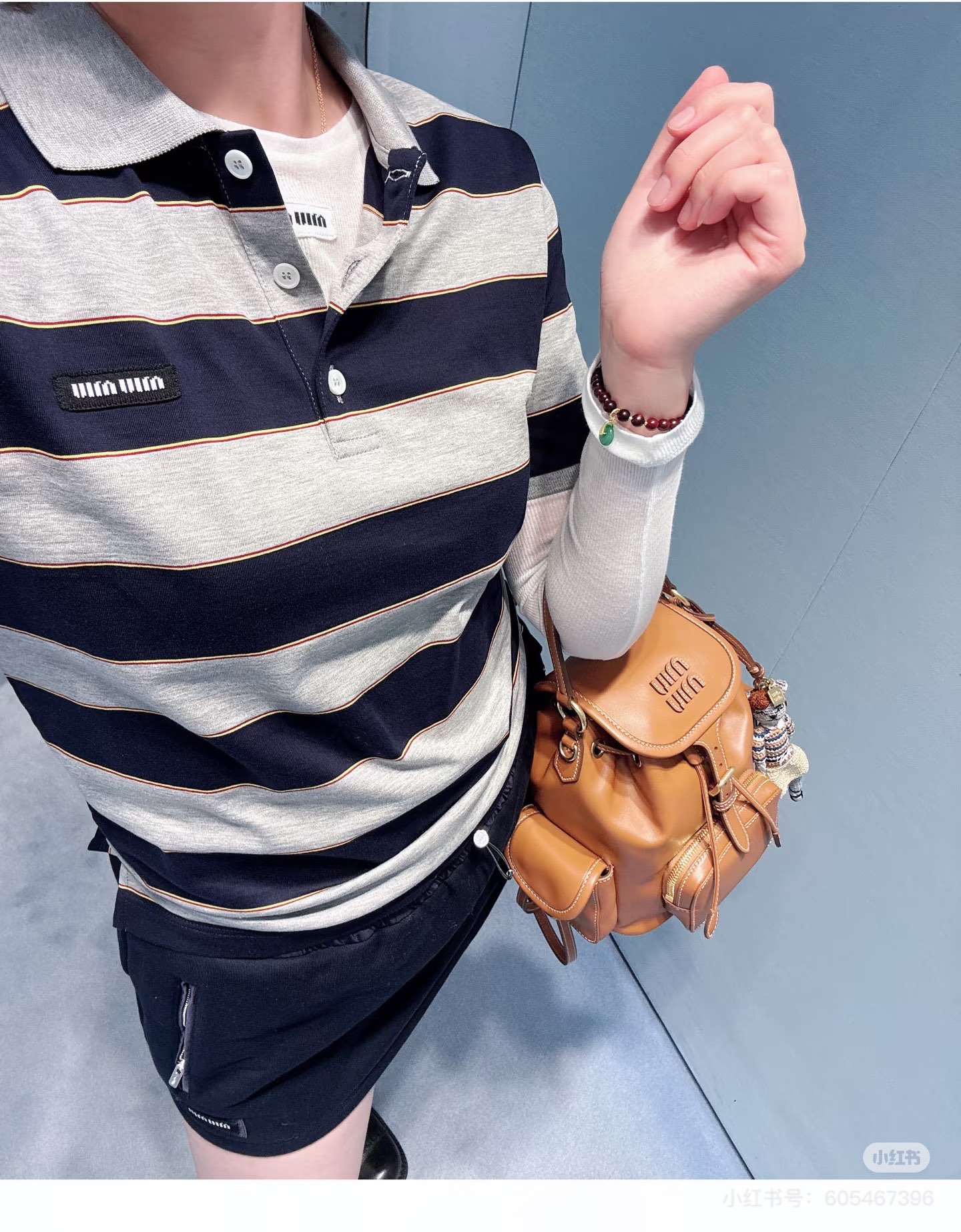 포인트: 가슴 부분의 미우미우 로고 디테일로 브랜드 아이덴티티를 살린 세련된 포인트
