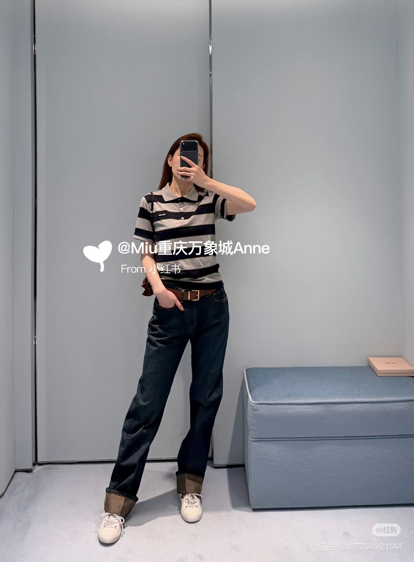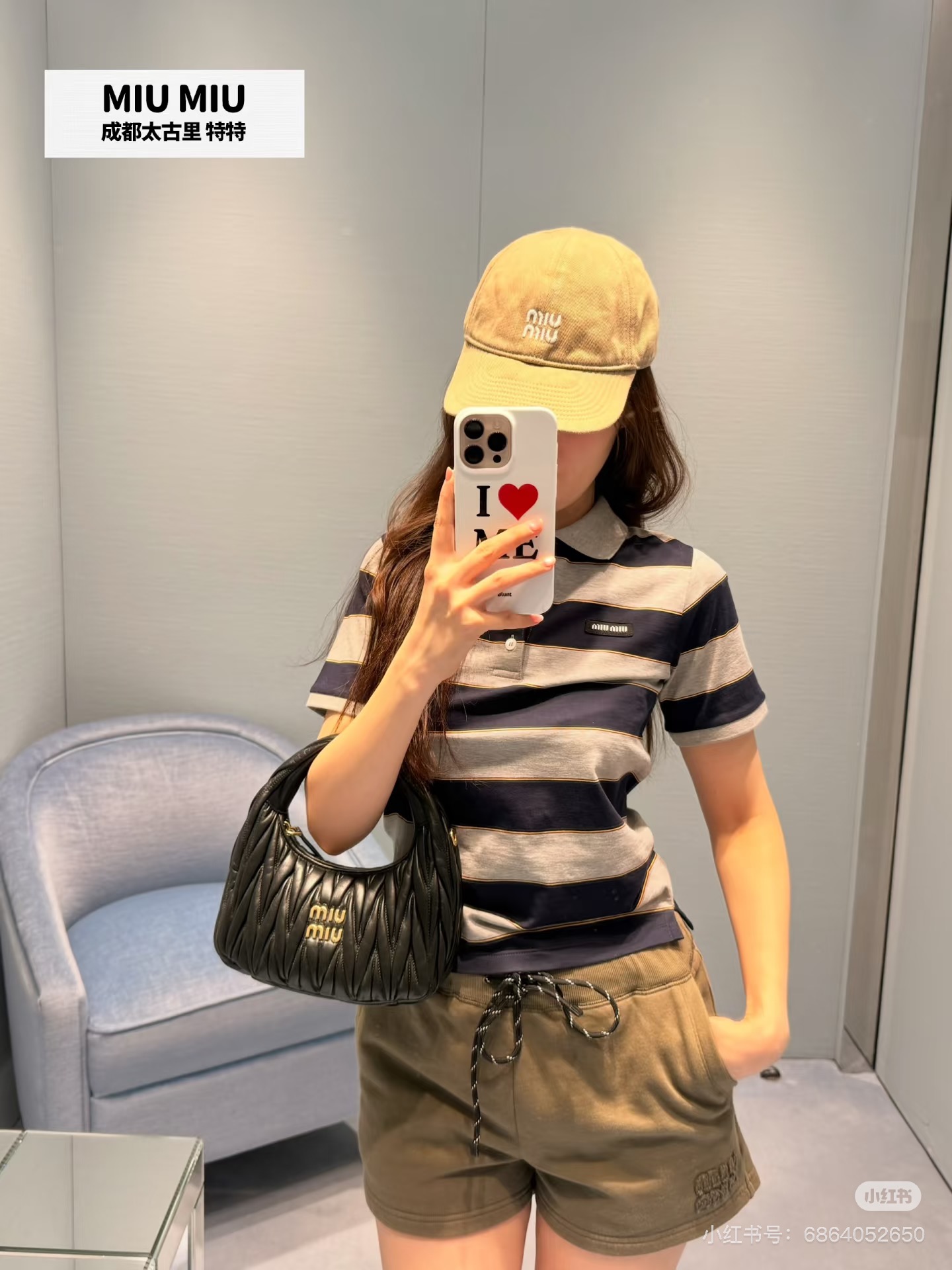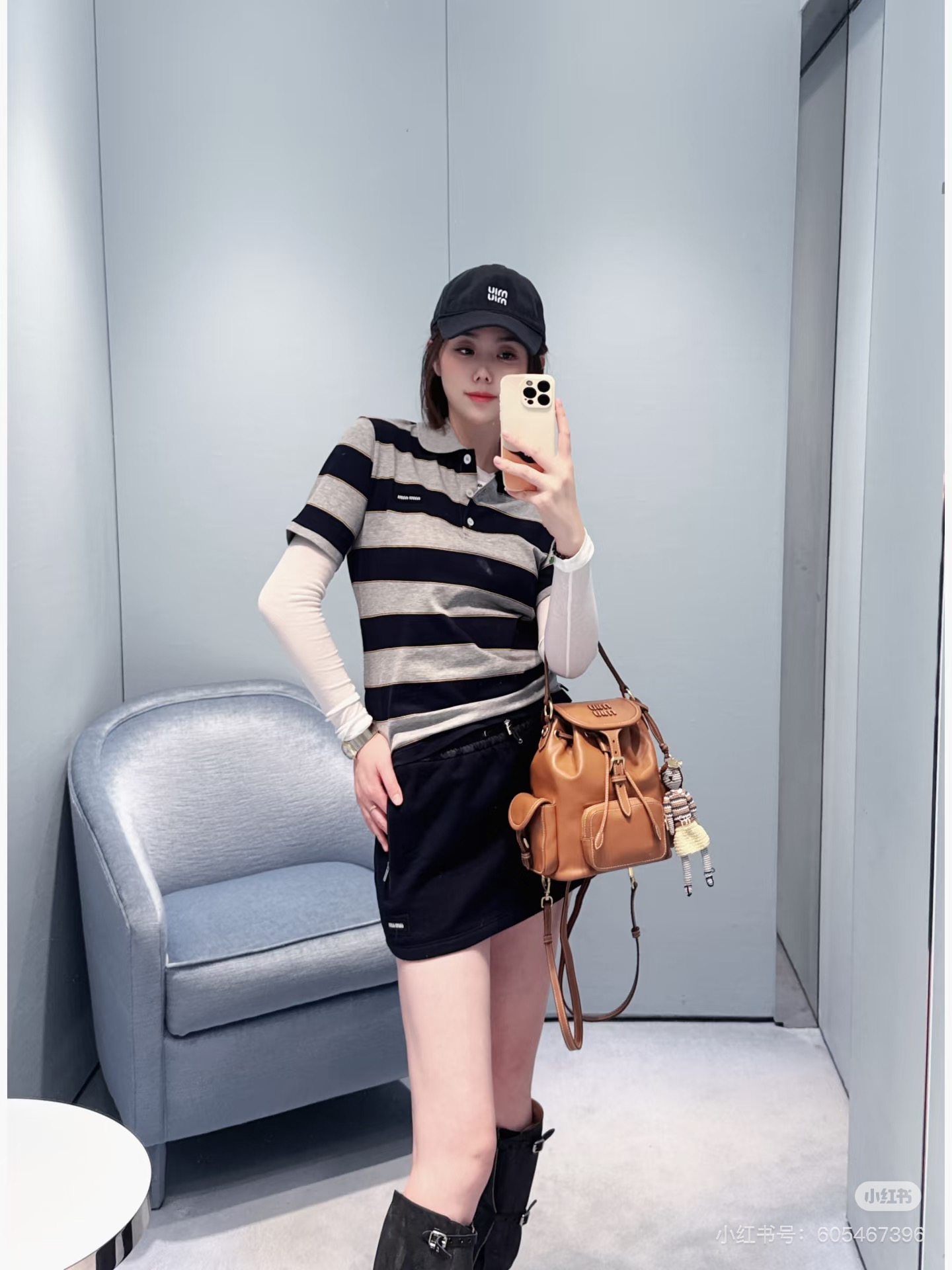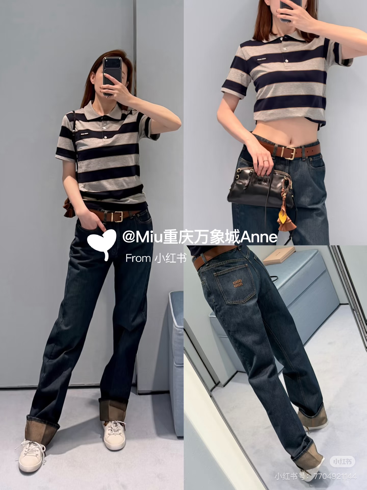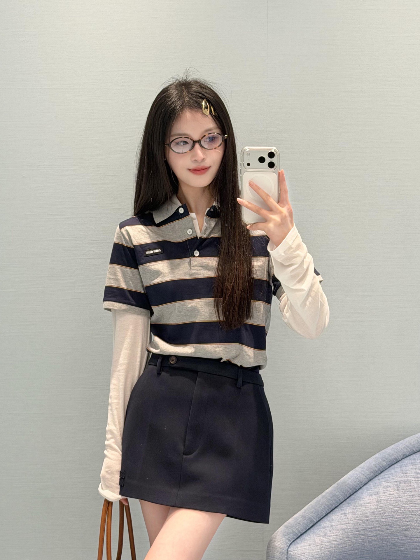 포인트: 가슴 부분의 미우미우 로고 디테일로 브랜드 아이덴티티를 살린 세련된 포인트