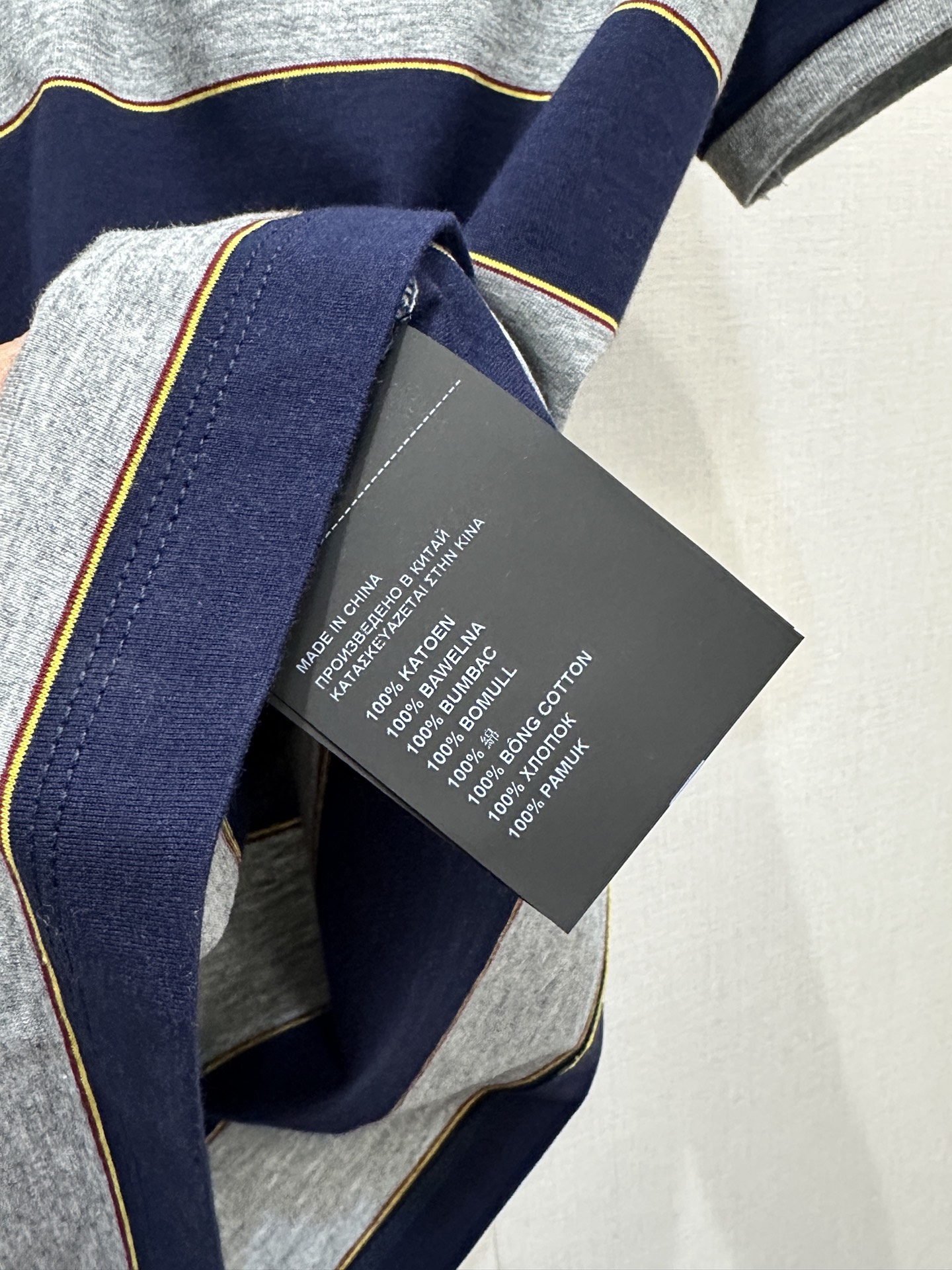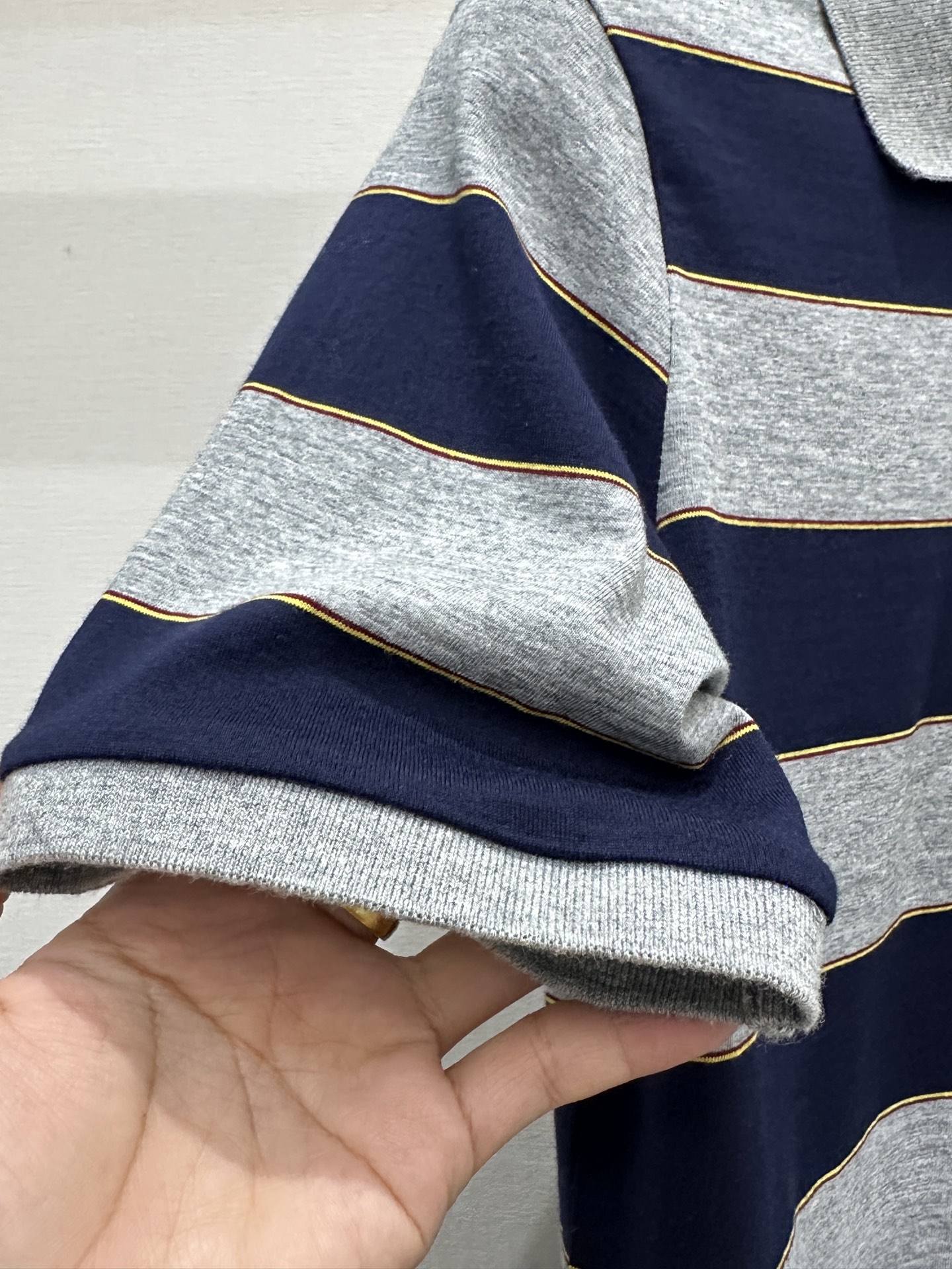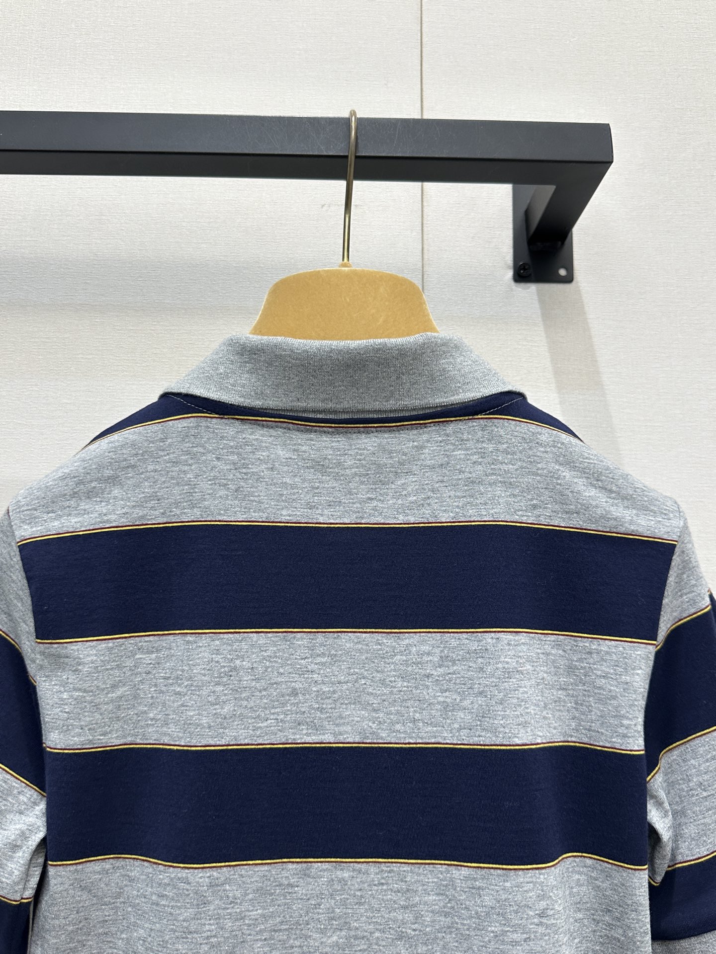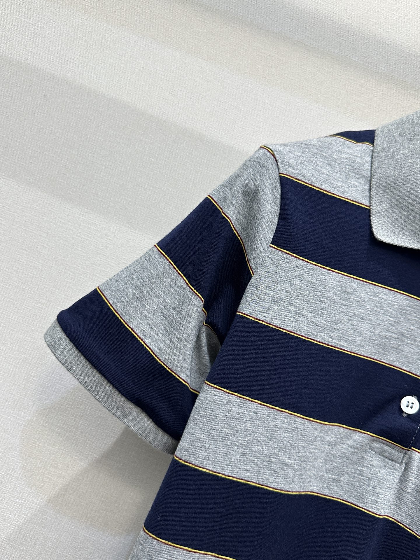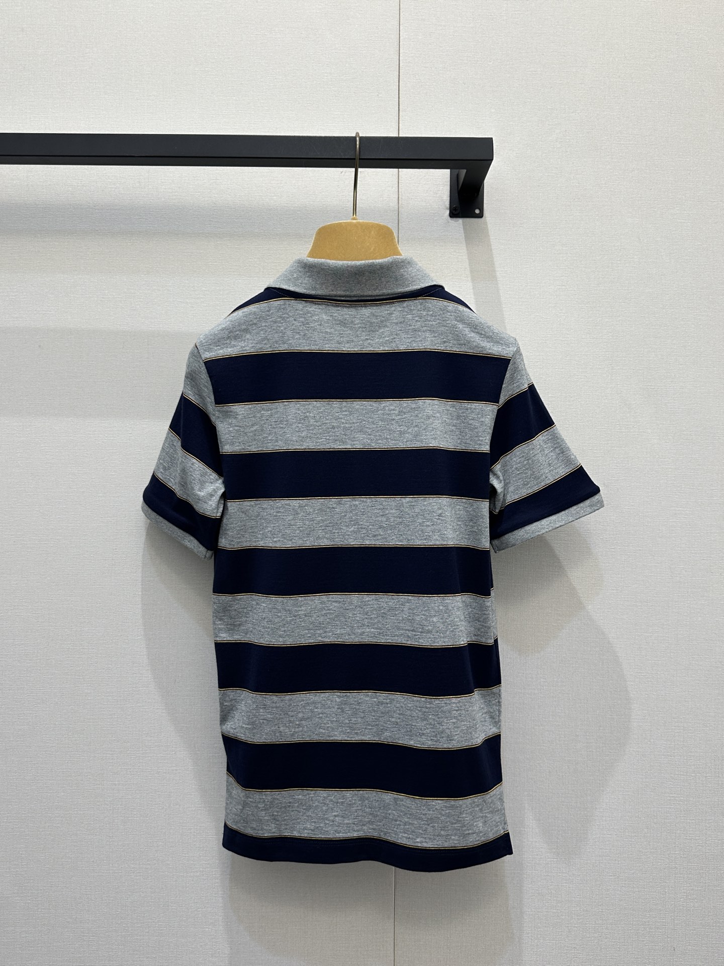 디자인: 클래식한 폴로 넥라인에 네이비 & 라이트 그레이 배색 스트라이프가 조화로운 고급스러운 디자인