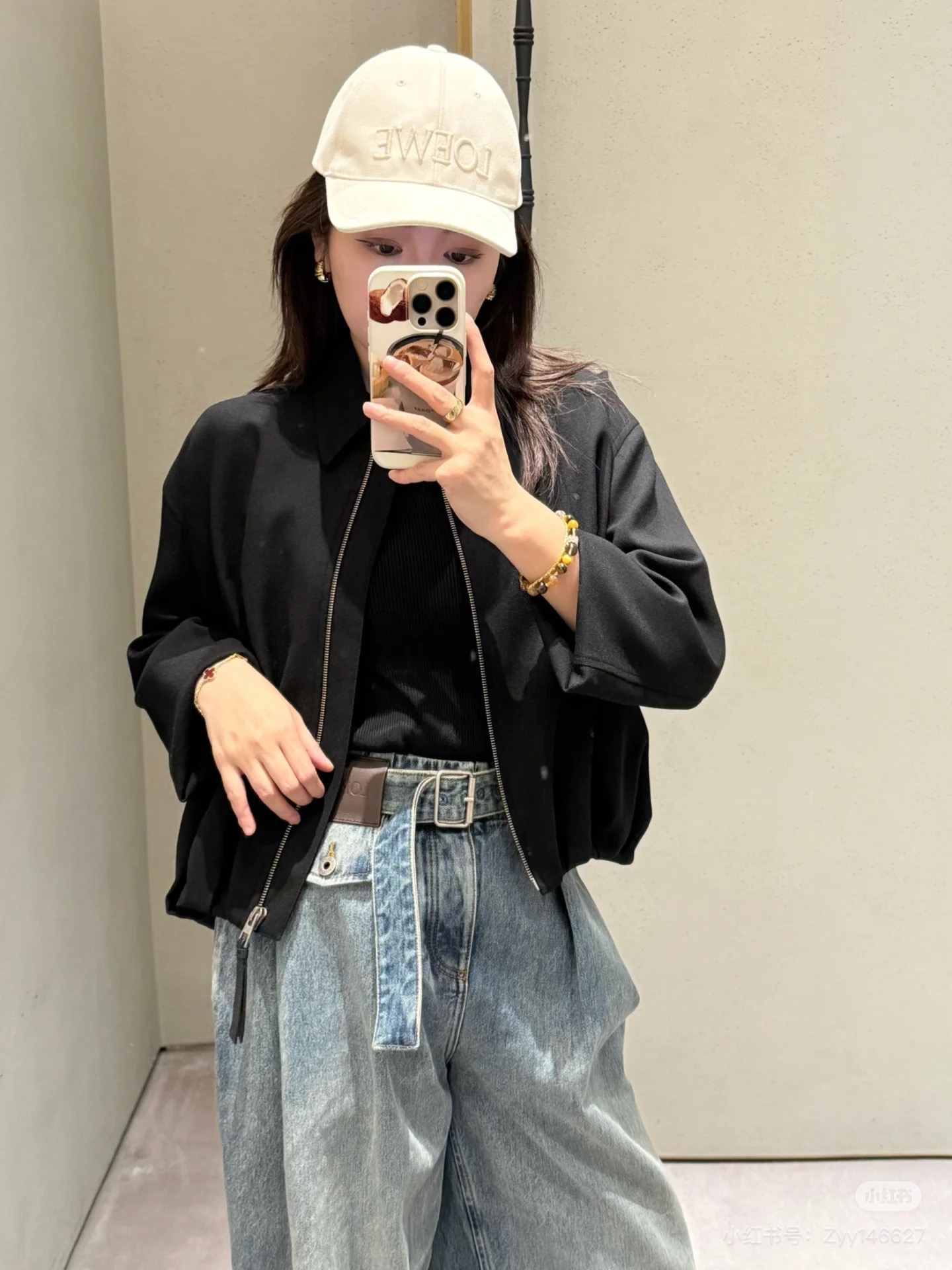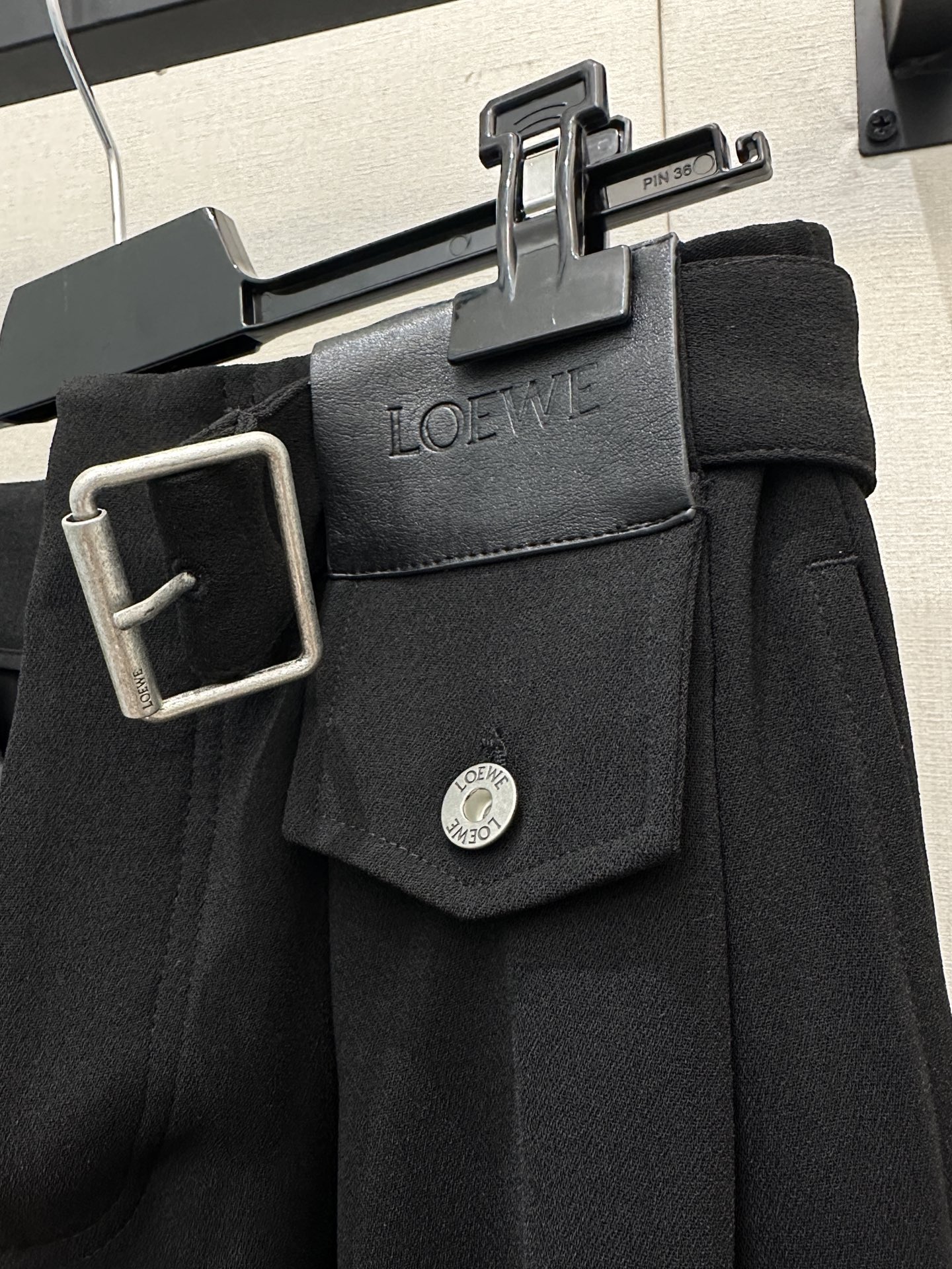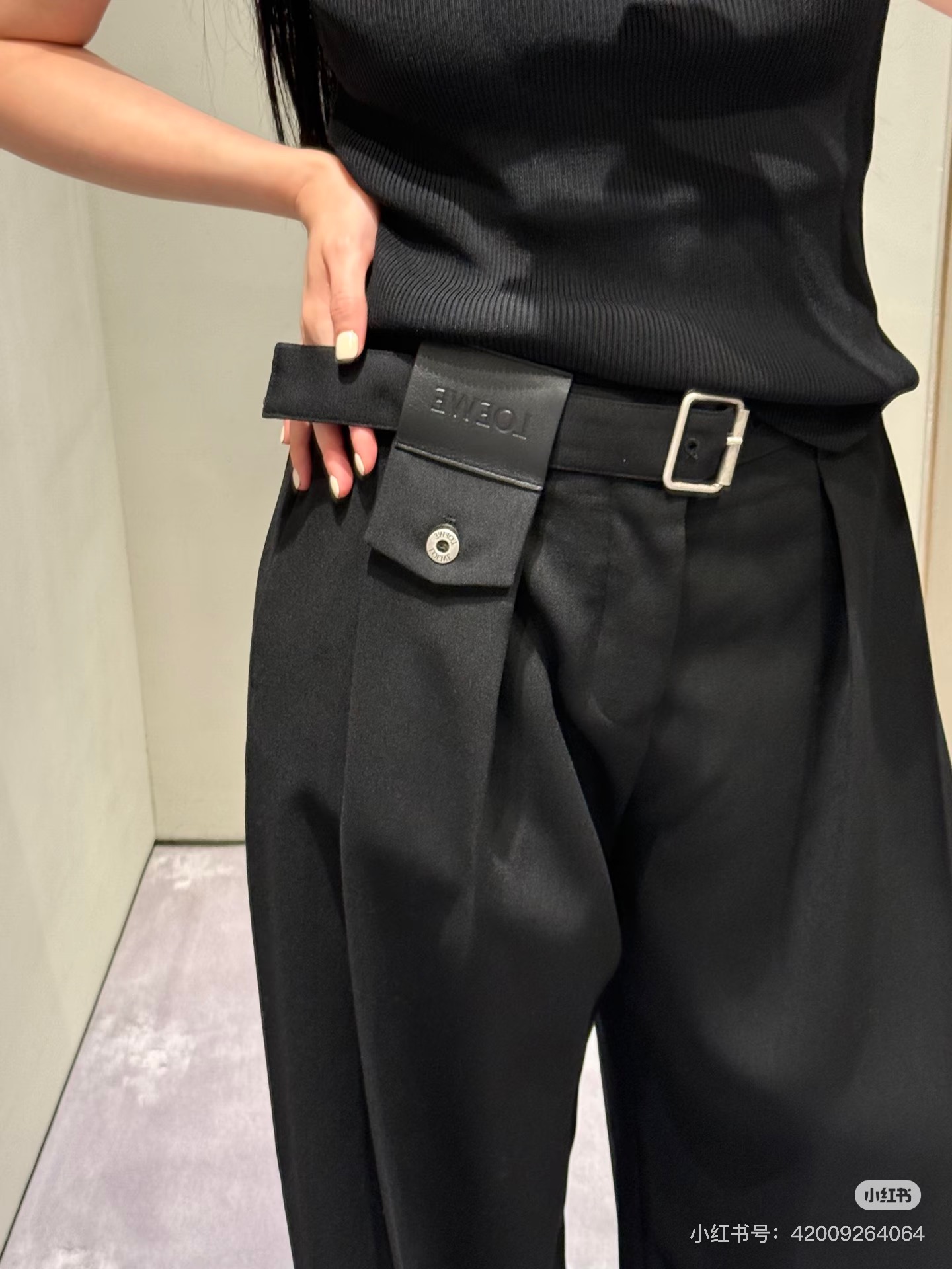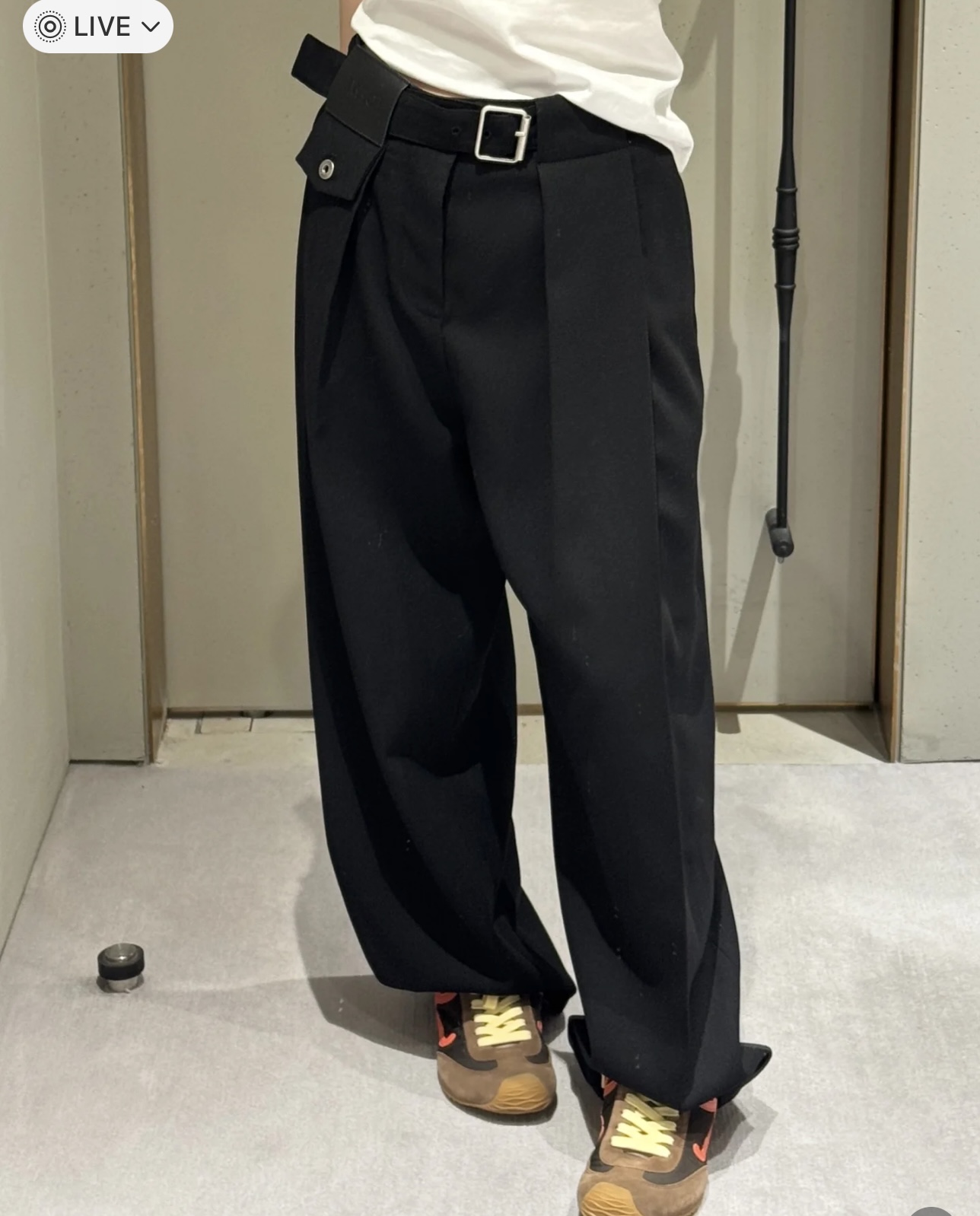 포인트: 동일 소재의 데님 벨트와 로에베 가죽 로고 패치 구성 (고급스러운 오리지널리티)